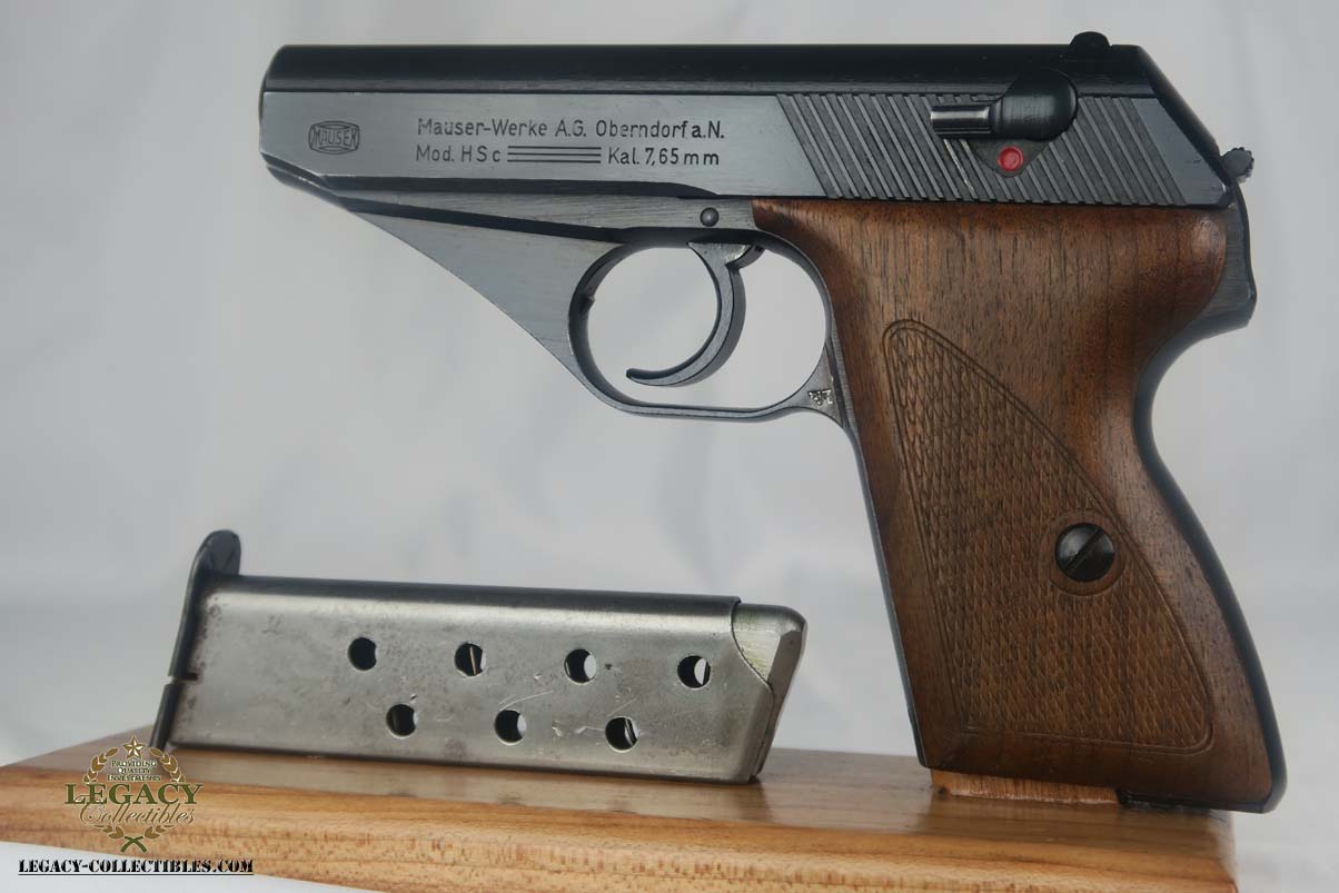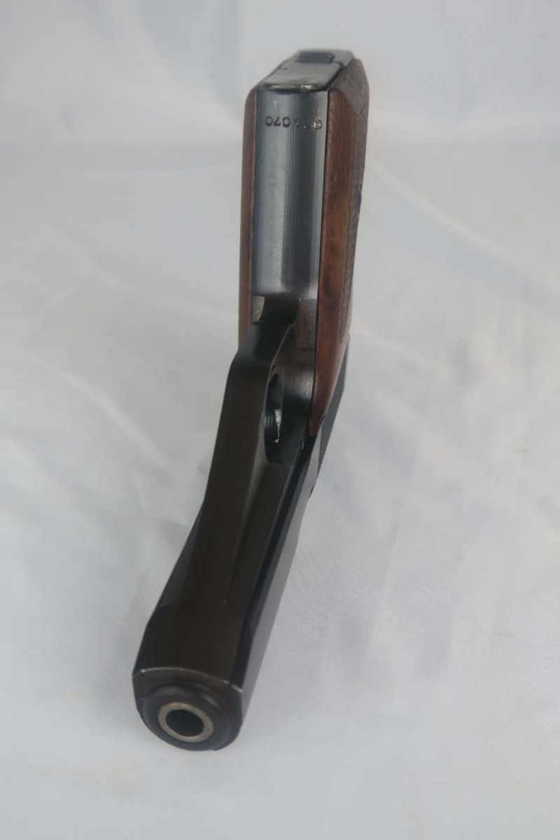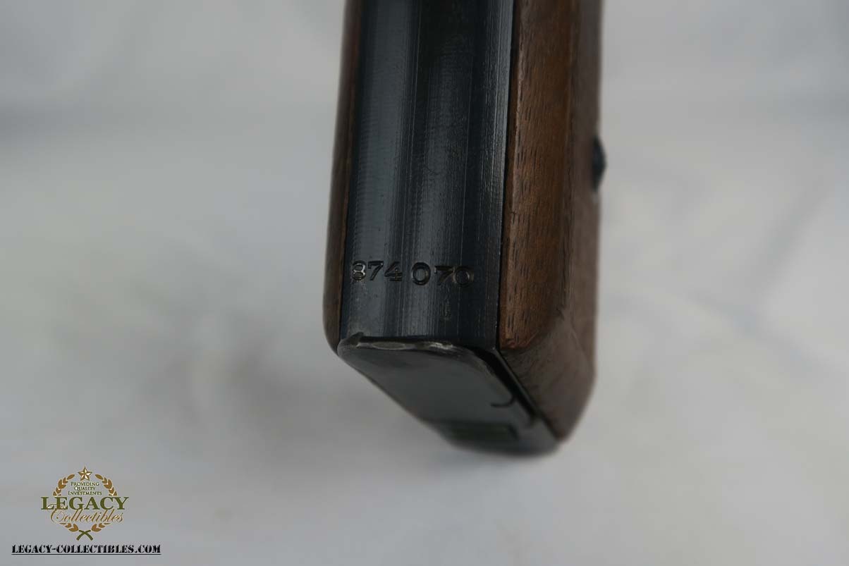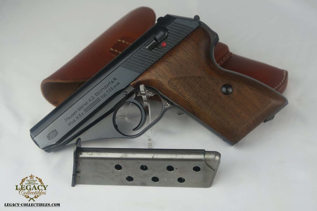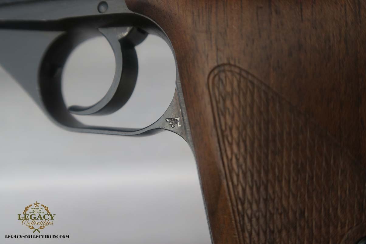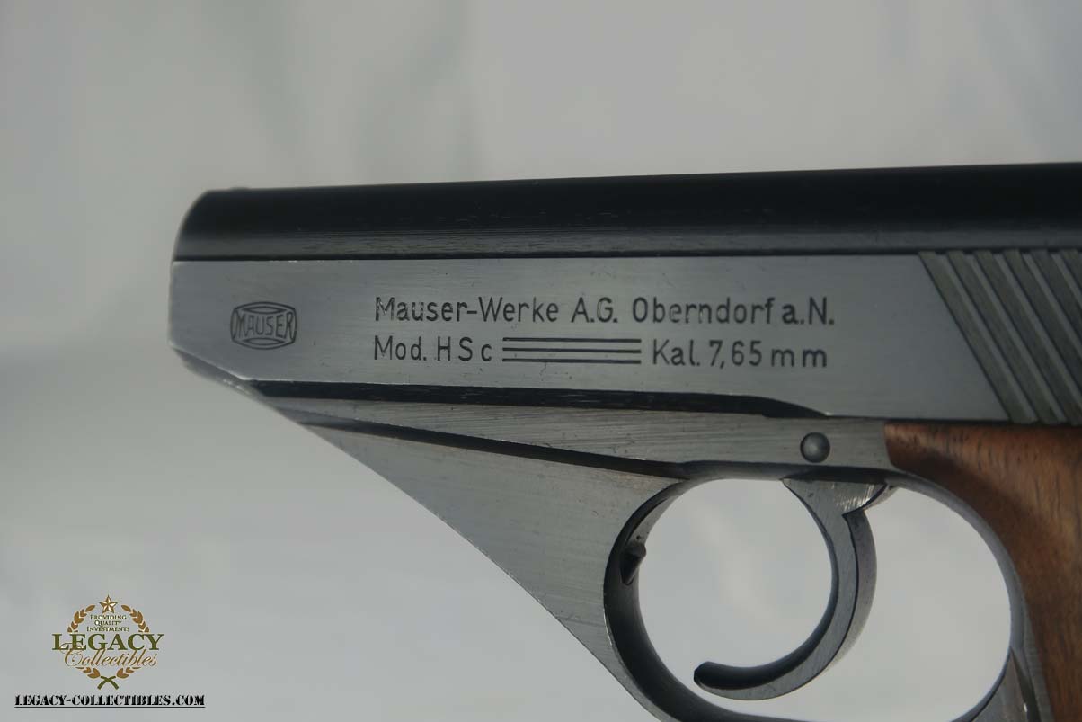 5/17/17 – This is a minty Police Eagle/L marked Mauser HSc, with a 1942 dated police holster that is in similarly excellent condition. The original finish on the pistol rates at about 99%, with very minor edge wear. This is a fairly scarce pistol, as there were only about 30,000 police-issued HSc’s during the war, compared to about 220,000 produced for all other wartime variations. This is a variation 2 police pistol, with military blue and Eagle/L proof on trigger guard. The grips are in very good shape, but the right panel does have the name “CISAR” scratched into it. The holster is dated and Berlin marked, and is in great condition. Blank-bottom magazine. Excellent bore.