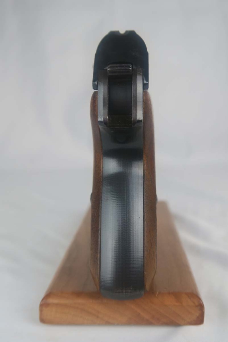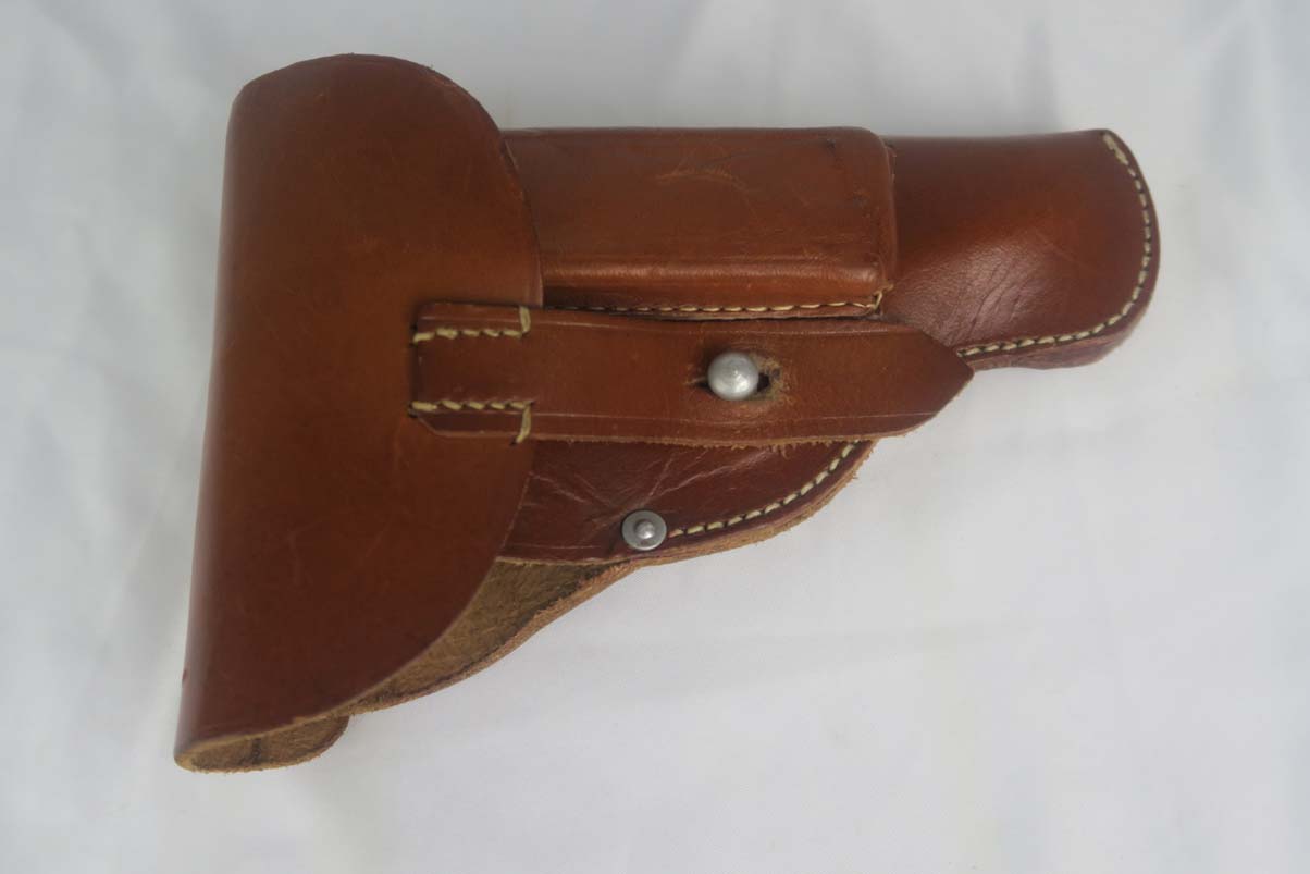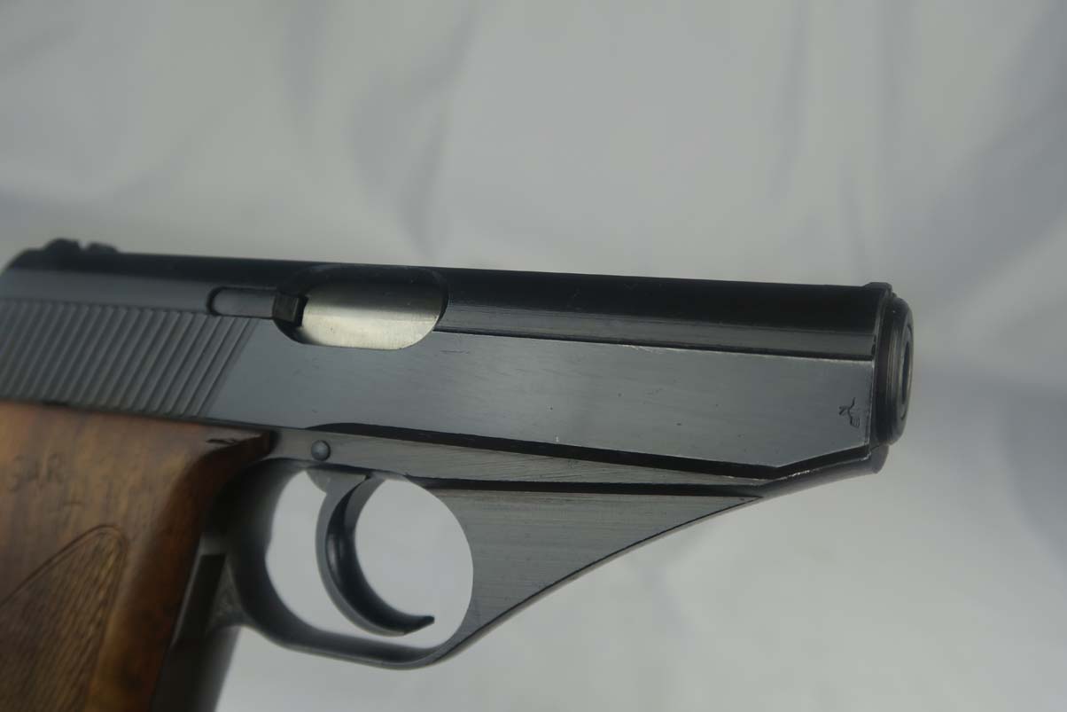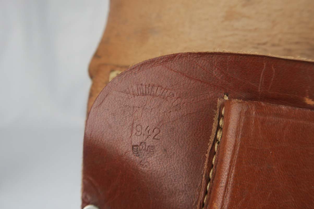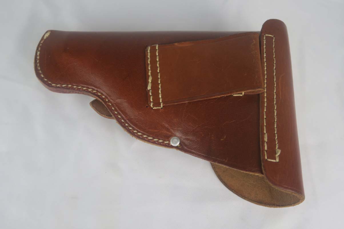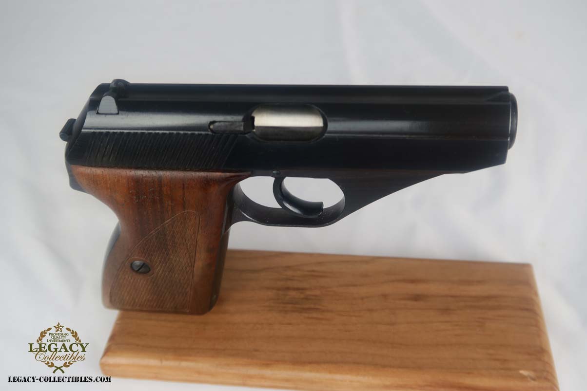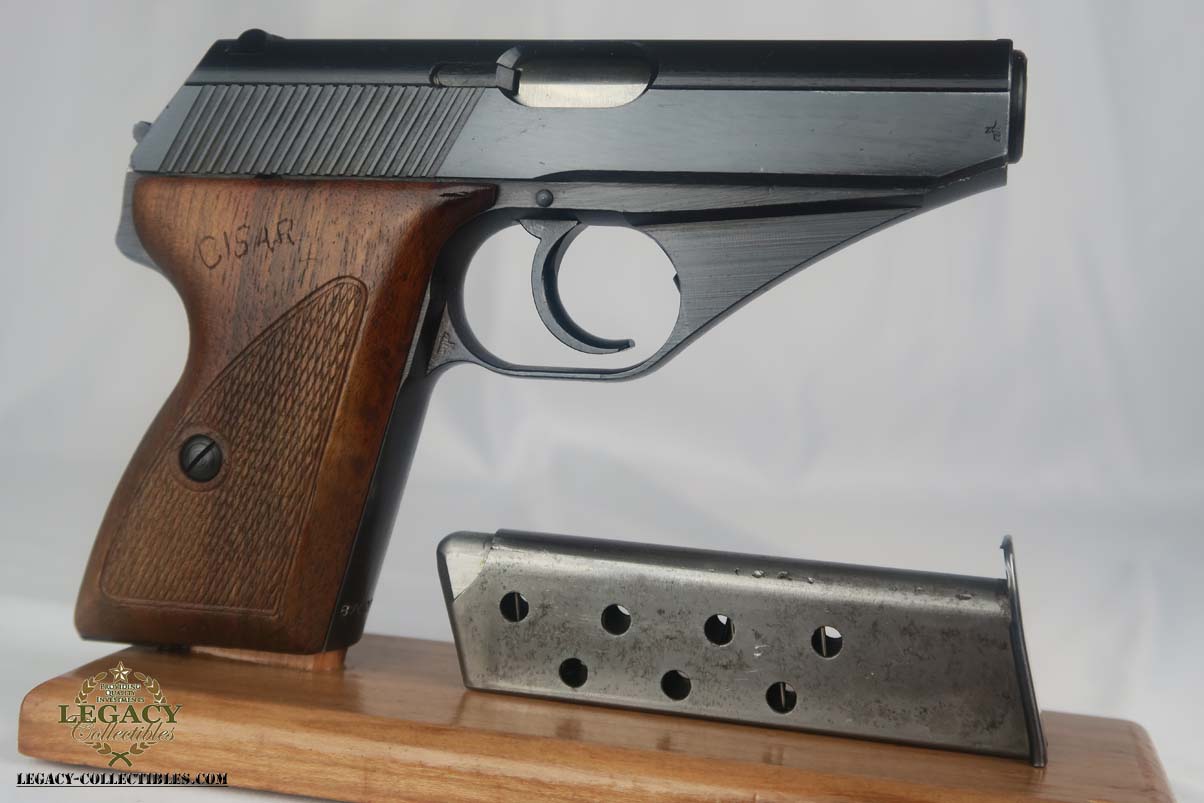 5/17/17 – This is a minty Police Eagle/L marked Mauser HSc, with a 1942 dated police holster that is in similarly excellent condition. The original finish on the pistol rates at about 99%, with very minor edge wear. This is a fairly scarce pistol, as there were only about 30,000 police-issued HSc’s during the war, compared to about 220,000 produced for all other wartime variations. This is a variation 2 police pistol, with military blue and Eagle/L proof on trigger guard. The grips are in very good shape, but the right panel does have the name “CISAR” scratched into it. The holster is dated and Berlin marked, and is in great condition. Blank-bottom magazine. Excellent bore.