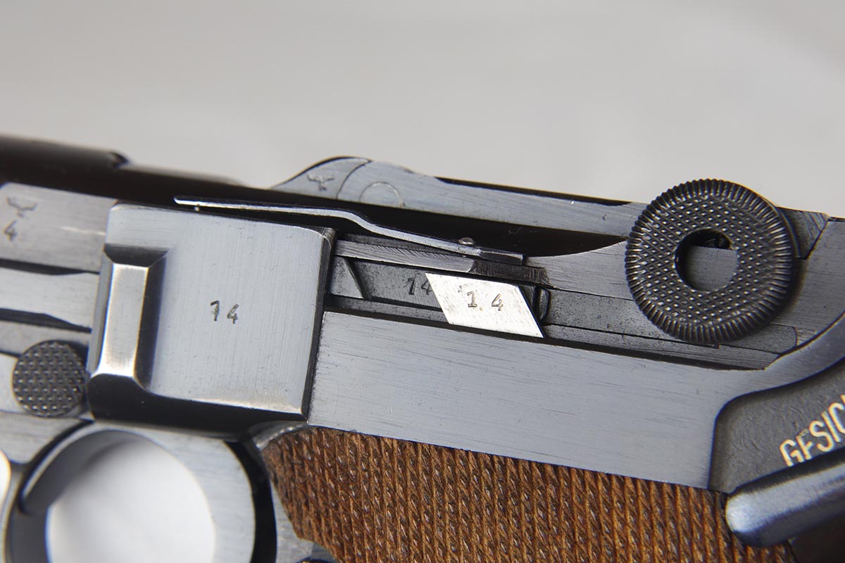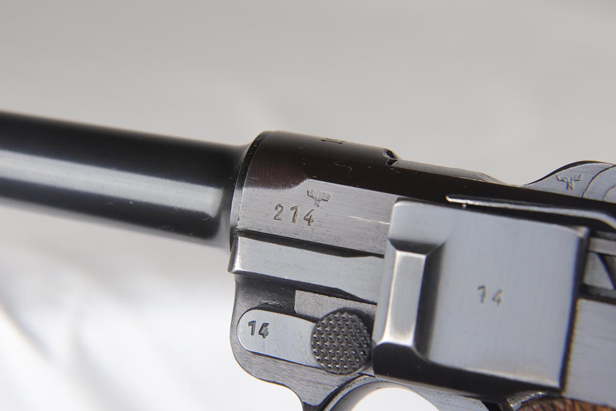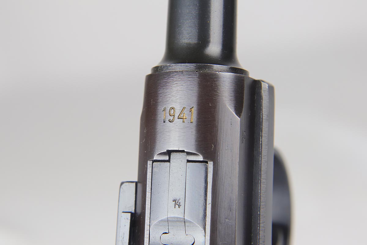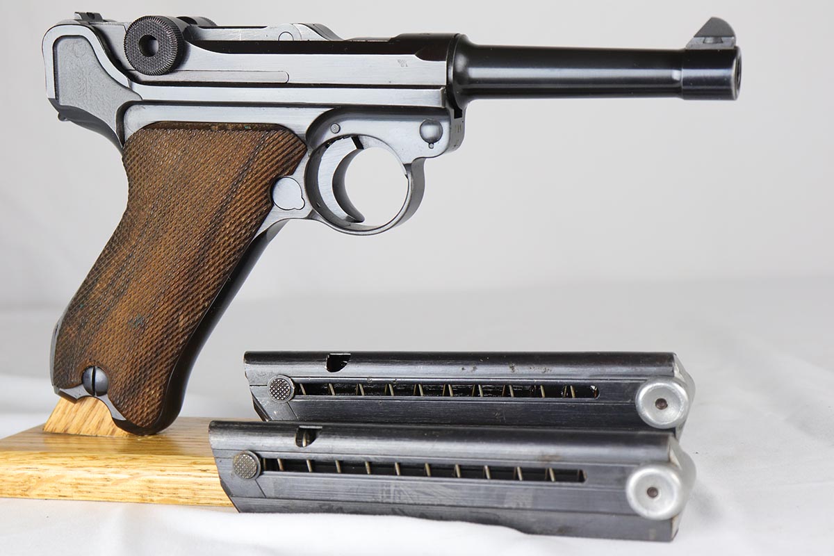 4/10/18 – This is a minty Mauser police luger rig from 1941, with both matching magazines, matching tool and excellent holster. The original finish rates at 98+% with only minor edge wear from the holster. The magazines are numbered 1 and 2 in the police style, and both are Eagle/L proofed (like the gun). Grips are not numbered but they are also Eagle/L stamped. The holster is police proofed and 1941 dated, in great original condition. Terrifc bore. This is a spectacular police rig taken directly from my collection – one that I purchased from Doug Smith about 10 years ago.