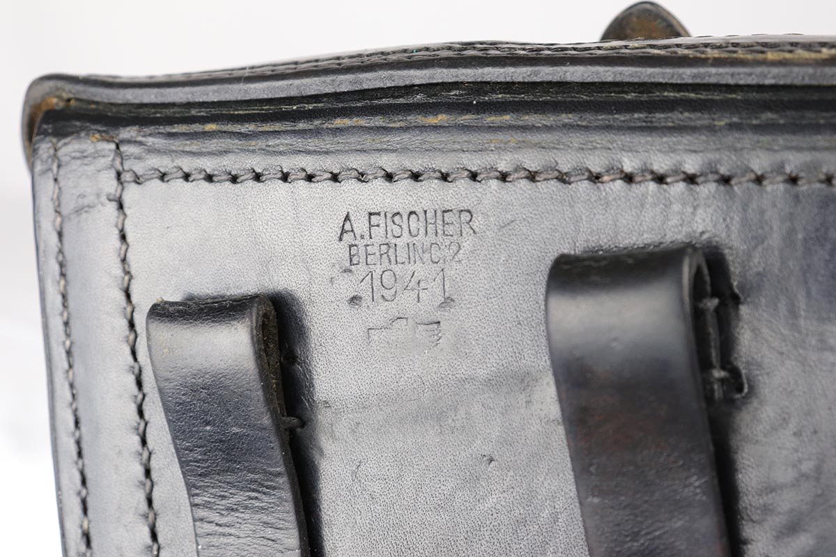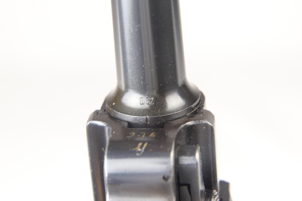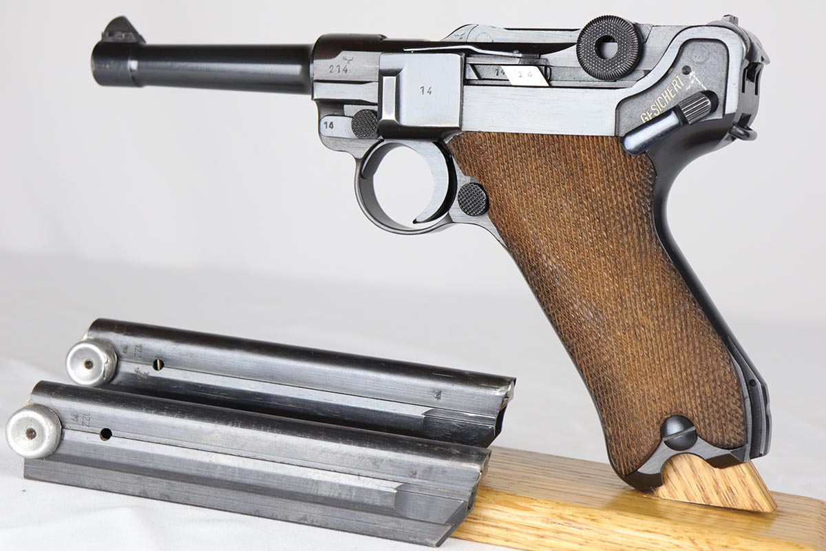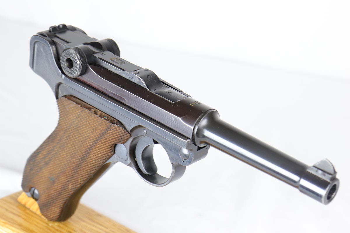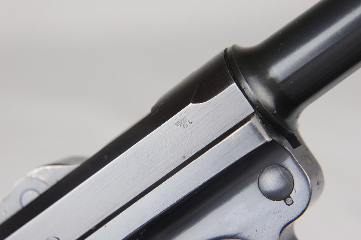 4/10/18 – This is a minty Mauser police luger rig from 1941, with both matching magazines, matching tool and excellent holster. The original finish rates at 98+% with only minor edge wear from the holster. The magazines are numbered 1 and 2 in the police style, and both are Eagle/L proofed (like the gun). Grips are not numbered but they are also Eagle/L stamped. The holster is police proofed and 1941 dated, in great original condition. Terrifc bore. This is a spectacular police rig taken directly from my collection – one that I purchased from Doug Smith about 10 years ago.