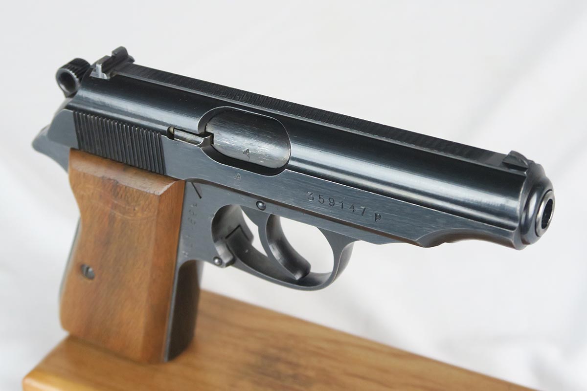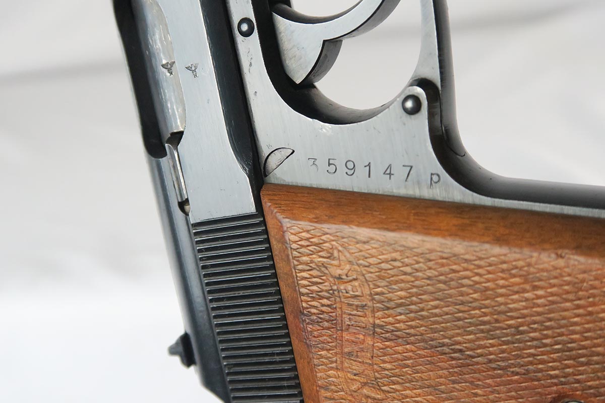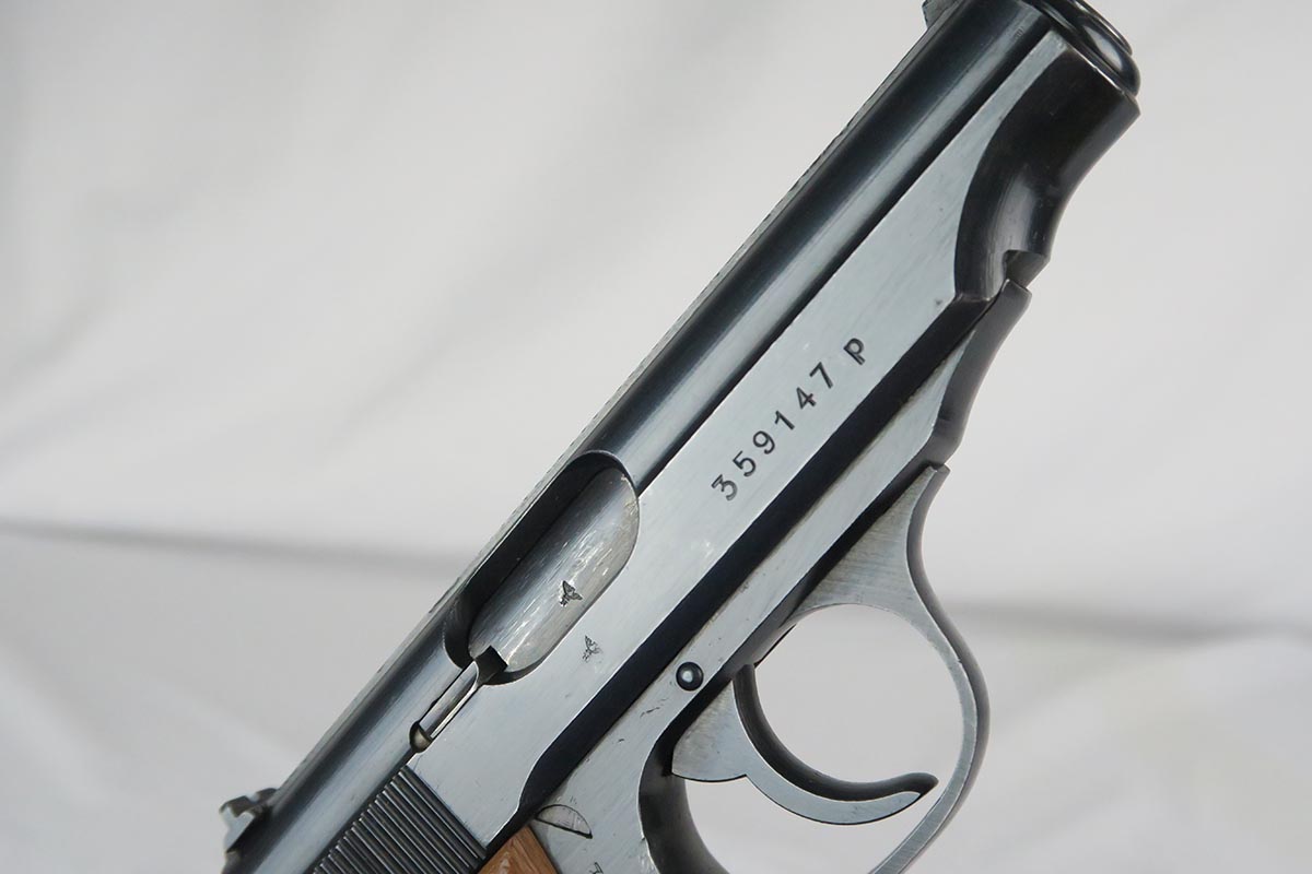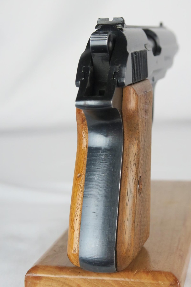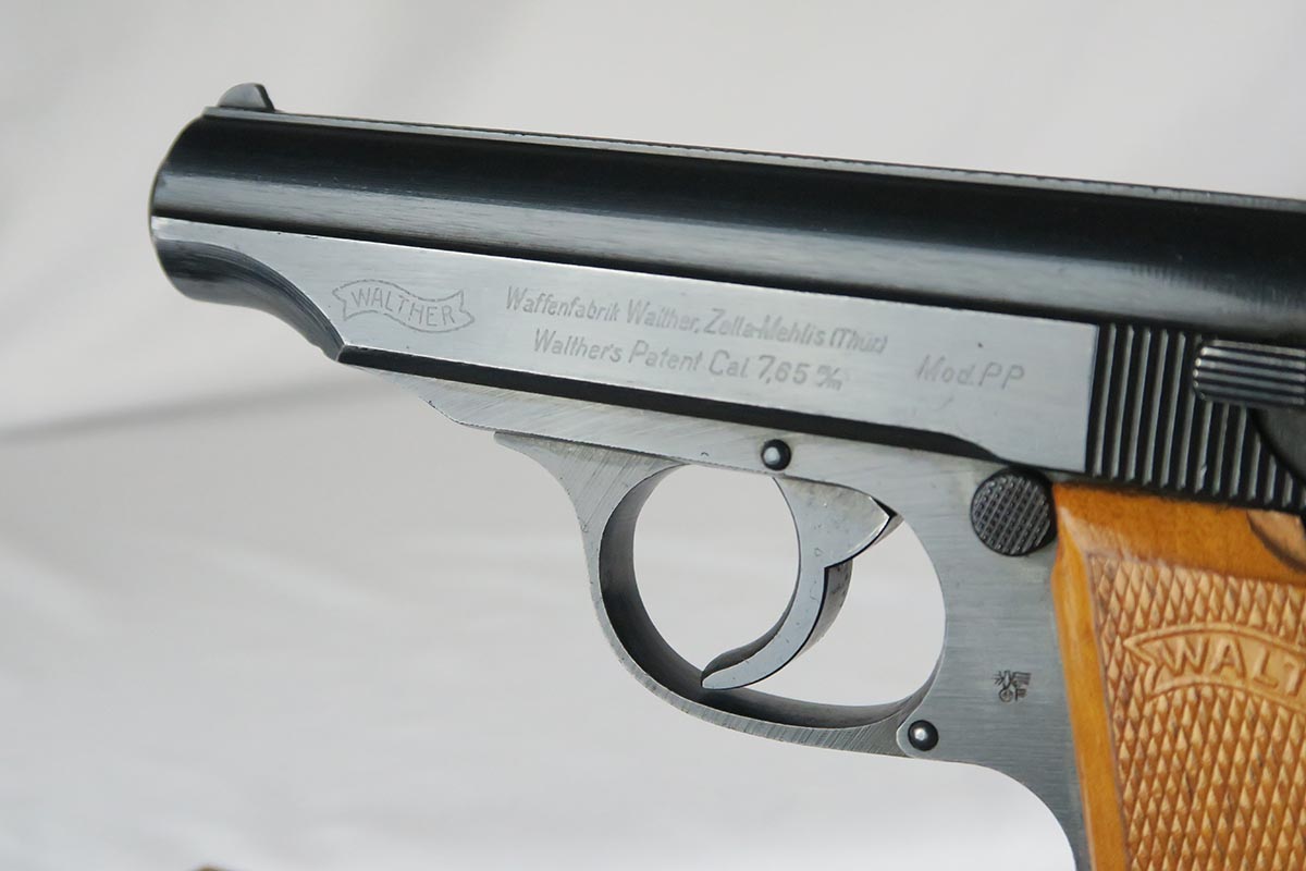 1/23/18 – This is a rare and nearly mint Walther PP that was issued to the German police during the war.  It is marked eagle over F on the left side frame, one of only five thousand of this variation produced.  The finish rates at 99% with minor muzzle wear.  All matching with beautiful straps and an excellent bore.  The only flaw on this pistol is a small chip in the left wood grip panel.  Wartime magazine is slightly stiff in the pistol but seems to function properly.