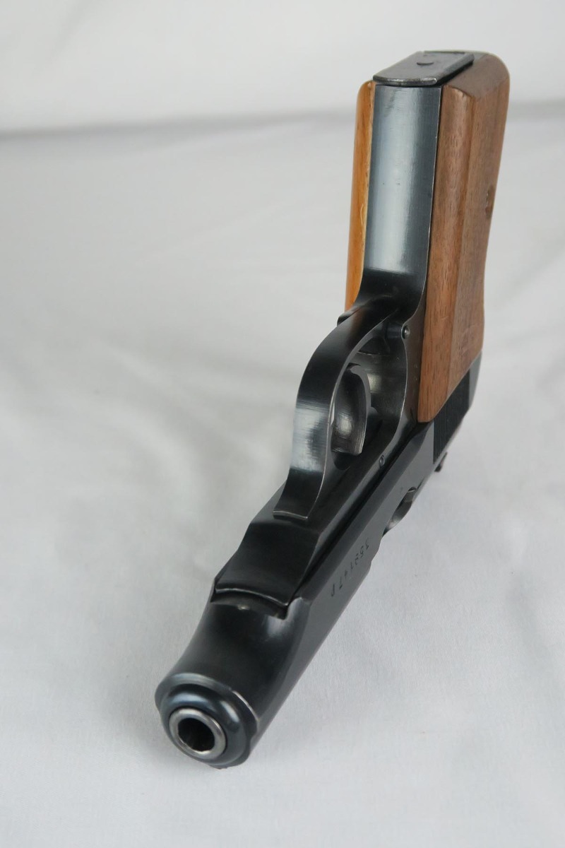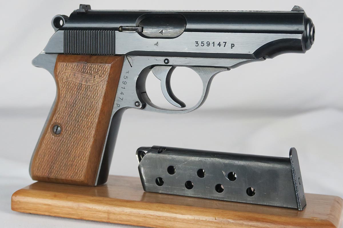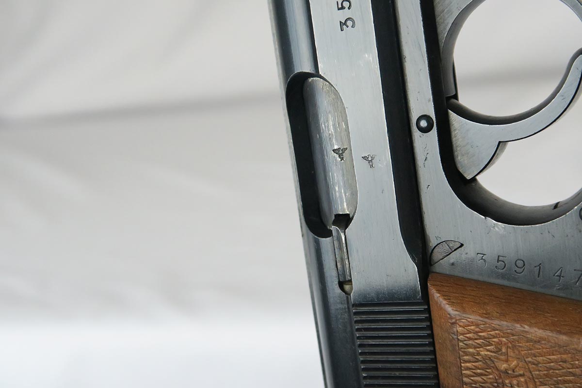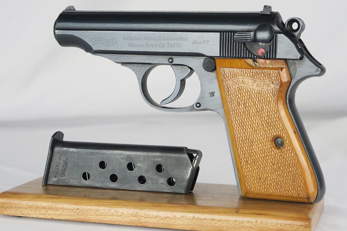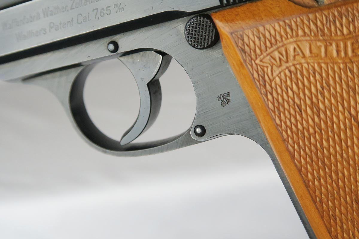 1/23/18 – This is a rare and nearly mint Walther PP that was issued to the German police during the war.  It is marked eagle over F on the left side frame, one of only five thousand of this variation produced.  The finish rates at 99% with minor muzzle wear.  All matching with beautiful straps and an excellent bore.  The only flaw on this pistol is a small chip in the left wood grip panel.  Wartime magazine is slightly stiff in the pistol but seems to function properly.