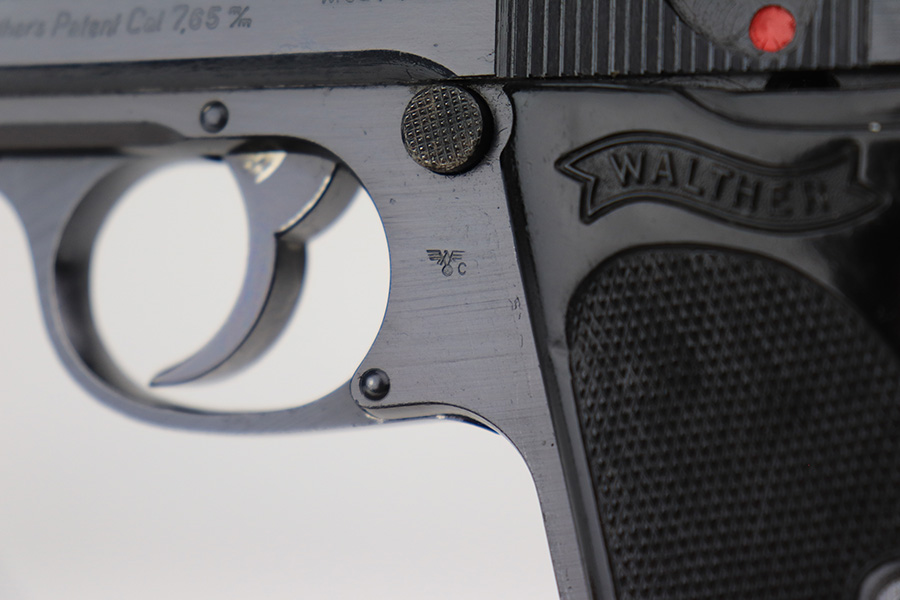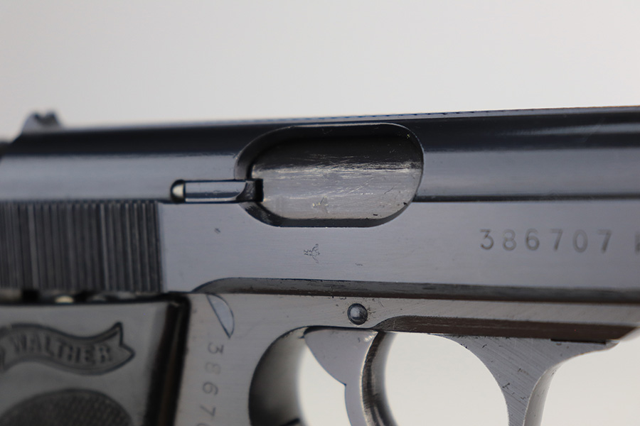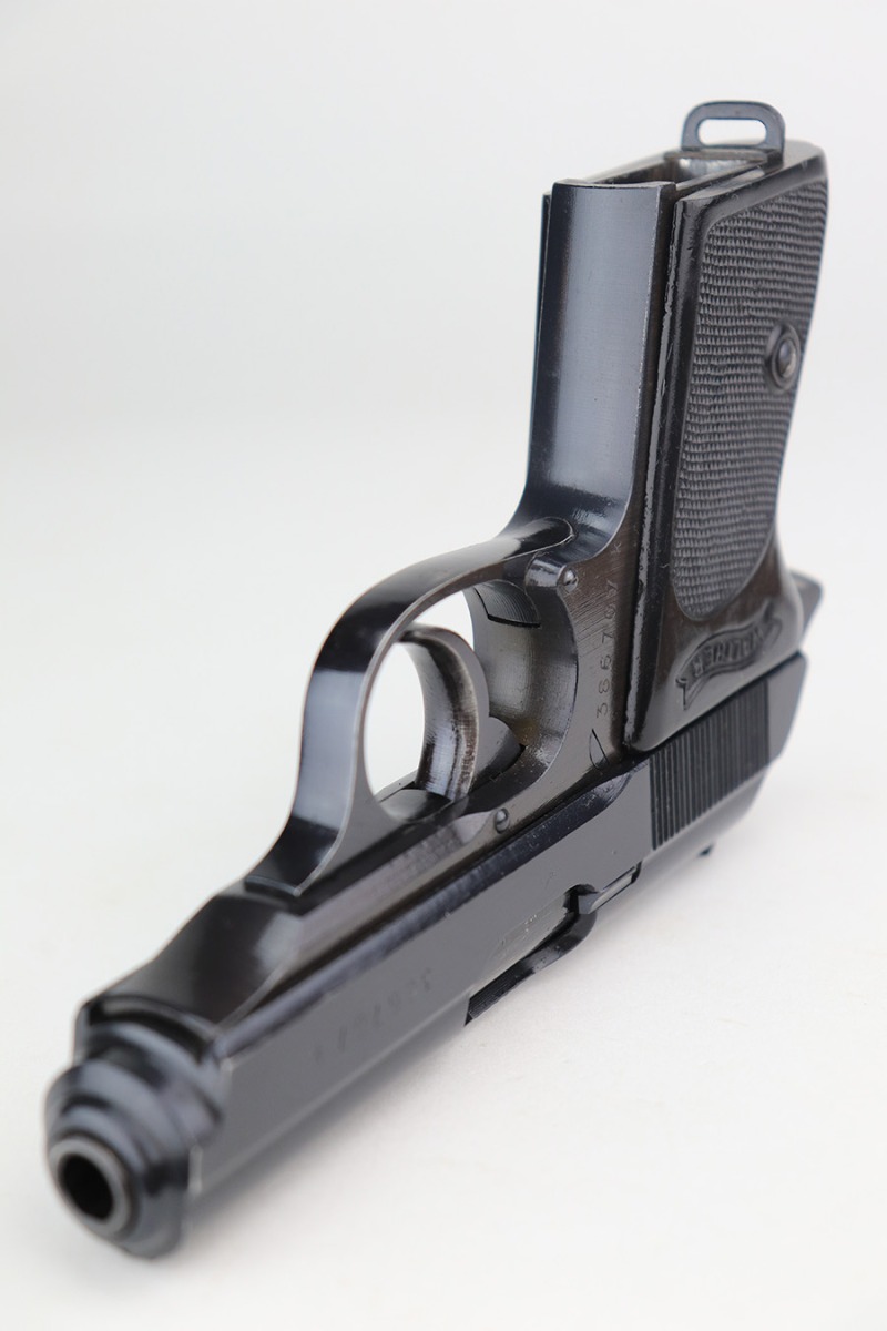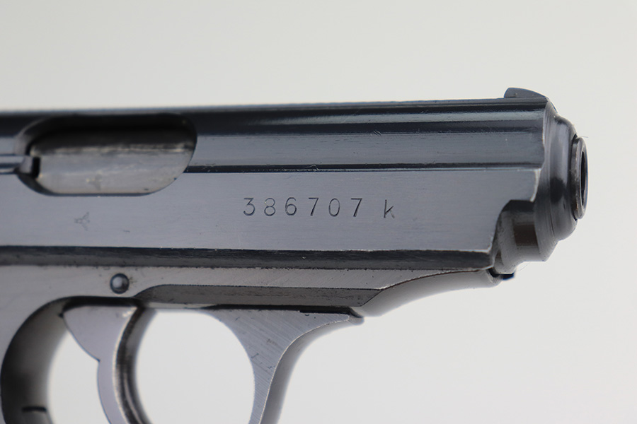 4/8/22 – This is a minty Walther PPK from 1943 that was issued to the German Police, and has Eagle/C acceptance proof on frame. It has 99% of the original blue with just a little muzzle wear. Minty bore. Wartime magazine. Excellent black grip with only minor handling wear, and no cracks.
