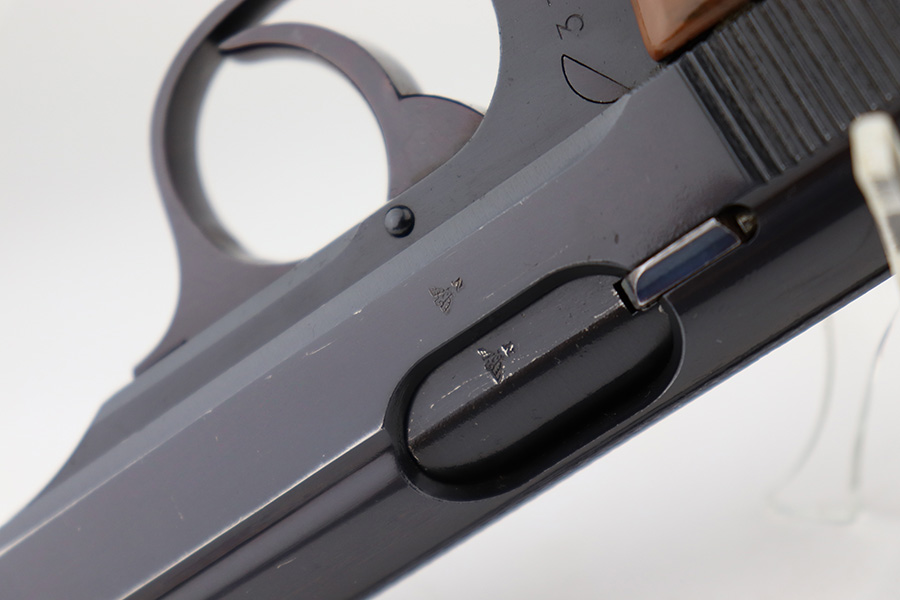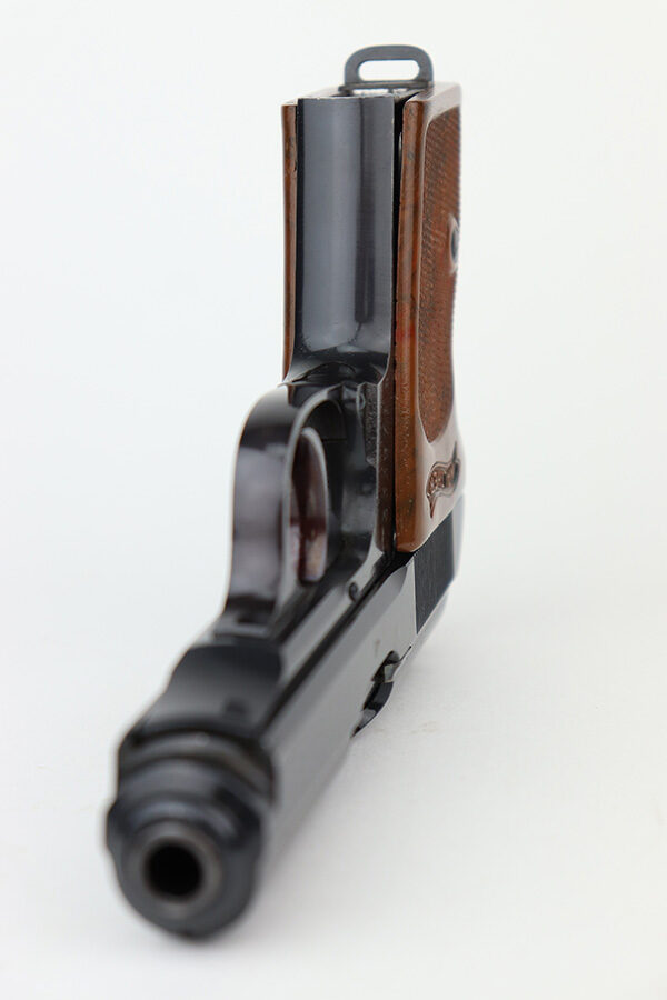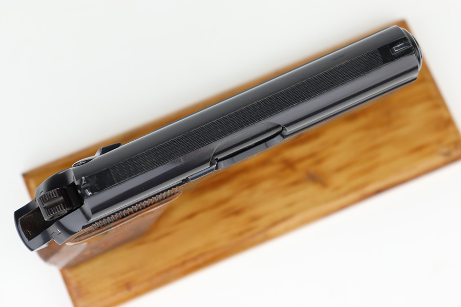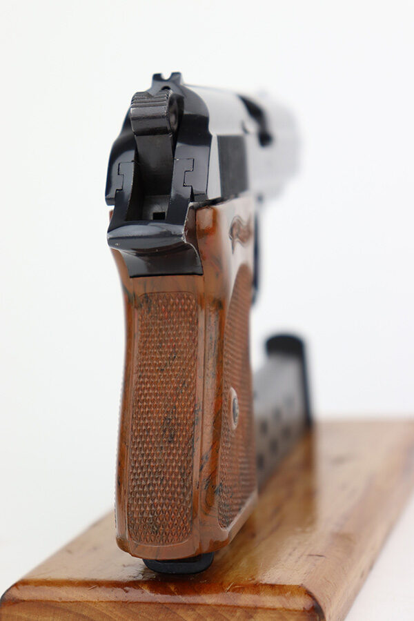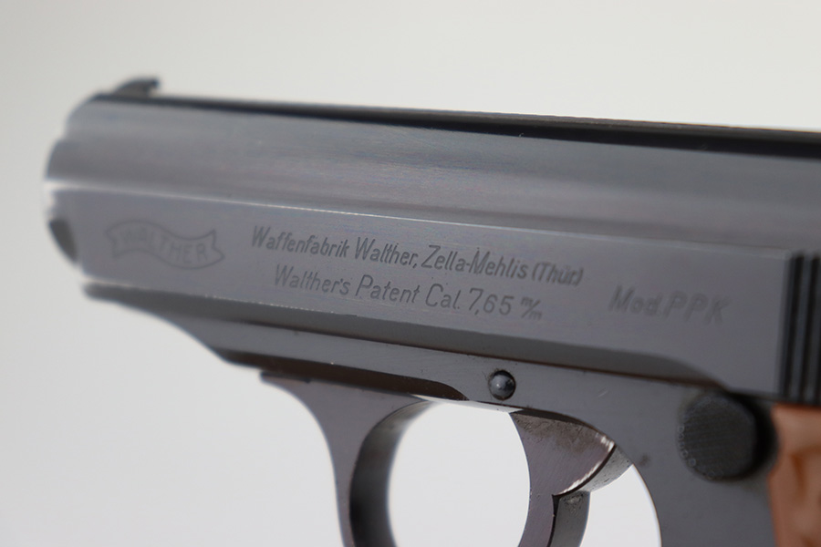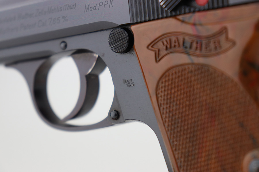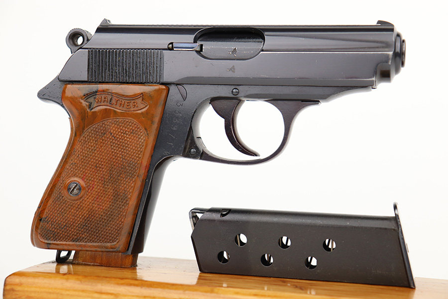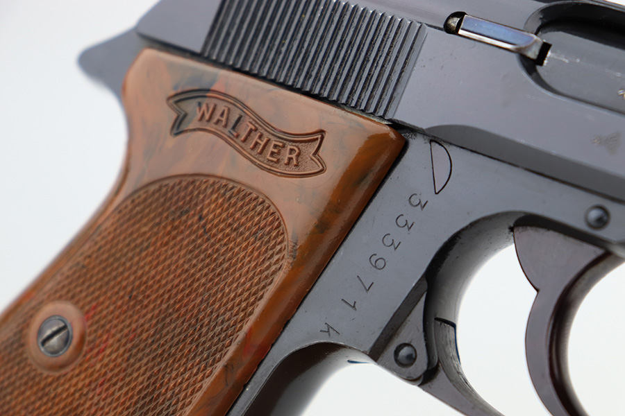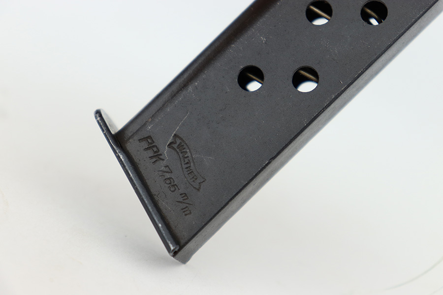 1/18/24 – This is a near-mint Walther PPK from World War II. Issued to the German Police in 1941 with Eagle/C inspection marking. The pistol has 98+% of the original, high-polish blue remaining. Just minor muzzle wear on each side of the slide, but otherwise minty. Beautiful bore, hardly looks used. Very nice grip with a few red swirls of color, and just a minuscule crack in the spine. Wartime magazine.