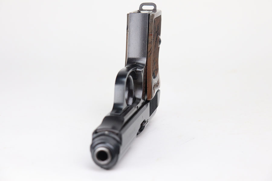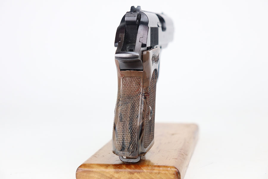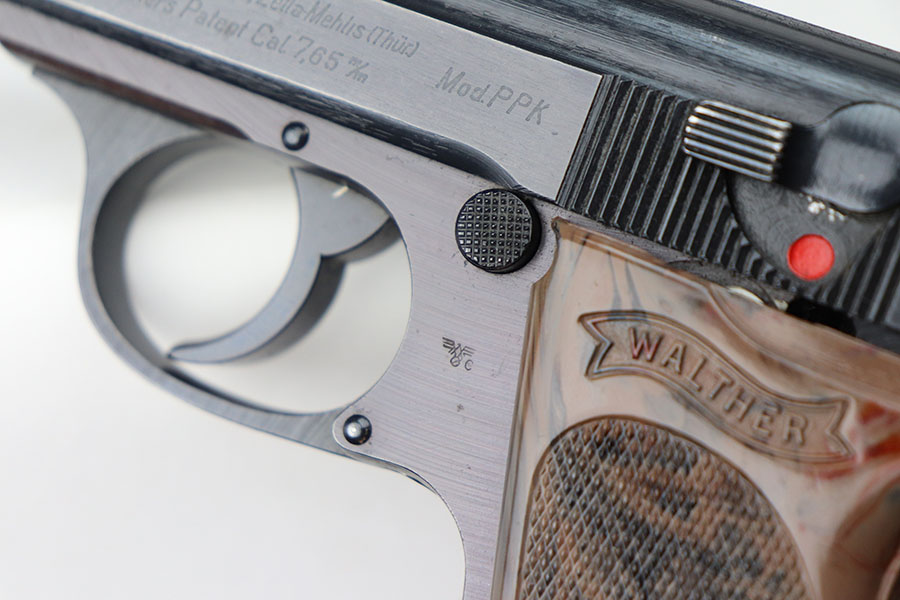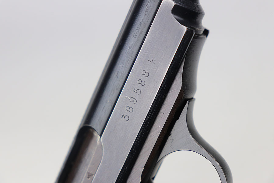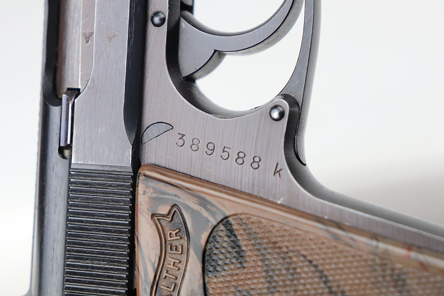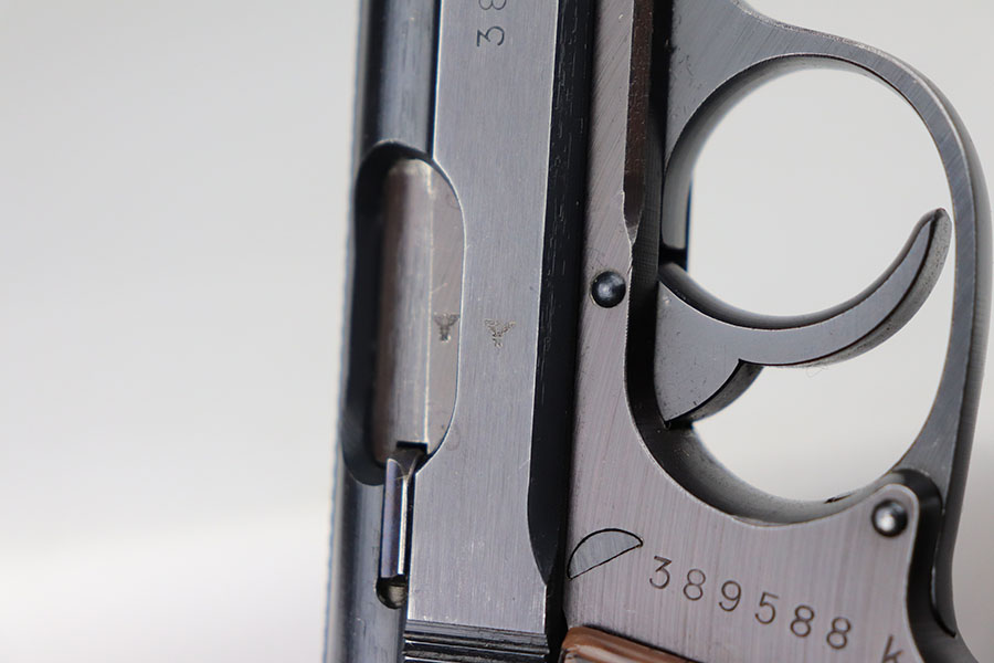 8/25/23 – This is a minty police Walther PPK from 1943 with gorgeous gray grip. Police Eagle/C proof on frame. The gun has just a hint of muzzle wear on the slide, but otherwise looks almost new. The grip has beautiful swirls of red and black through the gray, and only a small stress crack in the spine. Minty bore. Wartime magazine.