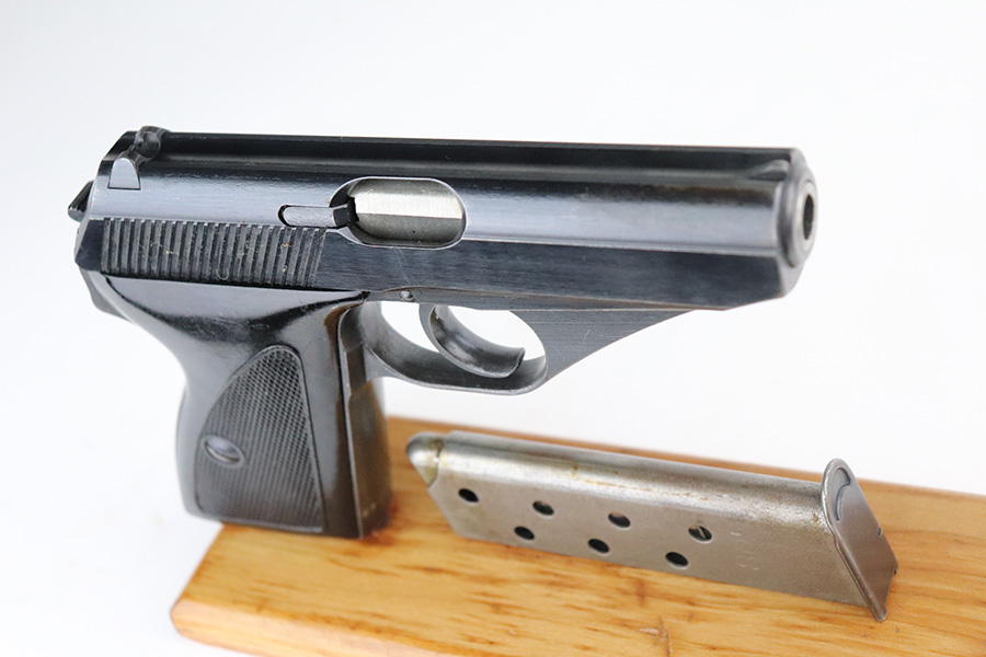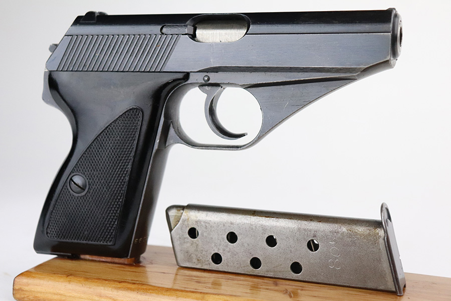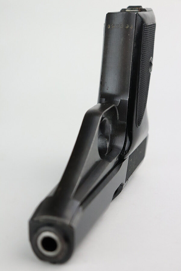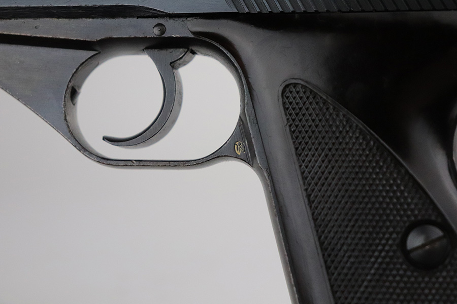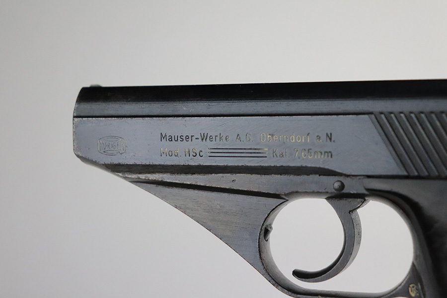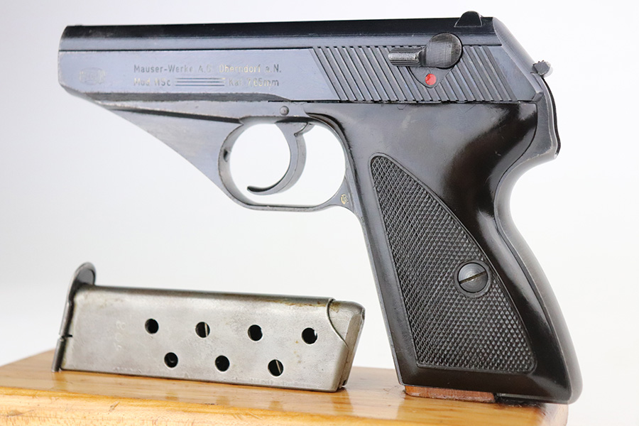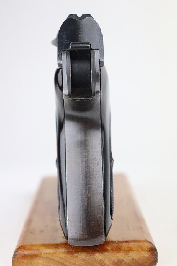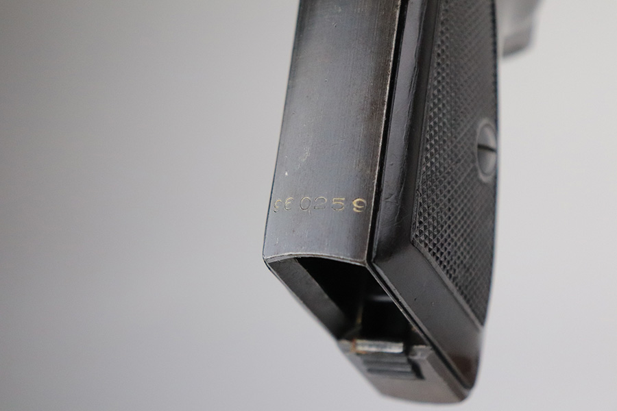 7/15/21 – This is a minty example of a French Mauser HSC manufactured after WW2. It is matching and has the proper French proof on the left side of the trigger guard. It has retained about 98% of its finish. There is just a hint of thinning and light patina on both straps. Minor wear and pin-pricking around the muzzle. One small area of minor spotty wear on the right side of the slide. Comes with excellent black plastic grips and one proper magazine. Mint bore.