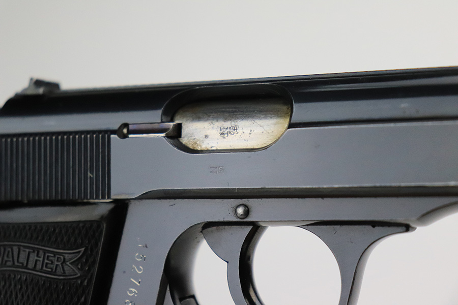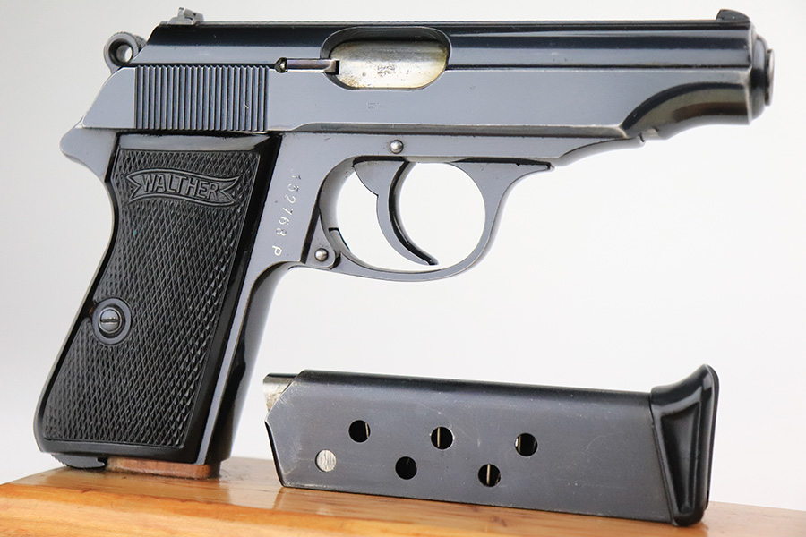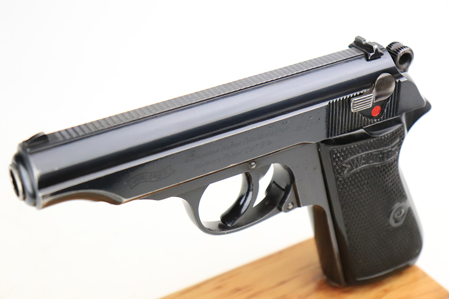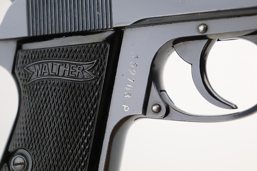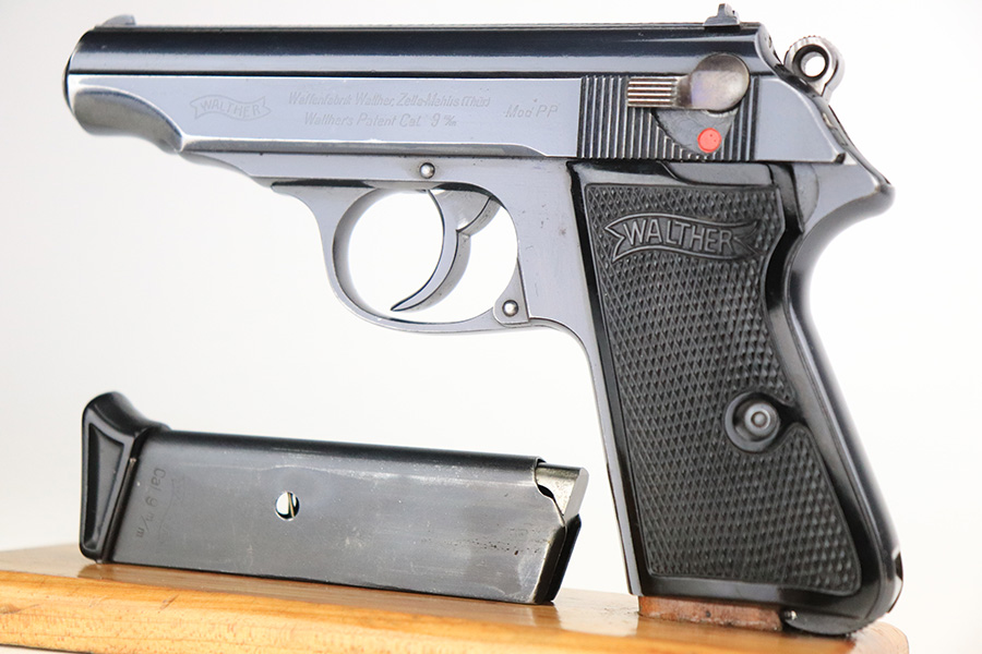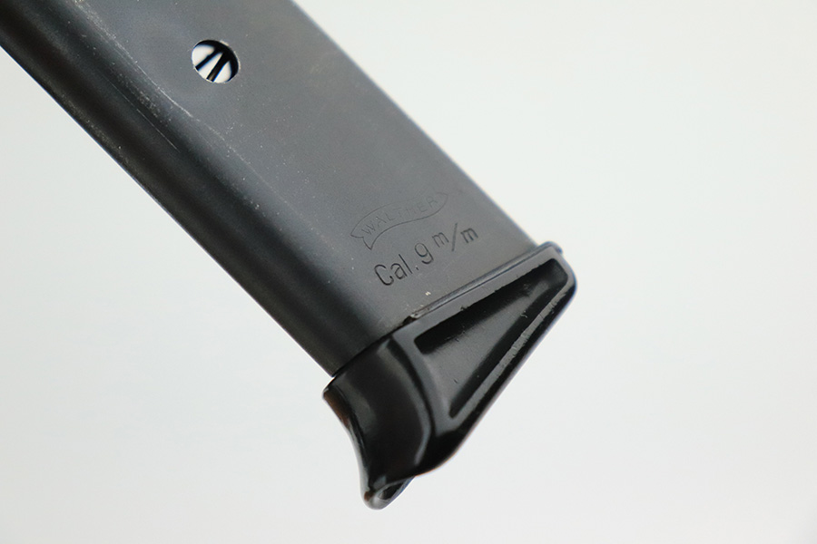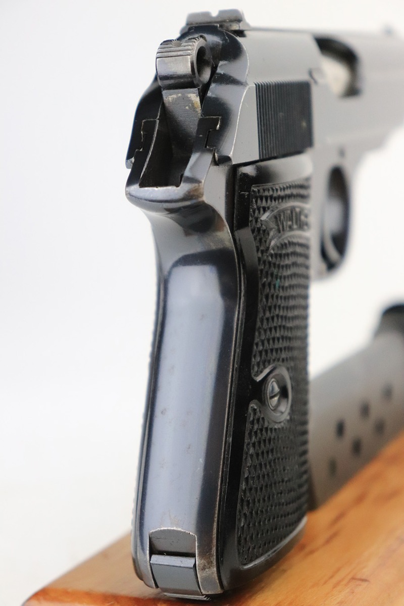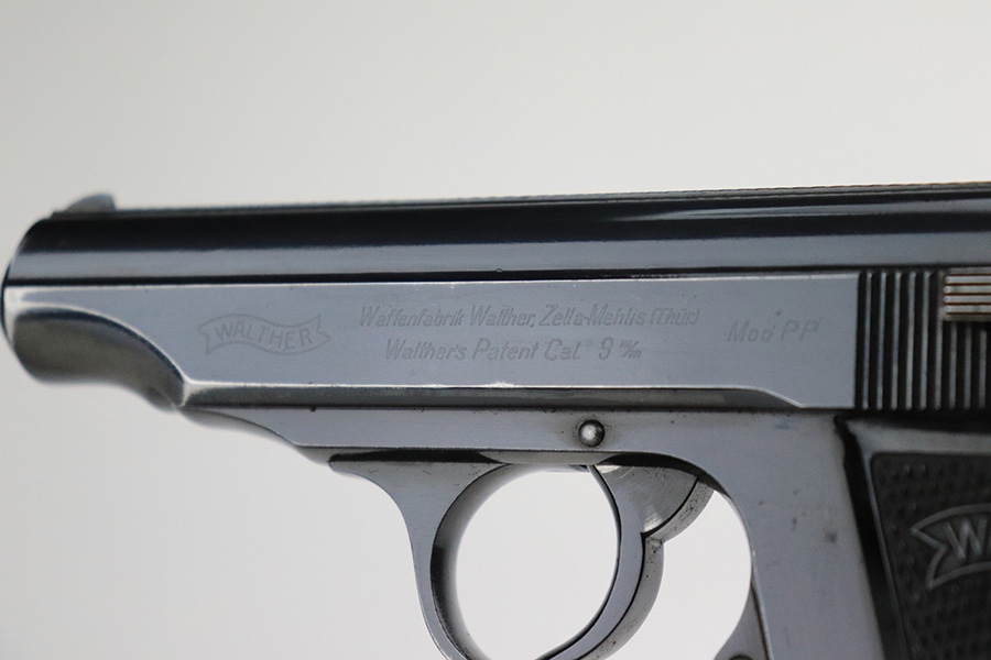 6/15/22 – This is a minty example of a rare 9mm Walther PP sold in the commercial market in 1939-40. It is all matching and has the proper “Crown N” proofs. It has retained about 97-98% of its original high polish finish. Just some very minor muzzle wear, a couple of very light scratches on the right side of the slide, and some light freckling on the back strap. Comes with excellent period-correct black bakelite grips and a period-correct 9mm finger extension magazine. The bore is near-mint with a hint of fouling in the grooves.