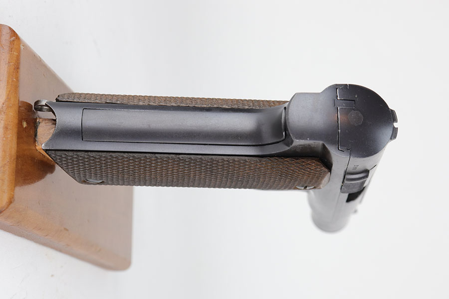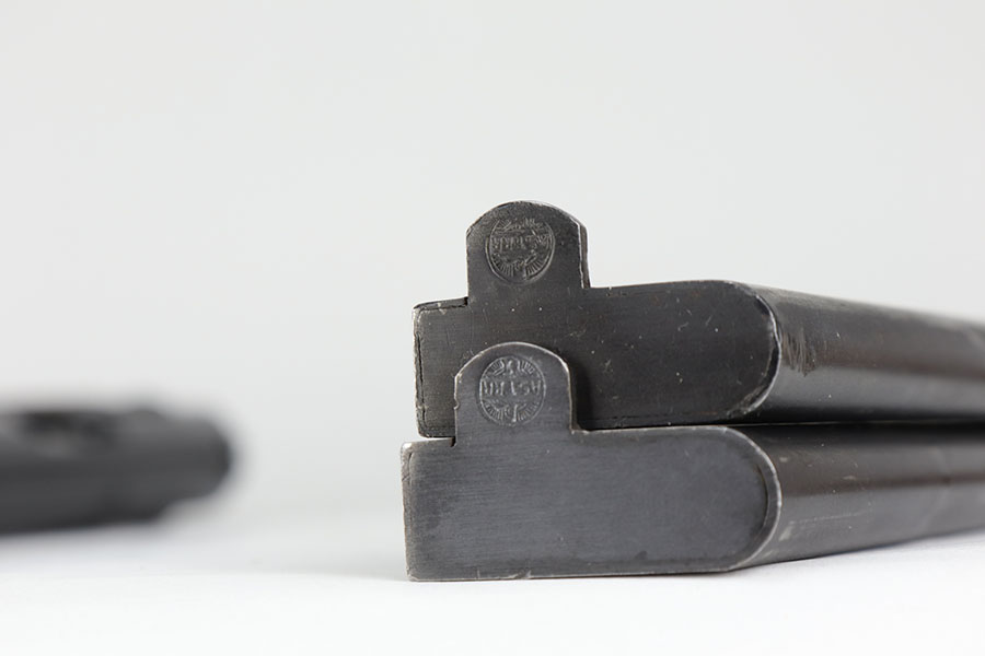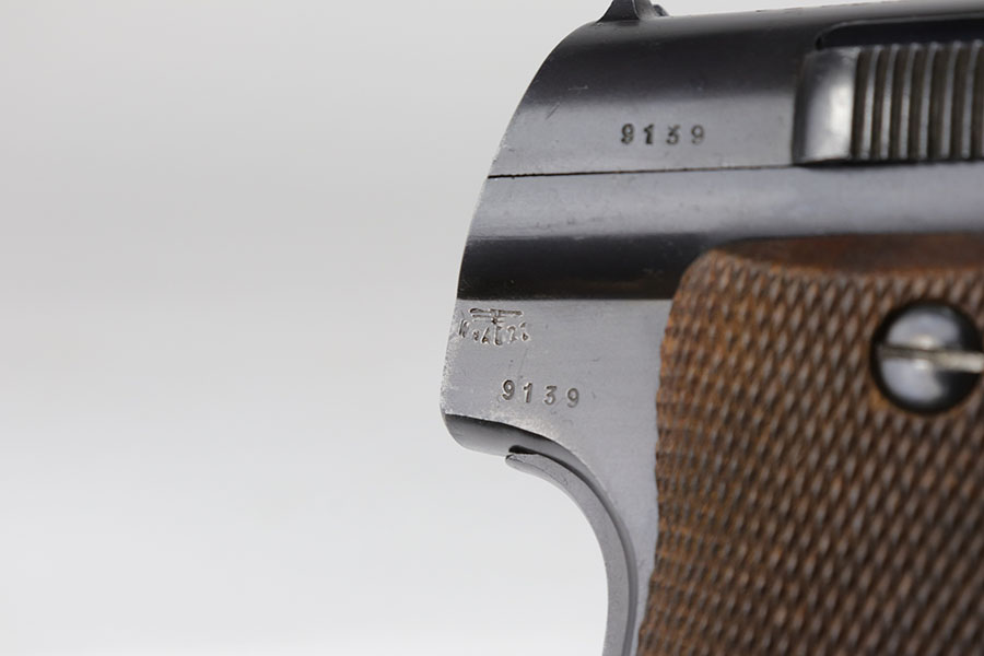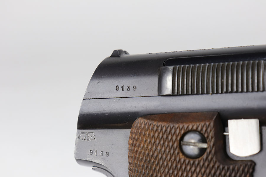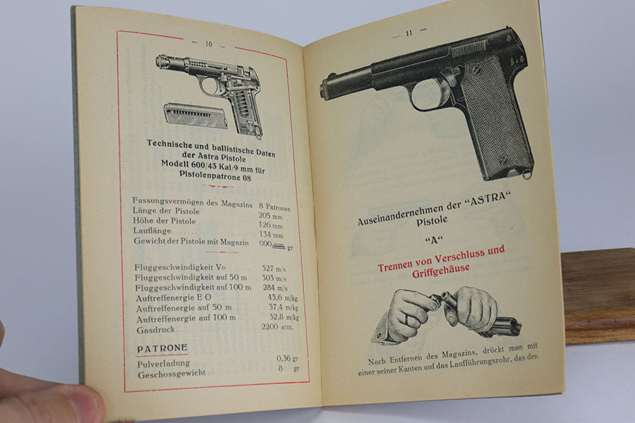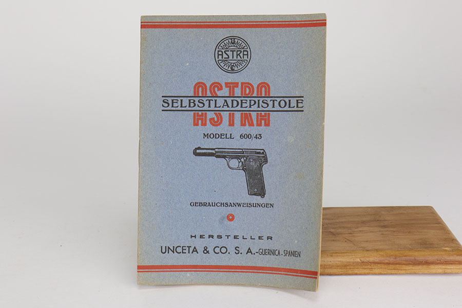10/23/20 – This is a rare and near-mint Astra 600 rig with holster, spare magazine and original manual. This pistol was delivered on July 16th of 1944, which was the final shipment of Nazi marked Astra 600s, and is one of only 10,000 produced with Nazi acceptance stamp. It has 98-99% of the original blue with no real wear to speak of. Waffenamt on right side of frame. Excellent bore and minty grips. Total of two original magazines. The rig is completed by a mint holster with internal waffenamt and ’44 date code. Maker mark of ‘bdr’ indicates it was made by R.Ehrhardt of Possneck, Thuringen. Also included is a super rare and original manual that was produced in Spain during the war, but the text is entirely in German.