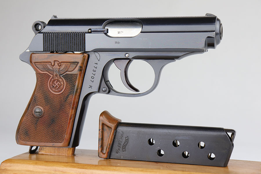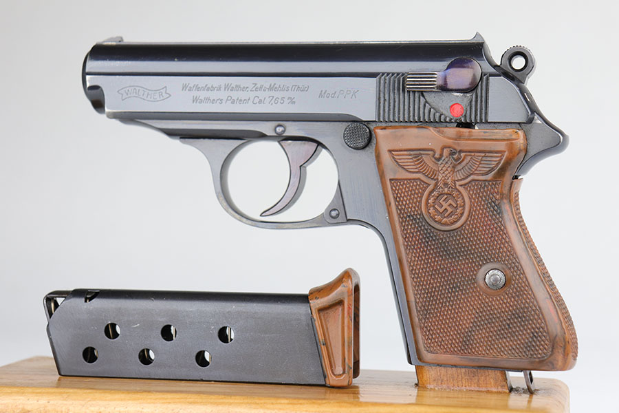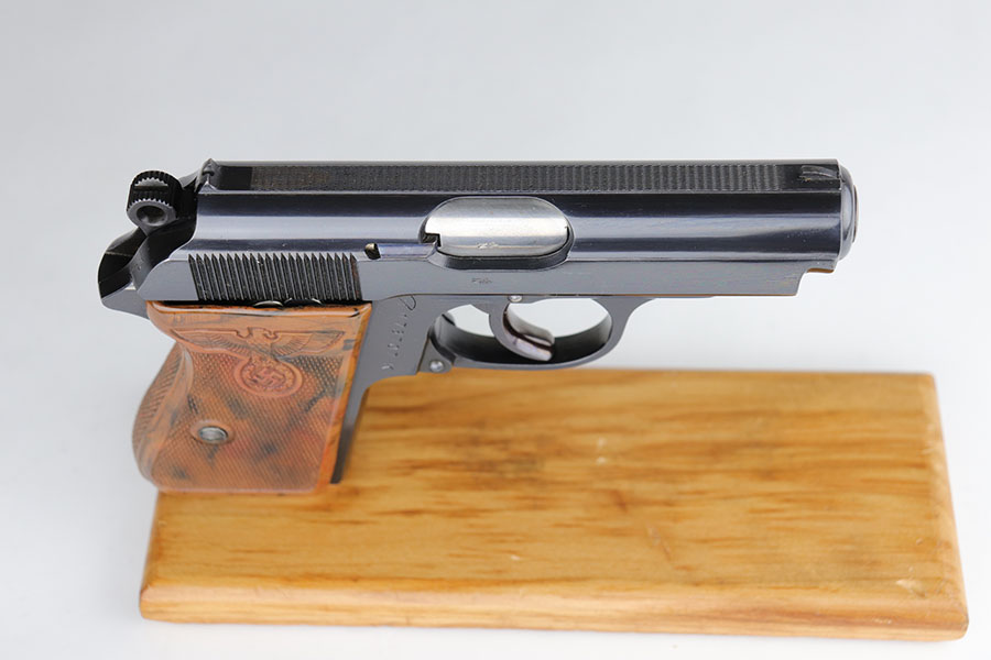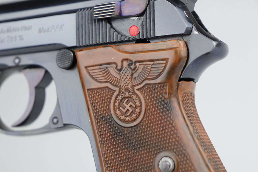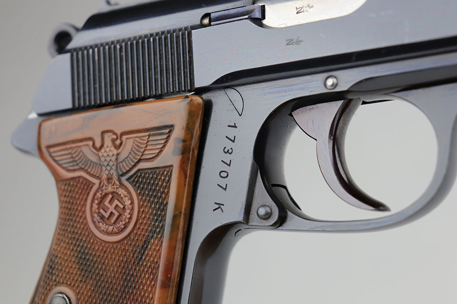 The Walther PPK with Party Leader Grips was the “Honor Weapon of the Political Leaders”. The Hoheitsabzeichen or High Insignia is the Eagle over Swastika found on either side of the grips where the Walther banner is normally located. The person entitled to wear the honor weapons that were awarded them by the Fuhrer were the Political Leaders of the national, regional and district territories, as well as leaders of local and support units. The persons who wore the honor weapon had their authorizations listed in the district personnel offices, and had to have in their possession a weapons permit issued by the police, which was obtained through official channels. These rare pistols were estimated to number around 3,500, and are widely faked, but this one is guaranteed original.