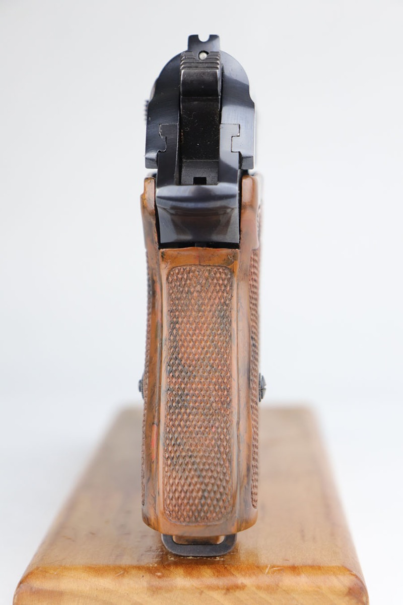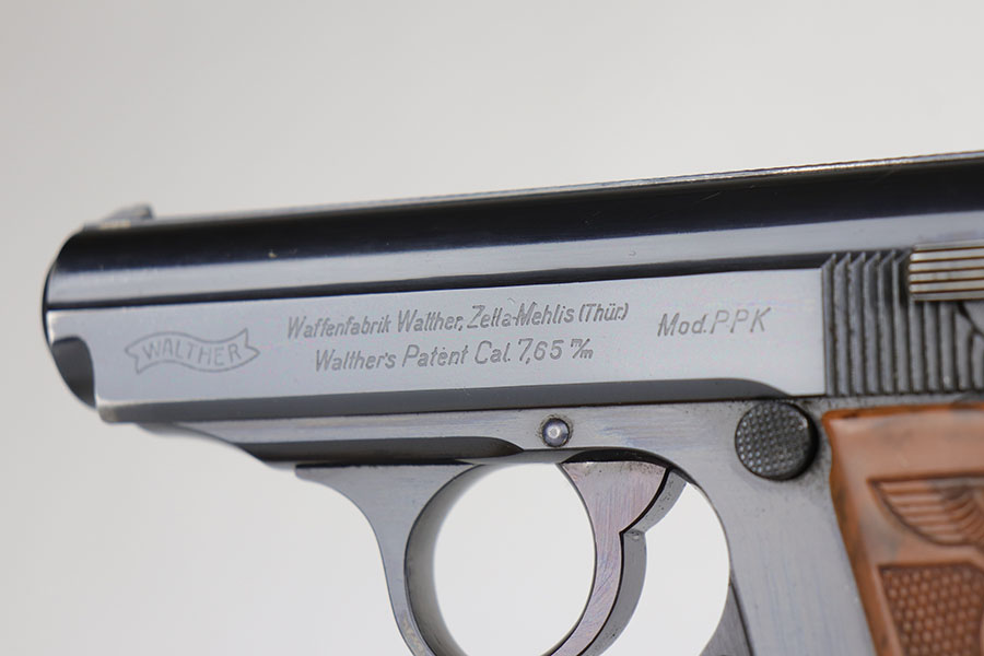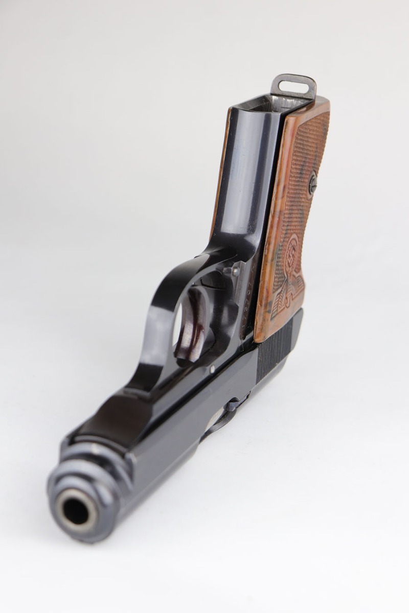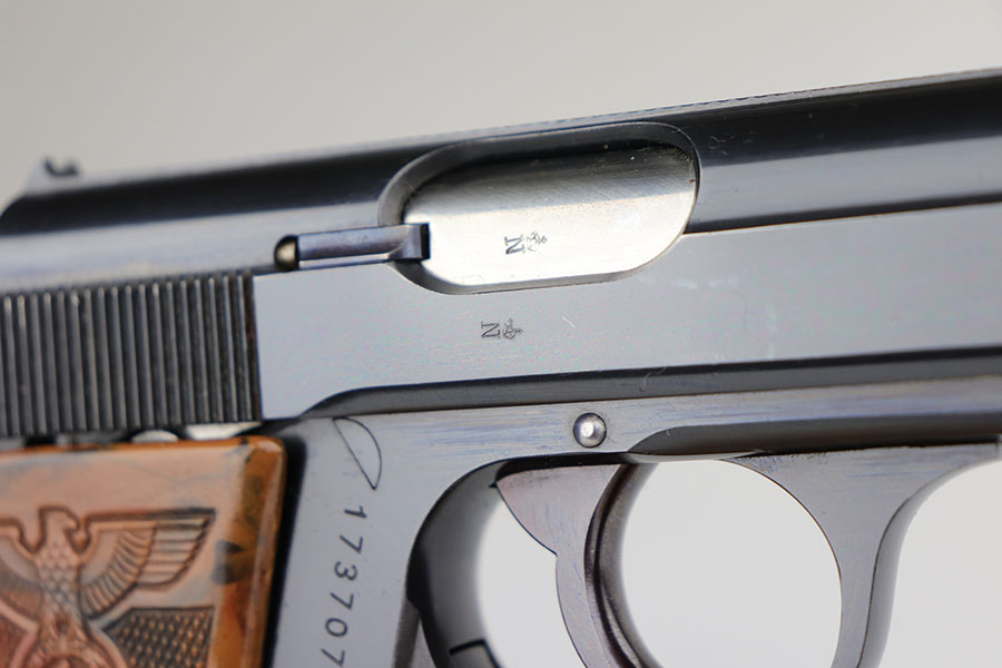5/19/20 – This is a gorgeous and rare Party Leader Walther PPK from the Nazi era. The gun has minty original finish with just a bit of muzzle wear on each side of the slide. The serial dates it to late 1938 or early 1939, and is in the correct range for the issuance of the Party Leader “Honor” Grip. The grip is excellent as well, with no cracks or chips. Nearly all PPK grips from that era will have tiny stress fracture, so this one is still on the higher end of the condition scale. Mint bore and finger extension magazine.
