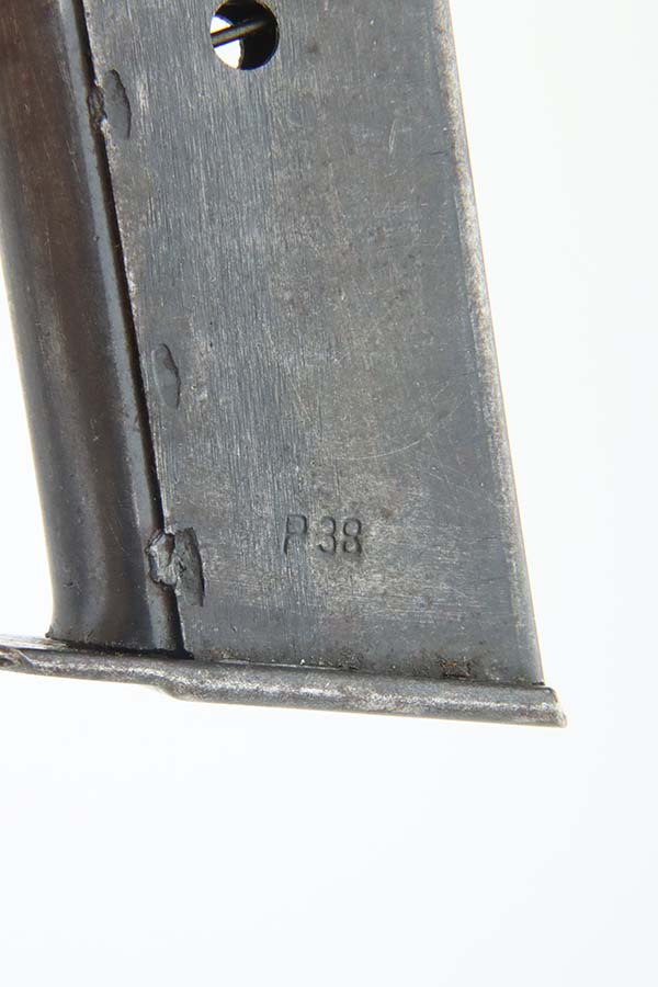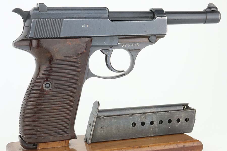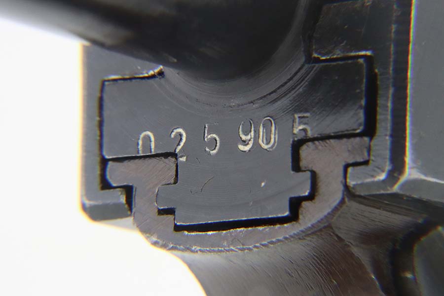 3/26/24 – This is a near-mint example of a very rare “Zero Series” Walther P.38, manufactured in 1945. They are called a zero series because the serial numbers start with a zero. Only 1,750 of these were produced according to Whittington’s book. This one is all matching and has “Eagle 359” military acceptance proofs. It has retained about 97-98% of its late-war finish. There are hints of high edge and muzzle wear, one small spot of discoloration on the left side of the slide, and a hint of thinning on the front strap. Casting flaw at the base of the front strap (typical for this variation). Fitted with reddish bakelite grips and comes with a period-correct “Eagle 359” marked jvd magazine. Mint bore. De-cocker is functional.