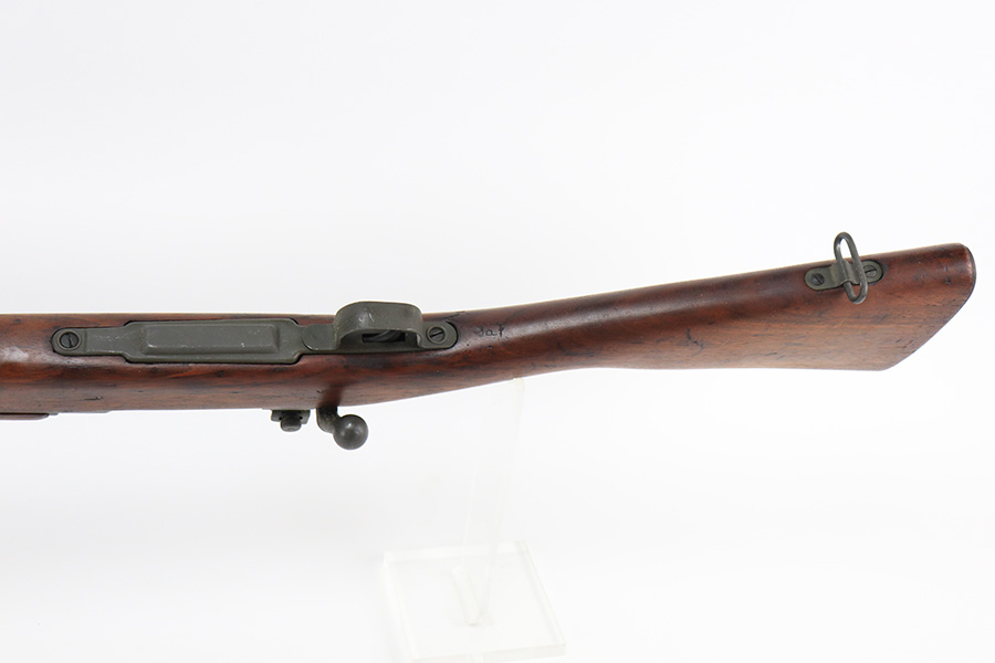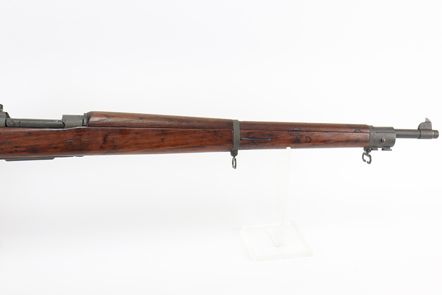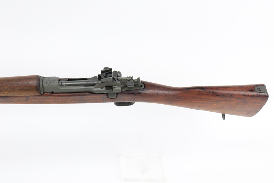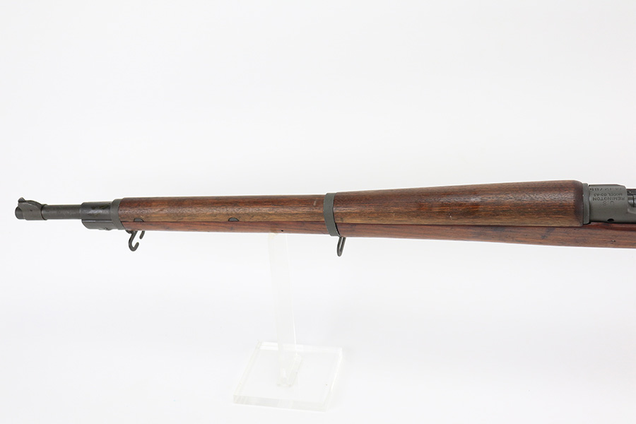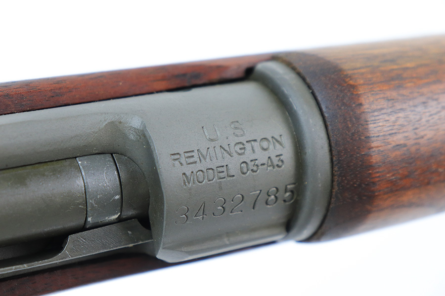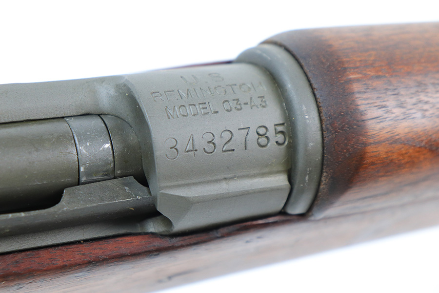 2/15/22 – This is a beautiful Remington 03-A3 rifle from 1943. It’s arsenal refurbished at San Antonio Arsenal as indicated by the stock marking. Mint parkerized finish throughout, and also has a minty bore so this would be a nice shooting and a great display piece. Just one minor patch of pitting in the bore but shouldn’t impact accuracy. Barrel is dated to February of 1943. Square ‘P’ marking on wrist confirms an arsenal repair or re-work. Some age and handling wear to the stock but no cracks.