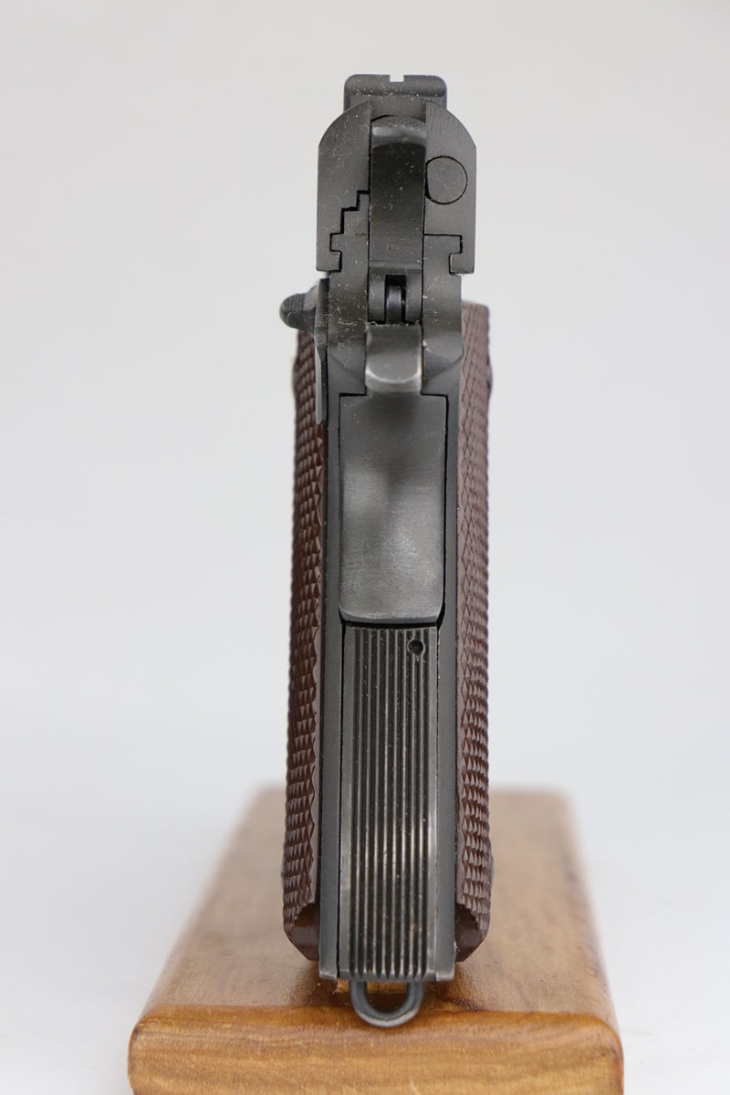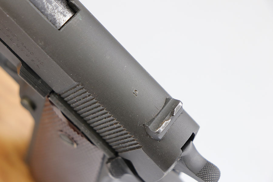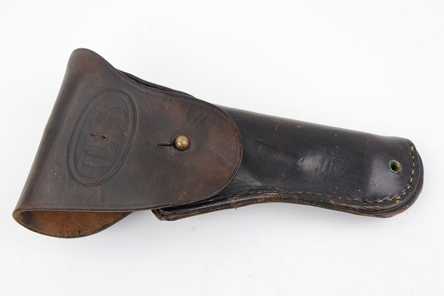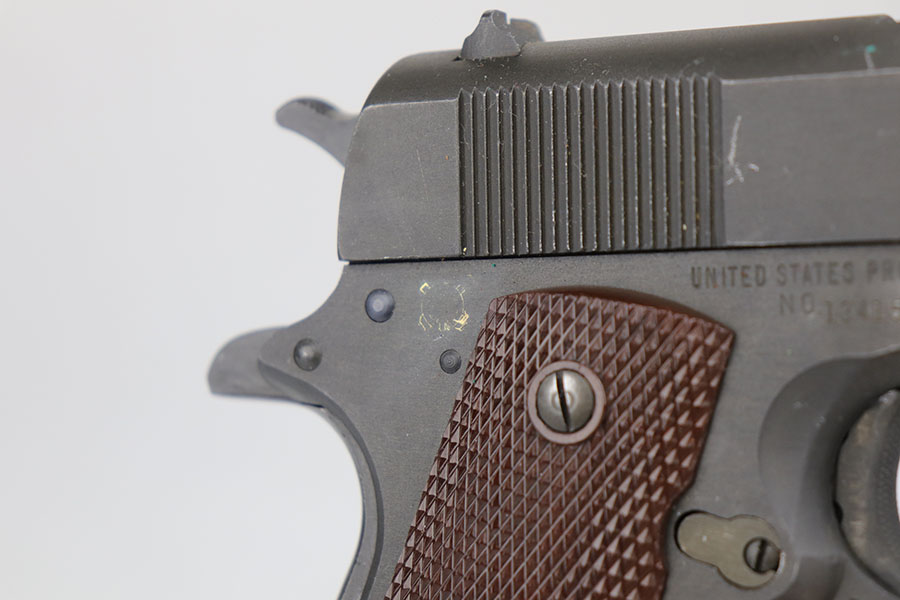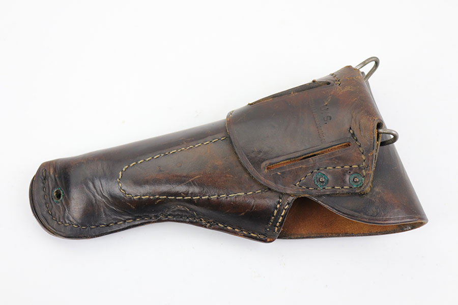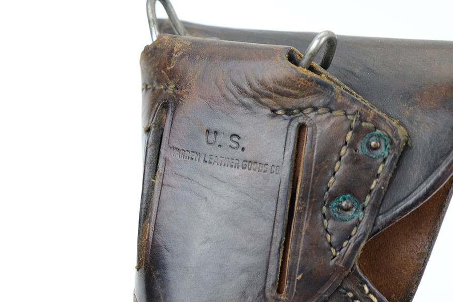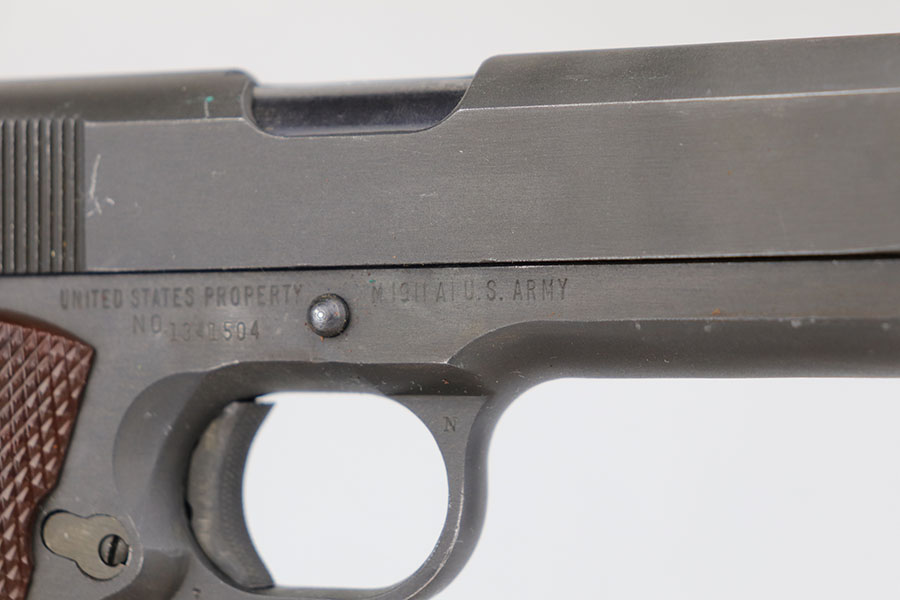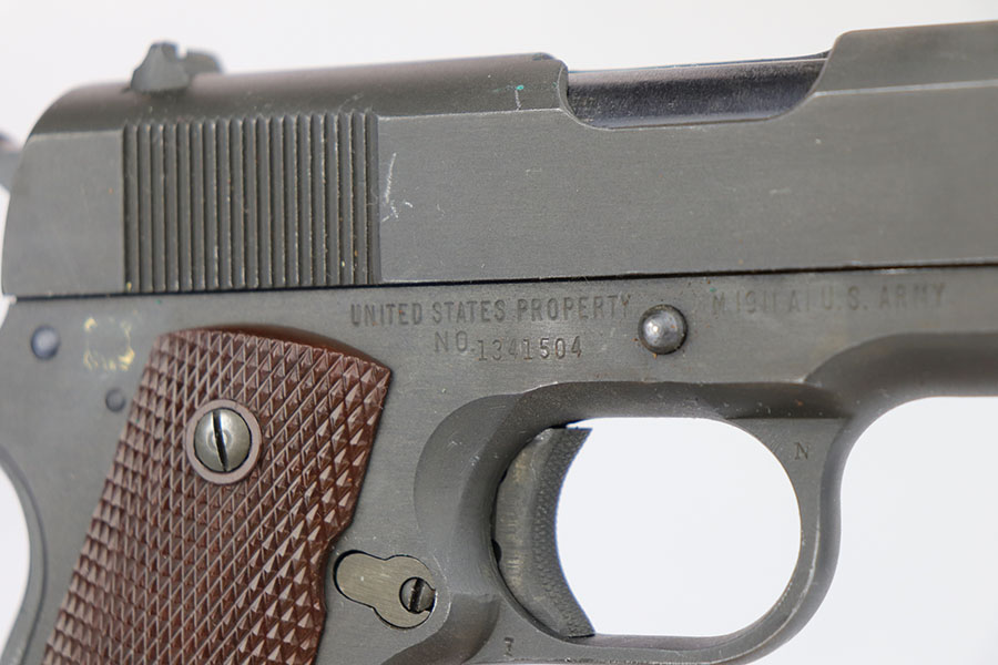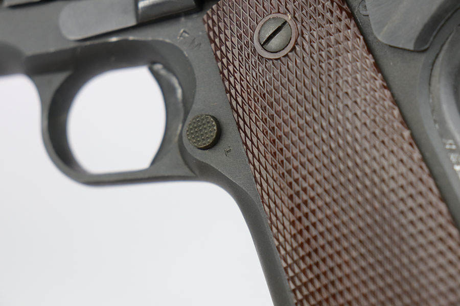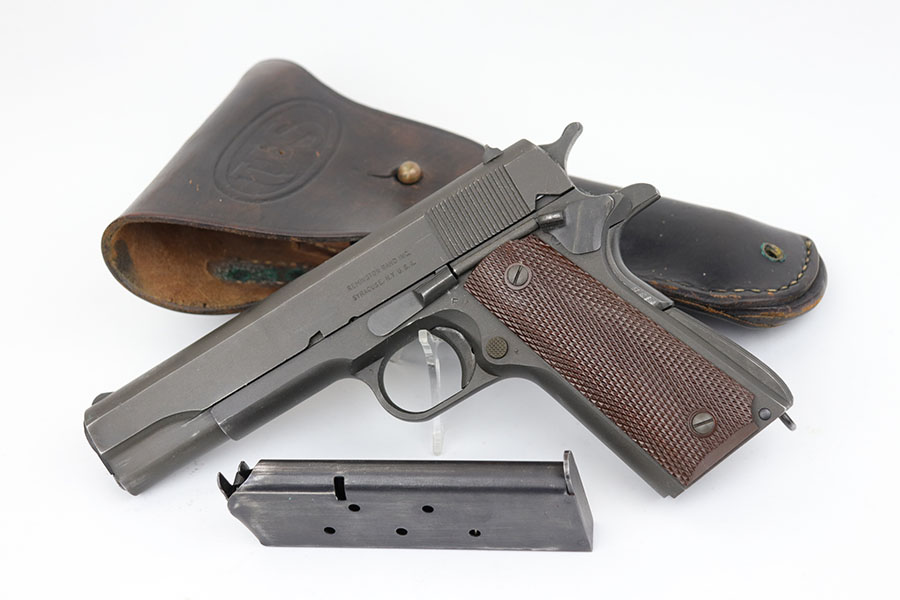 8/4/21 – This is a near-mint Remington M1911A1 from the very end of 1943. The original finish rates at 98+% with just a minor spot of finish wear on the trigger guard and slight thinning of the grip safety. All markings are correct. Minty grips and bore. ‘L’ marked magazine. ‘HS’ barrel. Comes with an original holster that was produced by Warren Leather Goods Company. It’s in excellent condition aside from two small holes in the front flap, which look like it may have been embellished with some sort of pin at one point.