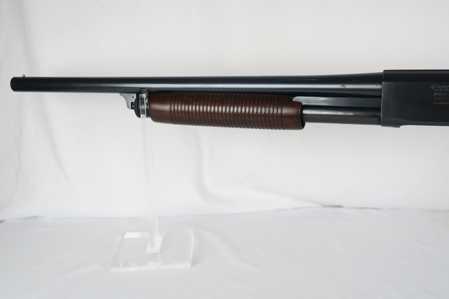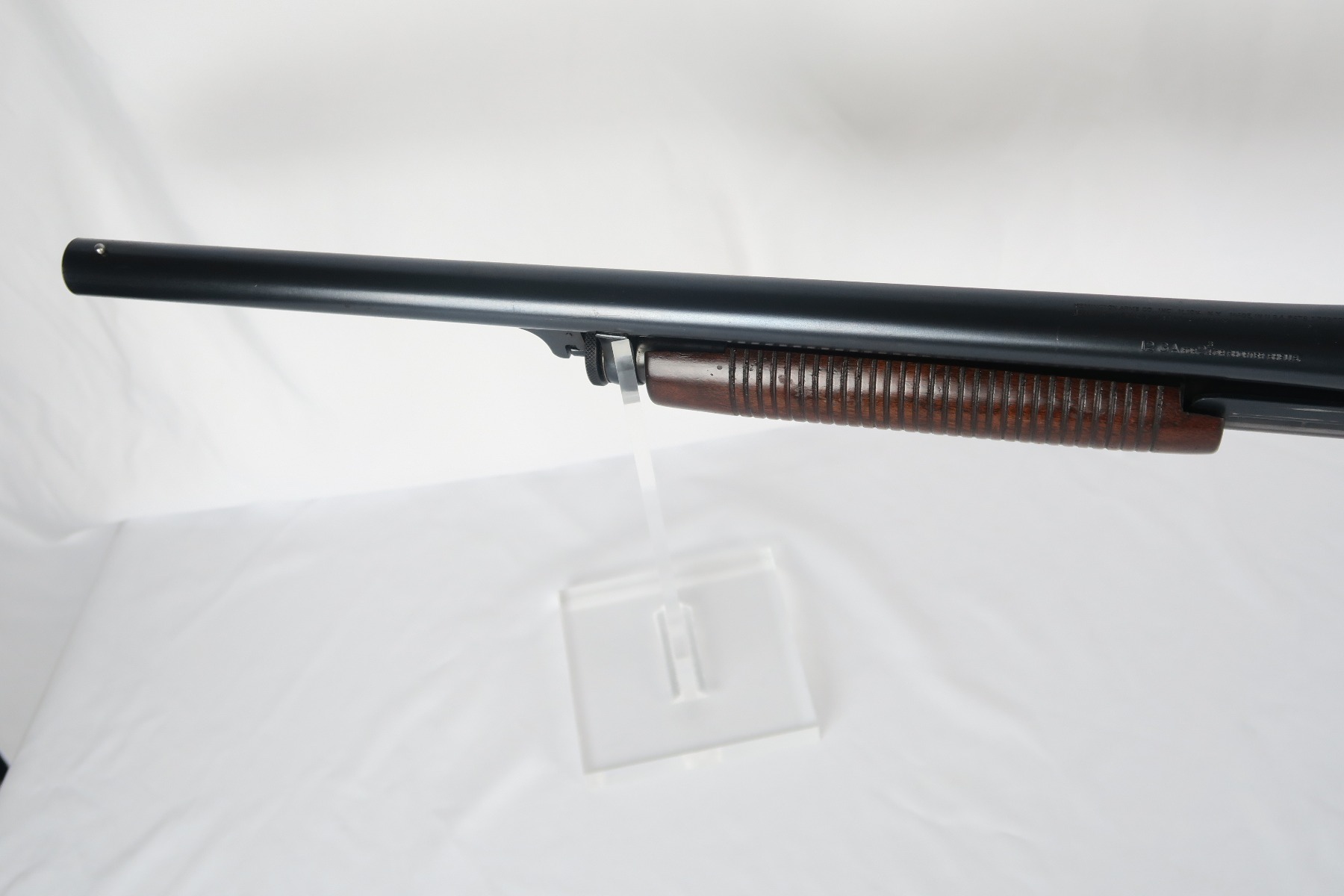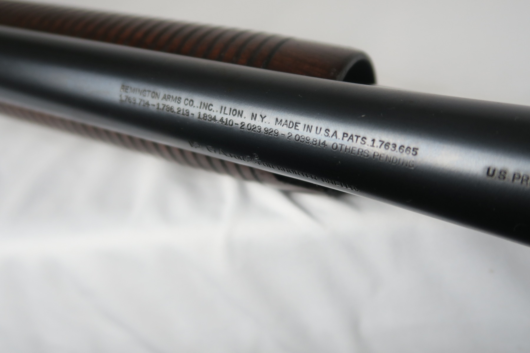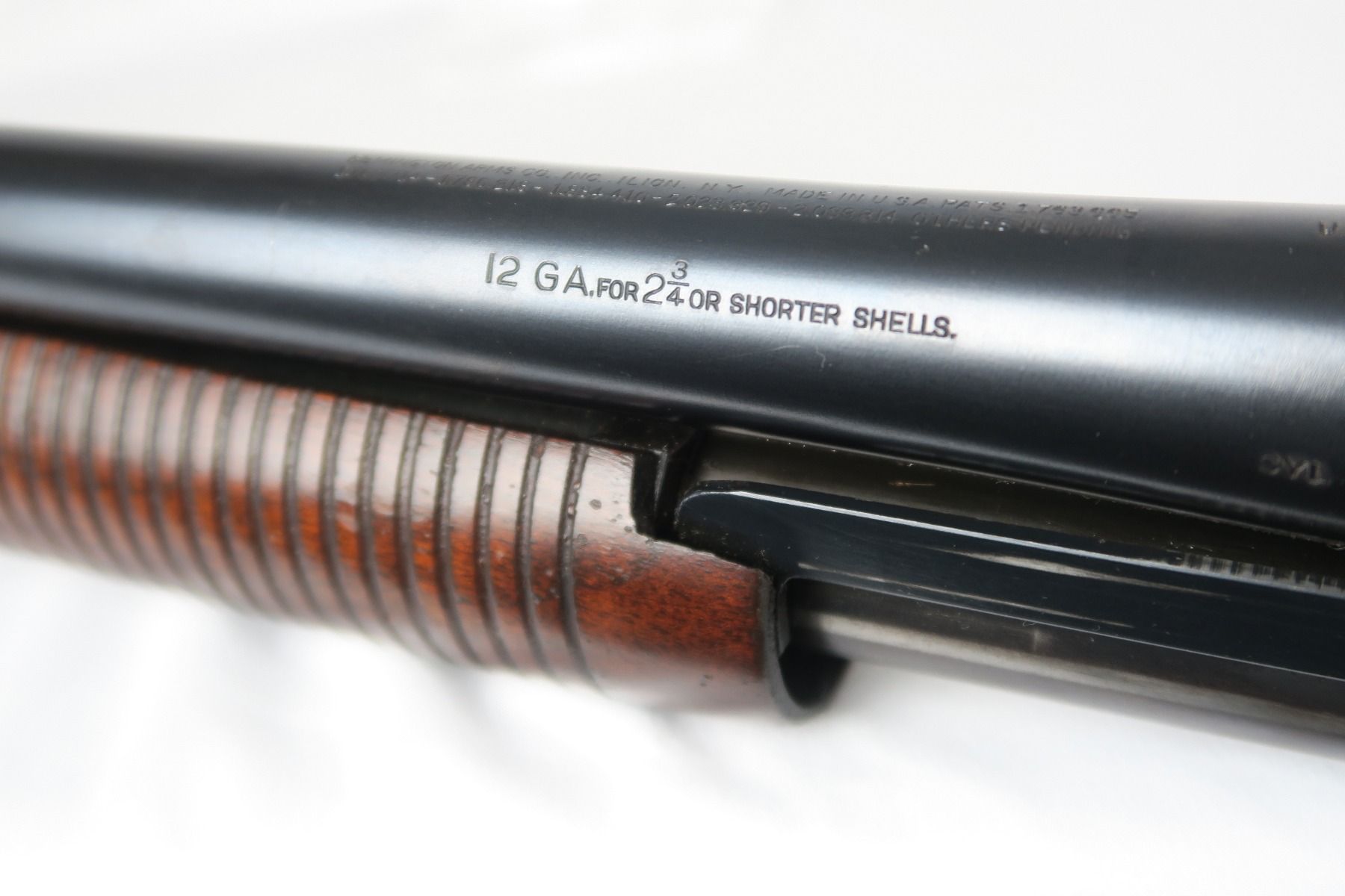 2/16/18 – This is a near-mint Remington model 31 riot shotgun, manufactured in February of 1923 and later issued to the US military. During WWII, Remington Arms supplied almost 8000 Model 31 shotguns for both aerial training and guard duty. This is an example of a short barreled riot or guard duty shotgun. The top of the barrel is roll stamped with the two line Remington Arms address and patent dates, with the left side marked “12 GA. For 2 3/4 inch shells or shorter”. The barrel and receiver are matching, and both are US PROPERTY marked. The stock has the crossed cannons cartouche present. The original bluing rates at 98% with no major blemishes on the barrel or receiver, just slide wear from the pump action. Stock has a couple minor dings but no cracks or chips. Bore is nice and shiny with no frost or corrosion.