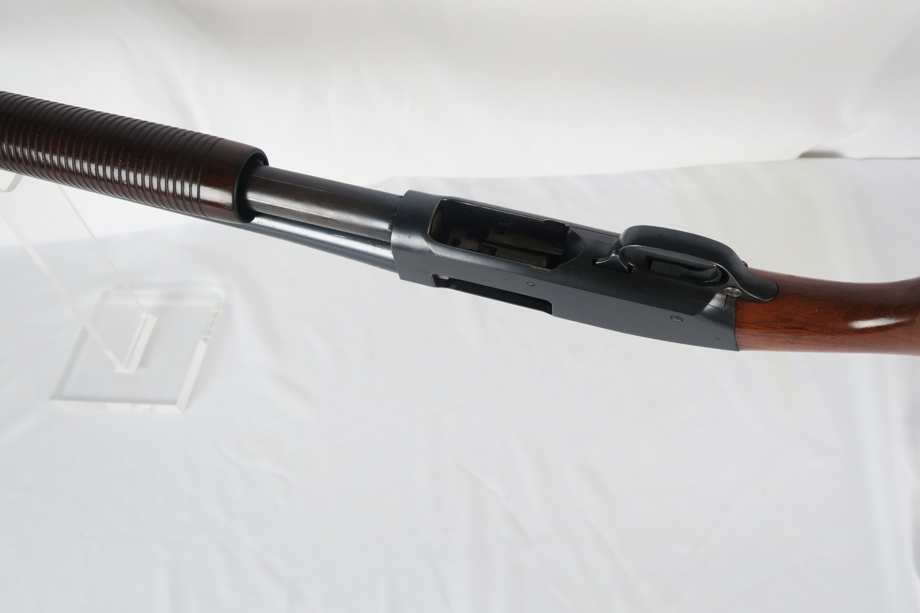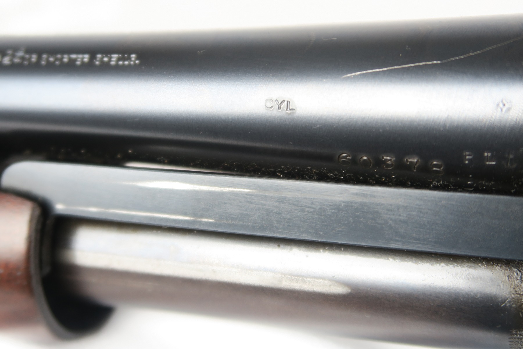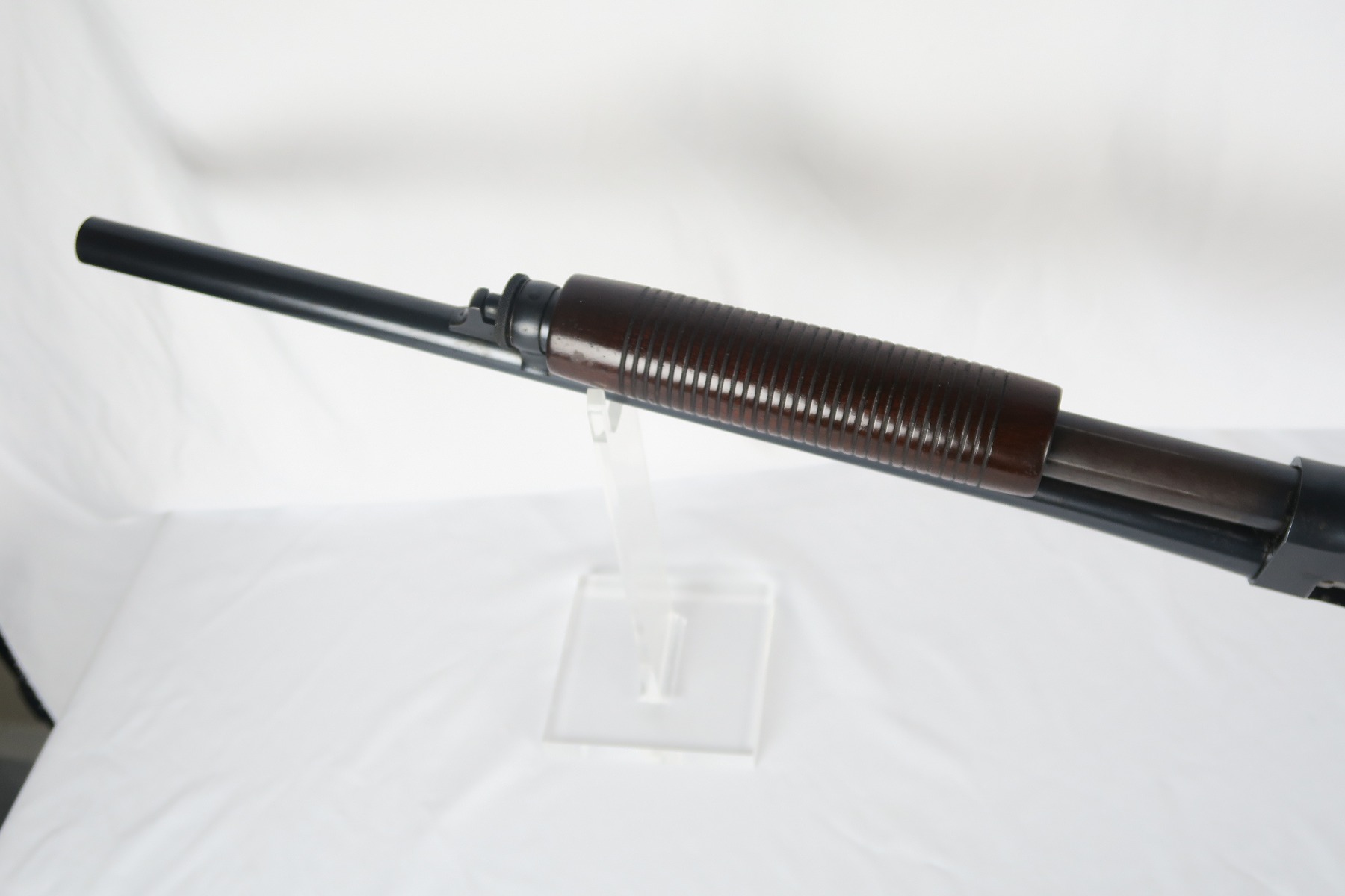 2/16/18 – This is a near-mint Remington model 31 riot shotgun, manufactured in February of 1923 and later issued to the US military. During WWII, Remington Arms supplied almost 8000 Model 31 shotguns for both aerial training and guard duty. This is an example of a short barreled riot or guard duty shotgun. The top of the barrel is roll stamped with the two line Remington Arms address and patent dates, with the left side marked “12 GA. For 2 3/4 inch shells or shorter”. The barrel and receiver are matching, and both are US PROPERTY marked. The stock has the crossed cannons cartouche present. The original bluing rates at 98% with no major blemishes on the barrel or receiver, just slide wear from the pump action. Stock has a couple minor dings but no cracks or chips. Bore is nice and shiny with no frost or corrosion.