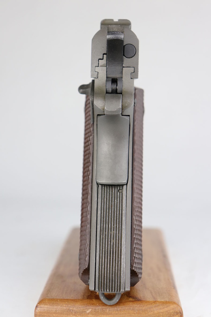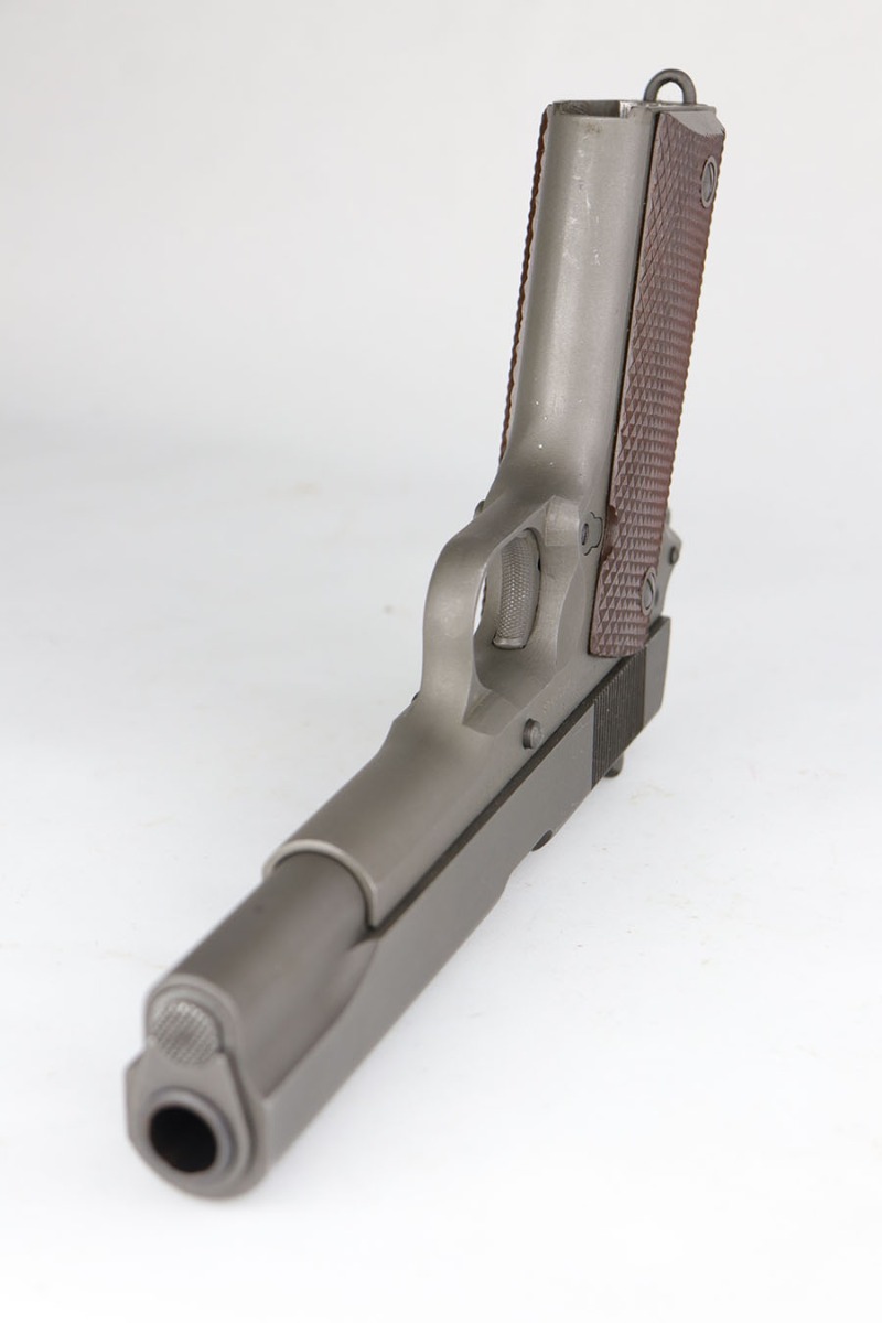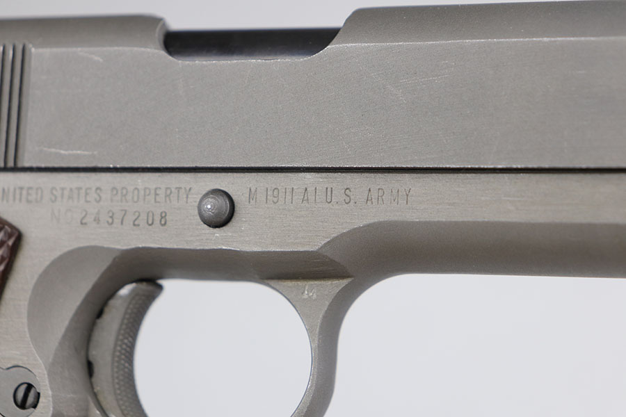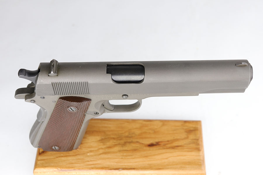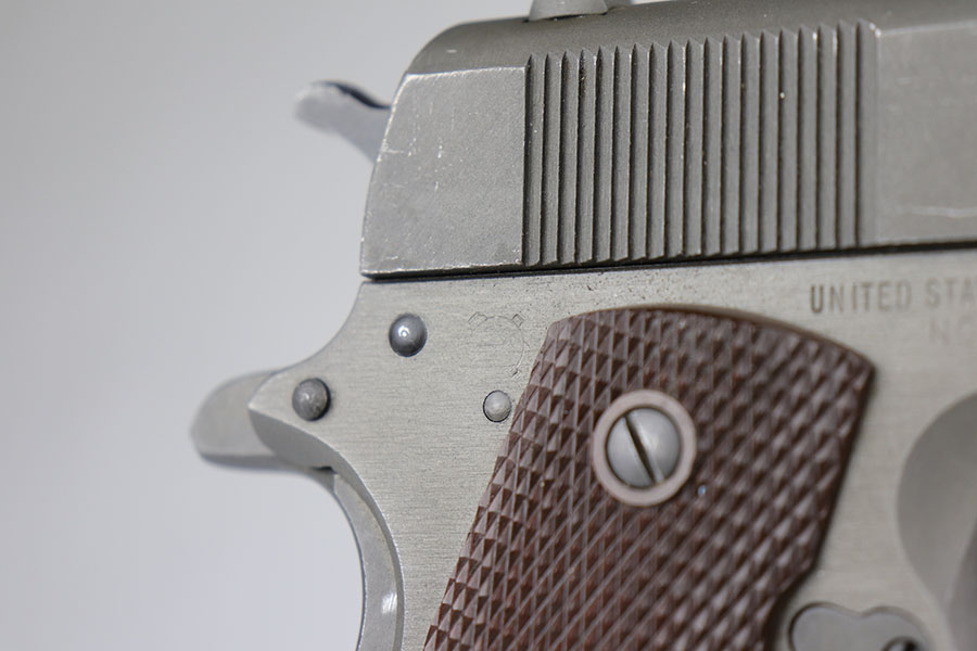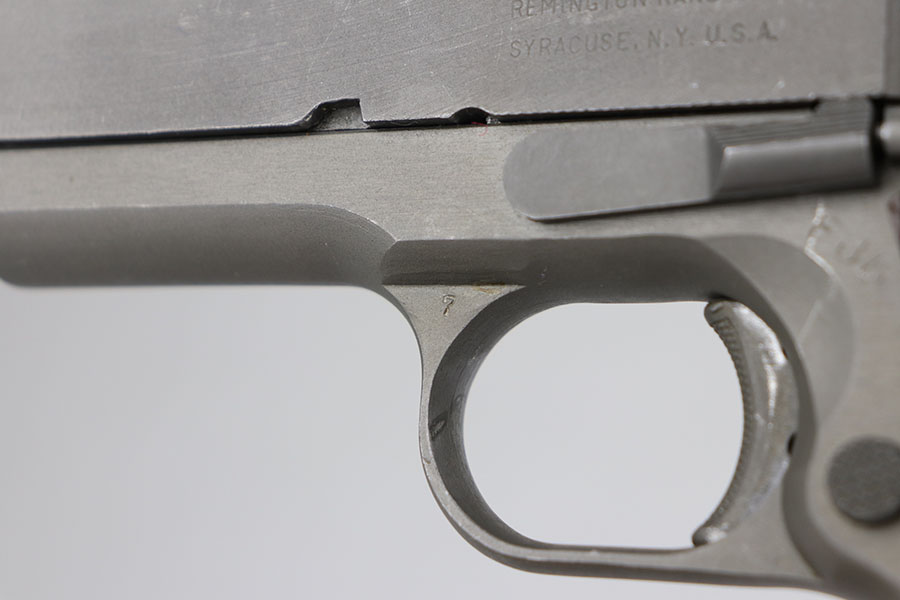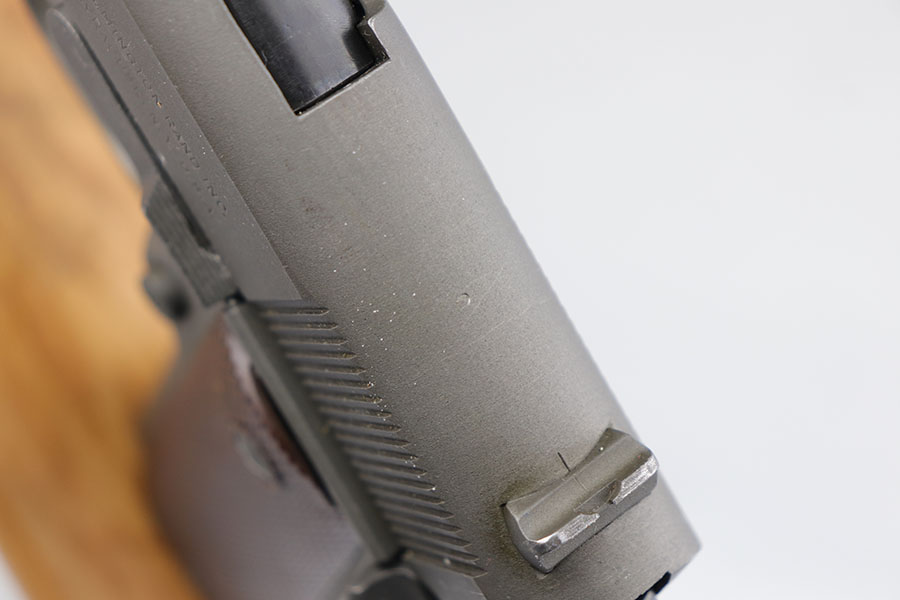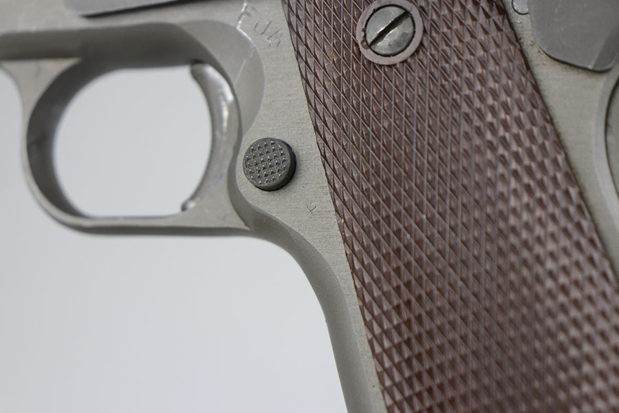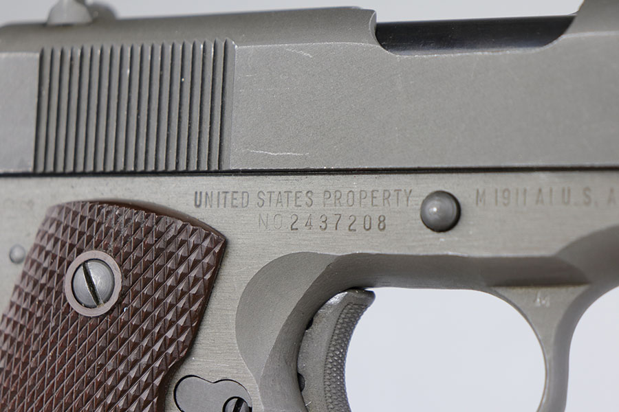 5/1/20 – This is a near-mint Remington Rand 1911A1 from 1945. It has tiny hits of high edge thinning, but looks nearly unused. Mint bore with ‘S’ marked barrel that is correct for this serial range. Excellent grips and ‘S’ marked magazine. Correct inspection proofs throughout.