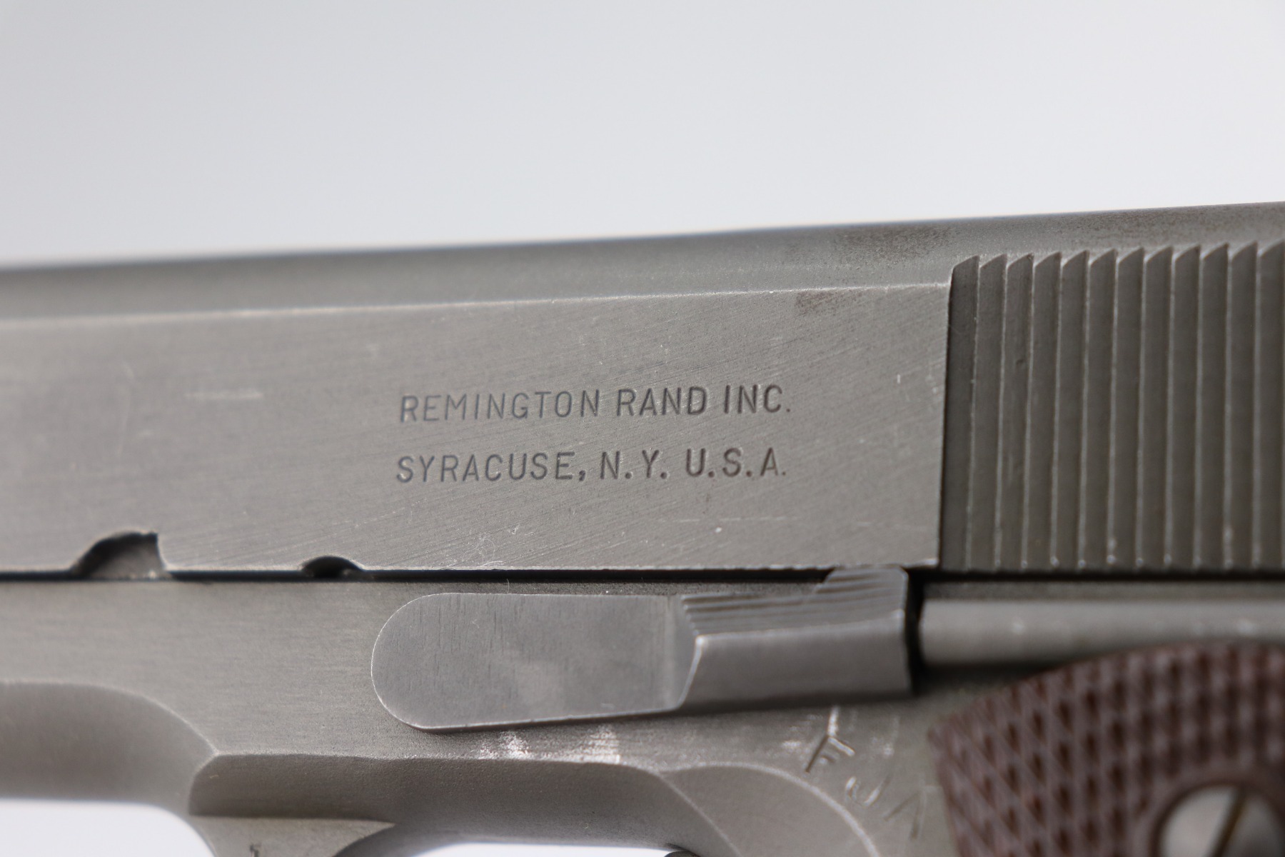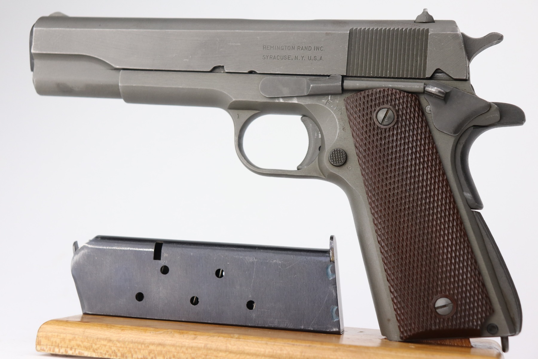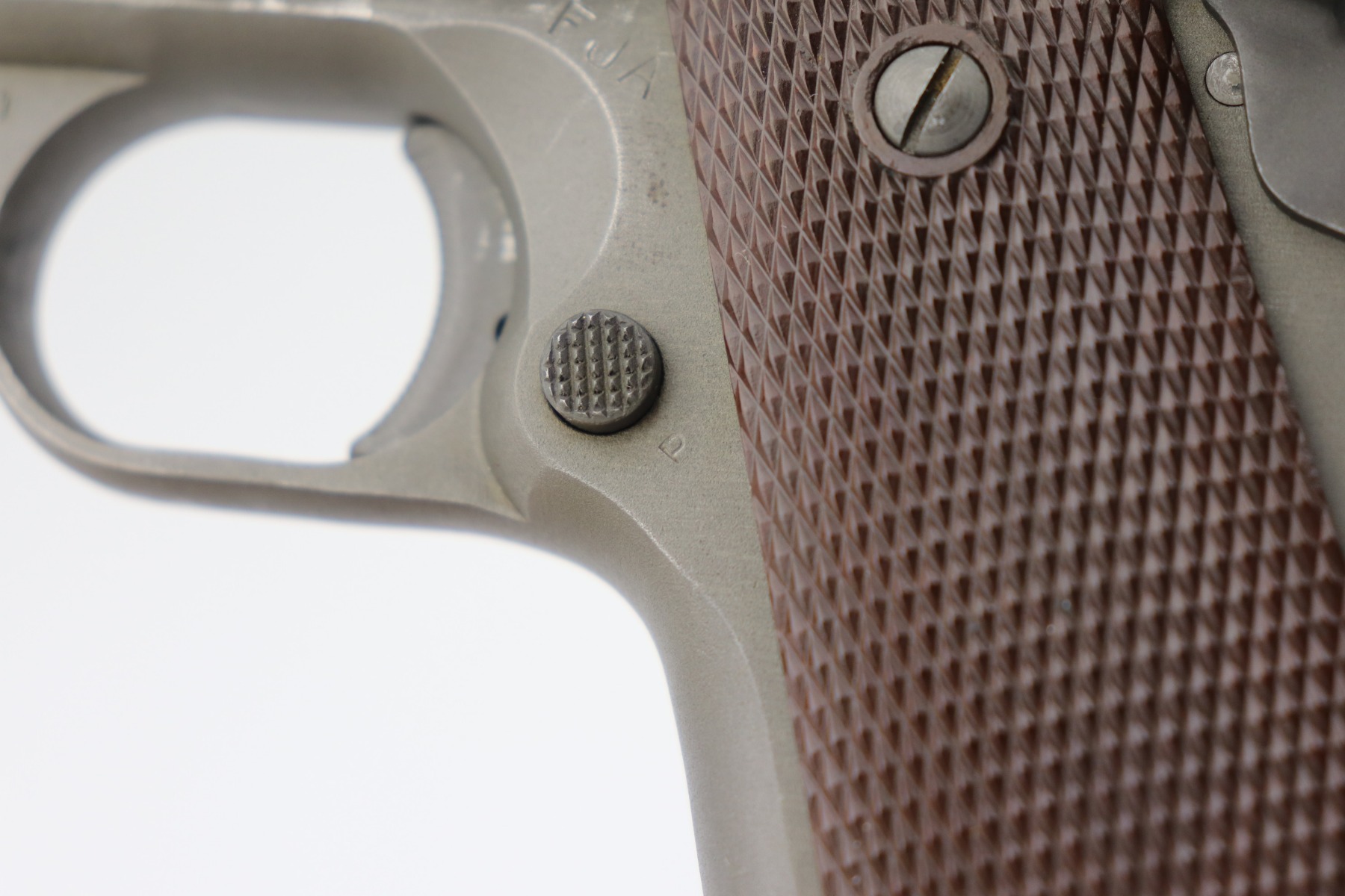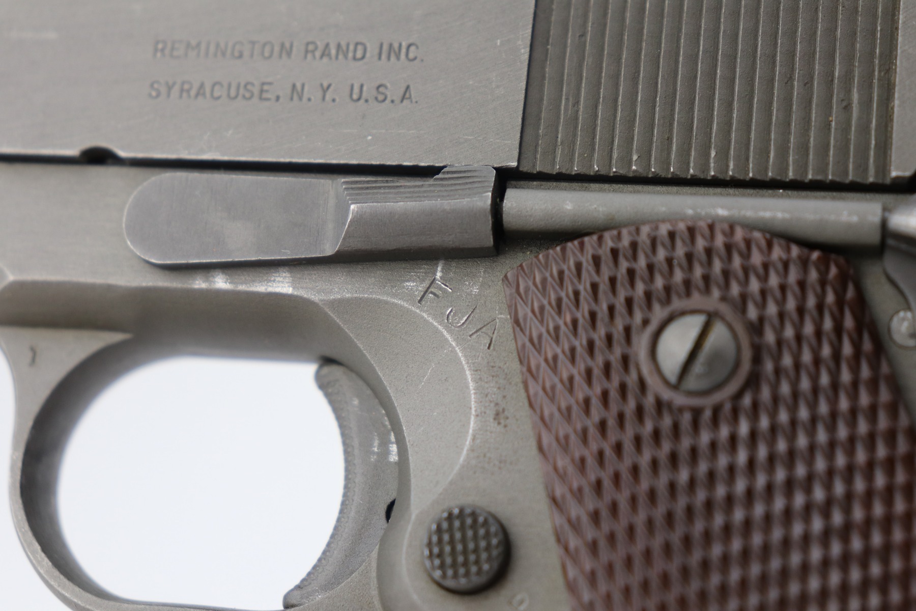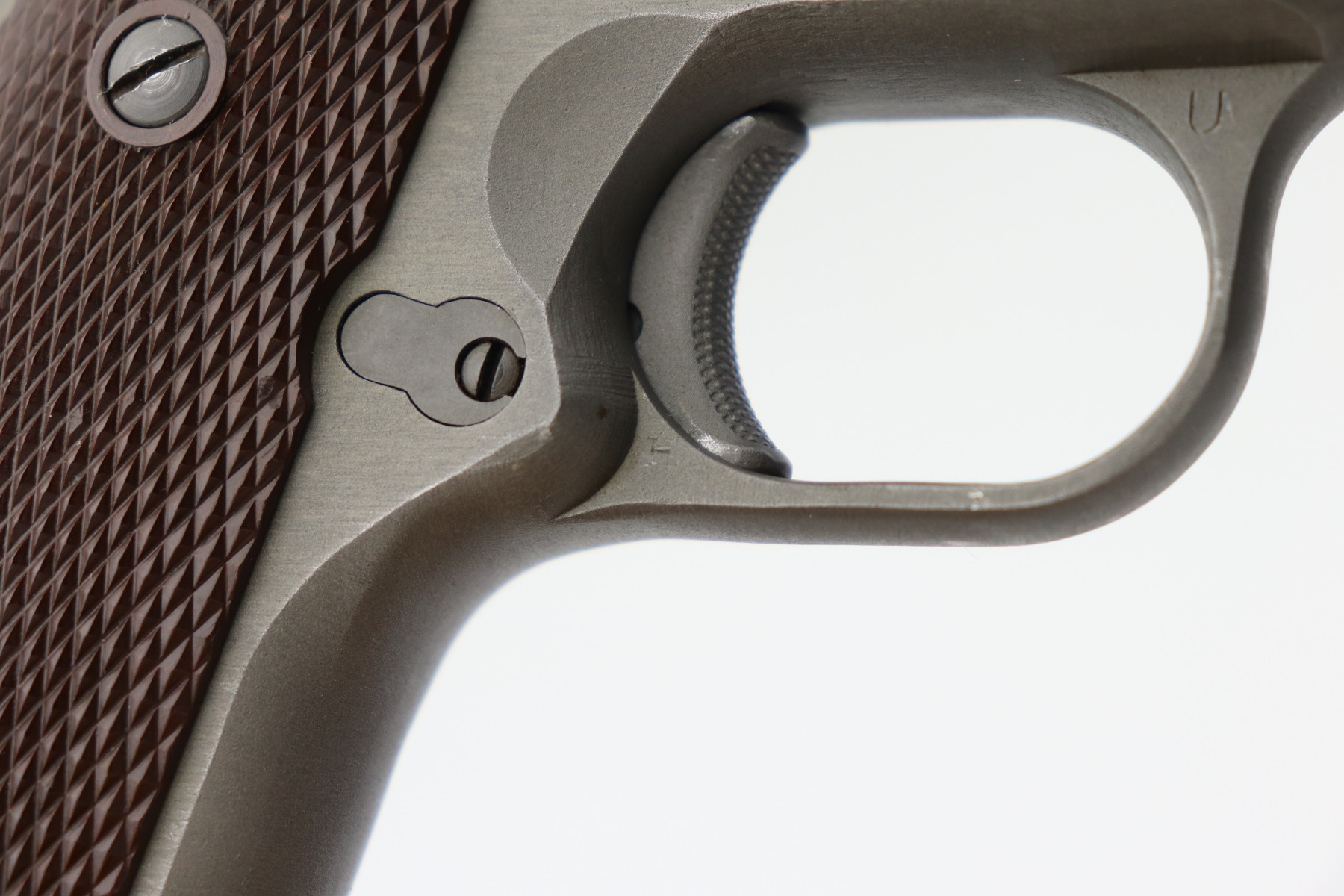 2/24/21 – This is a minty example of a Remington Rand Model 1911A1 issued to the US military in 1945. It is all correct and has the proper cross-canon military cartouche on the tang. Correct HI Standard barrel. It has retained about 98% of its original finish – just very minor general high edge wear. There is an area of light oxidation on the top of the slide. There are areas of minor discoloration on the underside and left side of the slide. Comes with excellent grips and a period-correct magazine. The bore is minty.