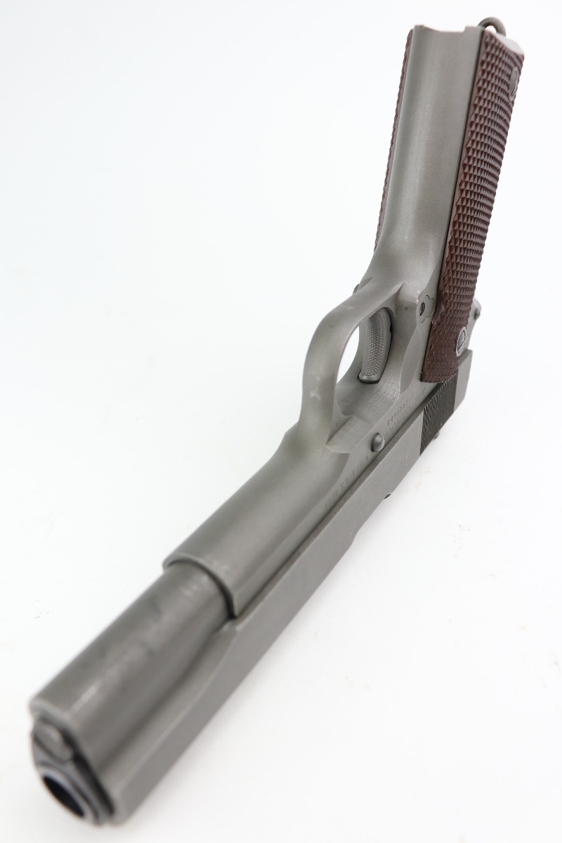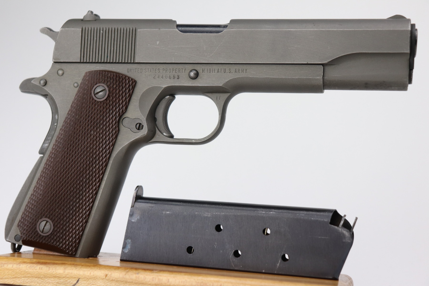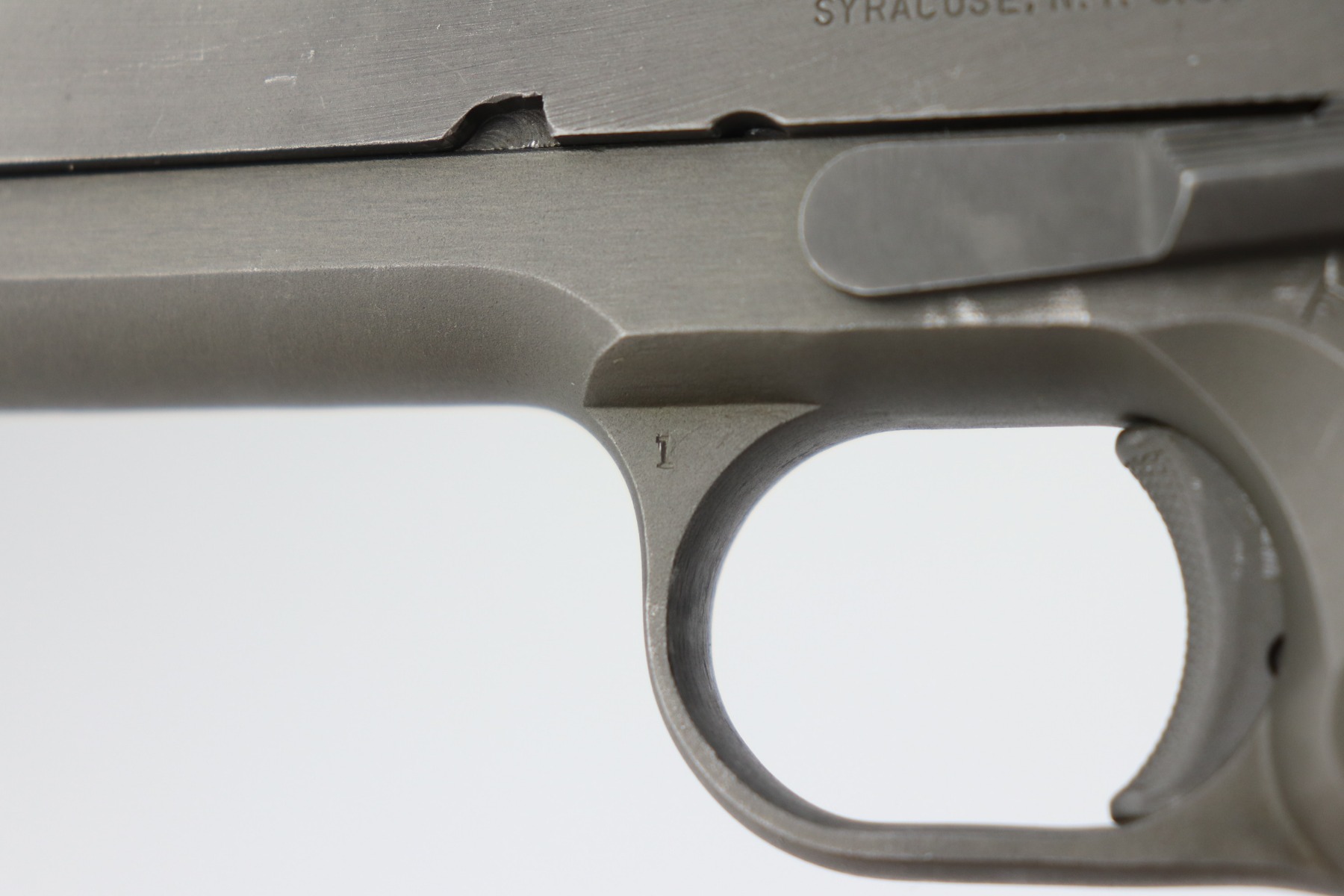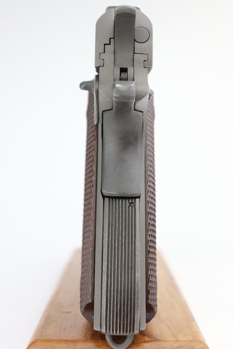 2/24/21 – This is a minty example of a Remington Rand Model 1911A1 issued to the US military in 1945. It is all correct and has the proper cross-canon military cartouche on the tang. Correct HI Standard barrel. It has retained about 98% of its original finish – just very minor general high edge wear. There is an area of light oxidation on the top of the slide. There are areas of minor discoloration on the underside and left side of the slide. Comes with excellent grips and a period-correct magazine. The bore is minty.