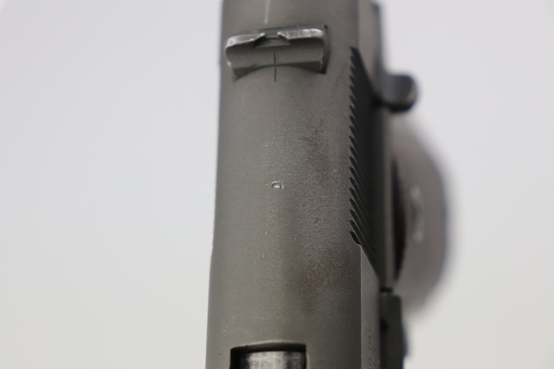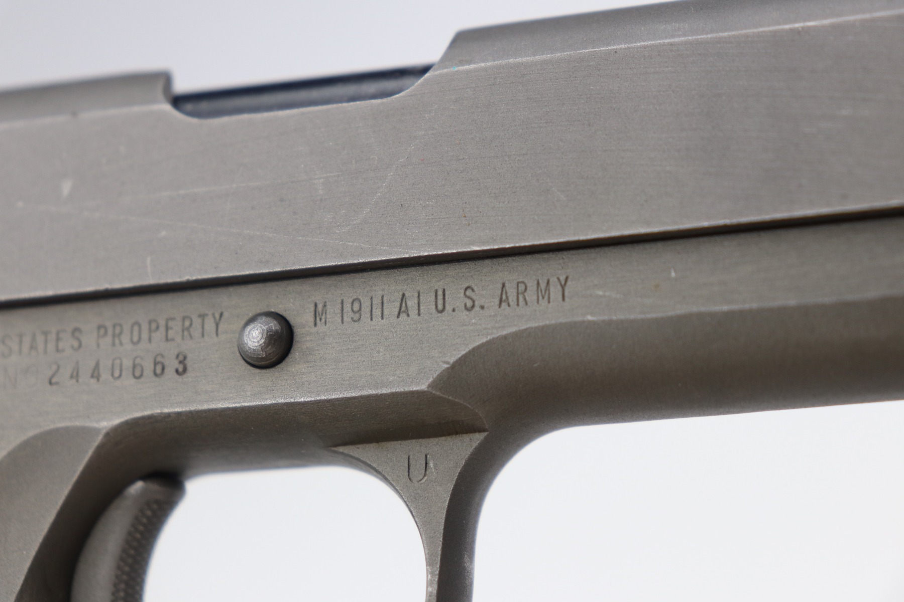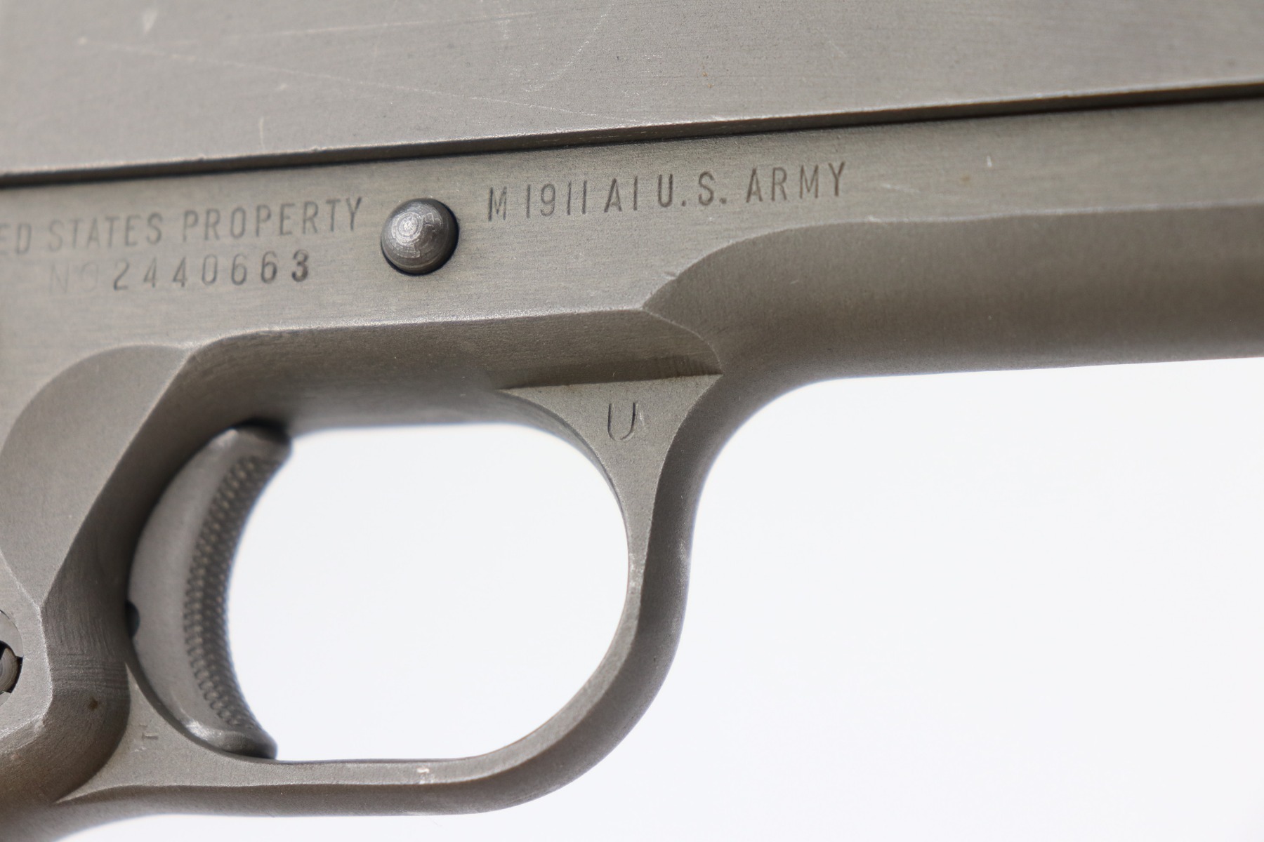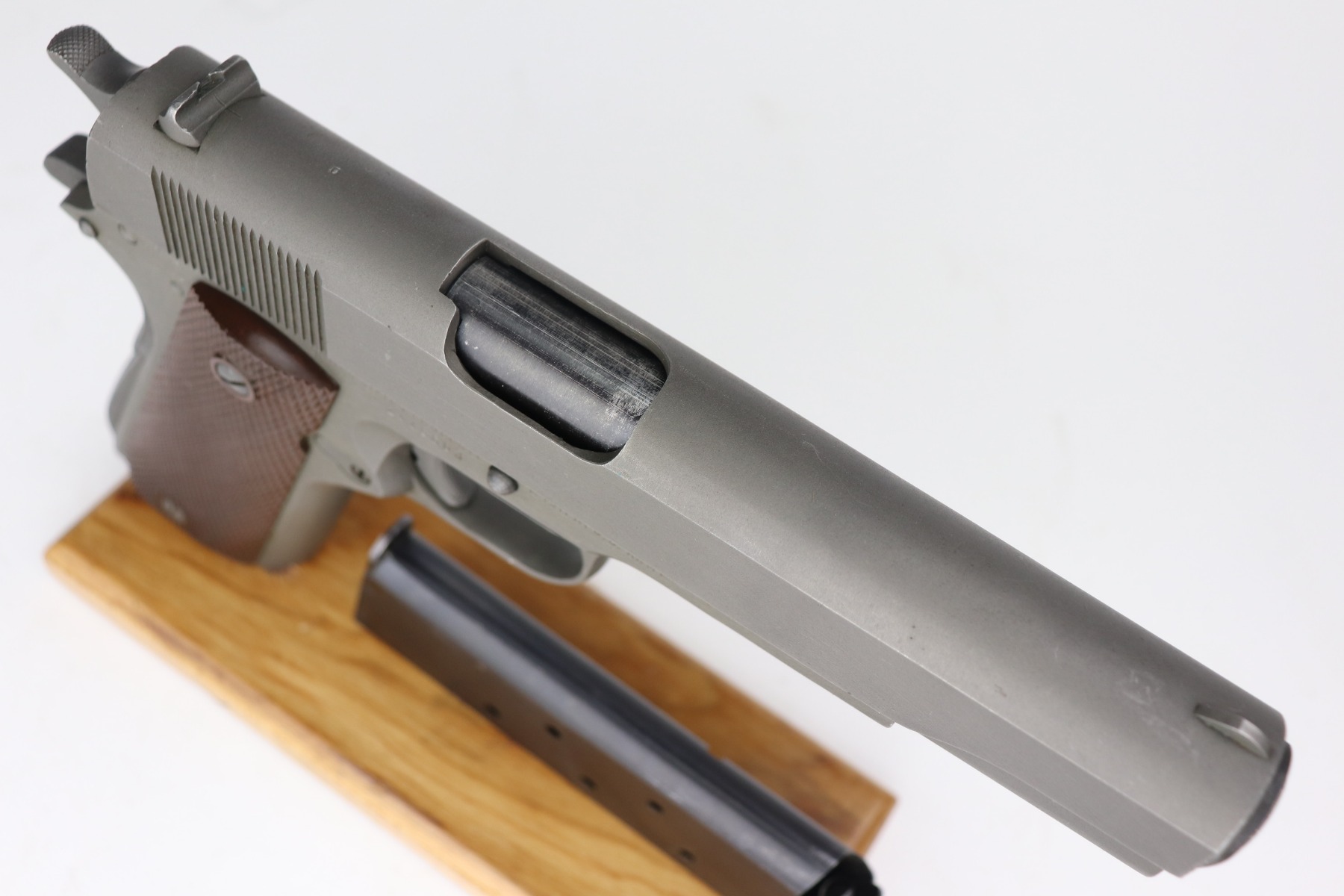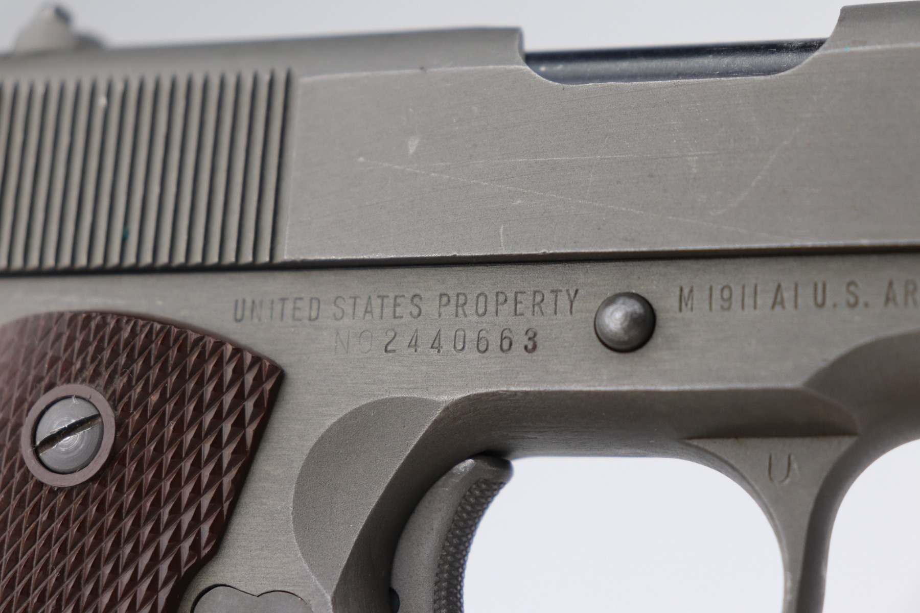 2/24/21 – This is a minty example of a Remington Rand Model 1911A1 issued to the US military in 1945. It is all correct and has the proper cross-canon military cartouche on the tang. Correct HI Standard barrel. It has retained about 98% of its original finish – just very minor general high edge wear. There is an area of light oxidation on the top of the slide. There are areas of minor discoloration on the underside and left side of the slide. Comes with excellent grips and a period-correct magazine. The bore is minty.