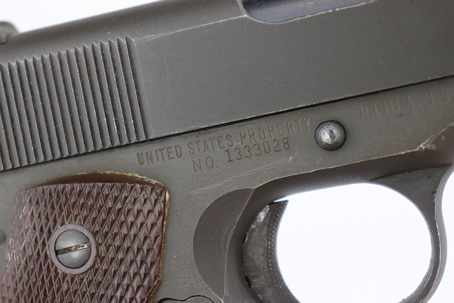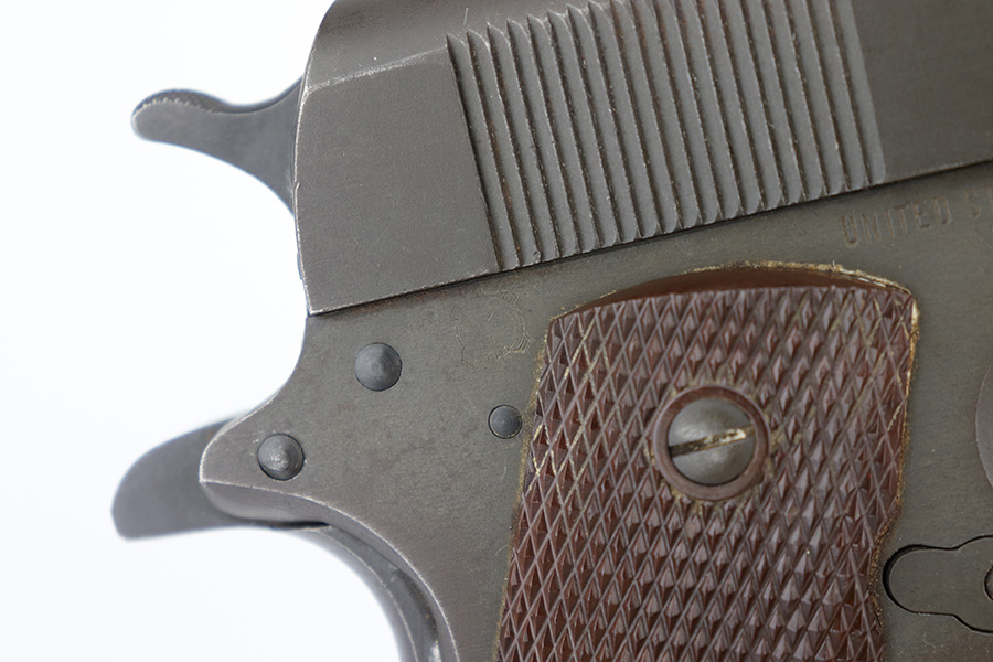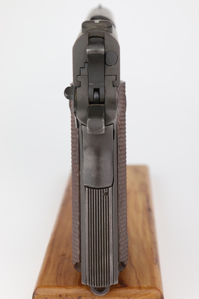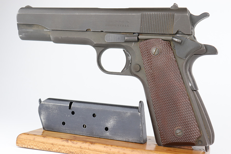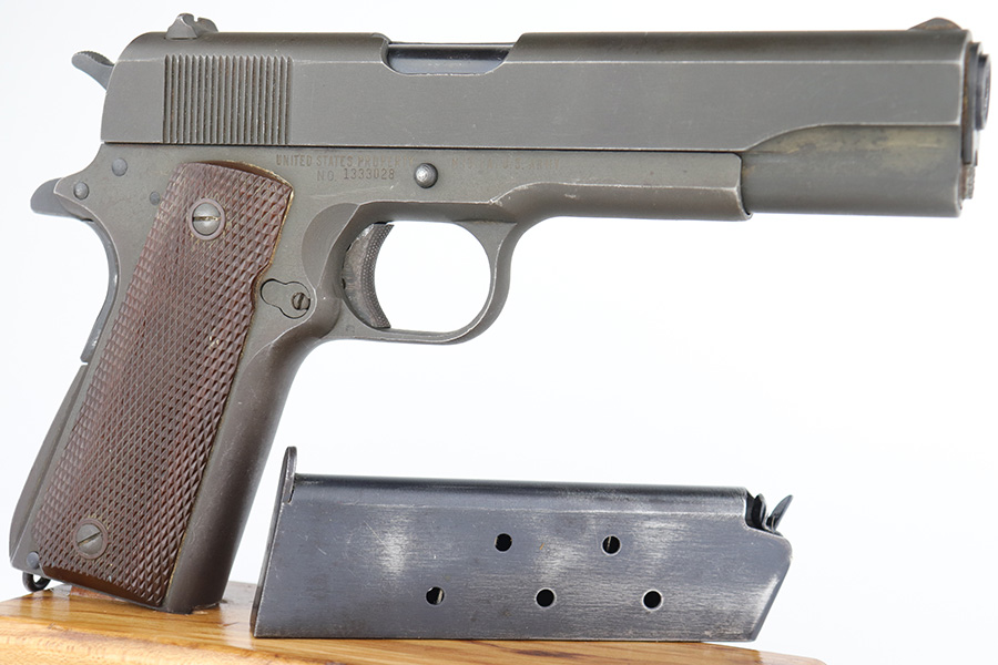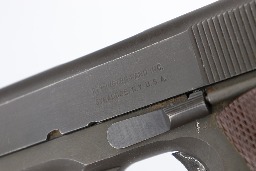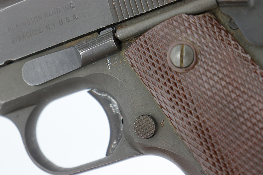 1/3/23 – This is a minty example of a Remington Rand Model 1911A1 issued to the US military in 1943. It is “United States Property” marked, has the proper “FJA” inspection stamp, and has a cross-canon military cartouche on the right side of the frame. Proper High Standard barrel. The gun has retained about 97-98% of its original parkerized finish. There is minor wear around the muzzle and some minor thinning and brown patina on the front strap. Brown patina and a couple of tiny pits on the grip safety. Fitted with a set of very nice period-correct reddish plastic grips. Comes with one period-correct “S” marked magazine. The bore has strong rifling with very minor frosting in the grooves.