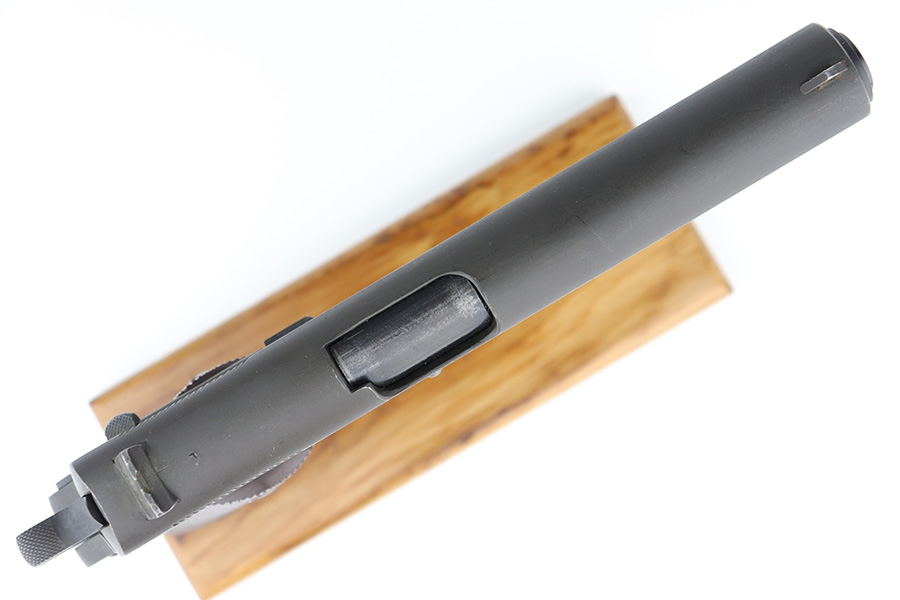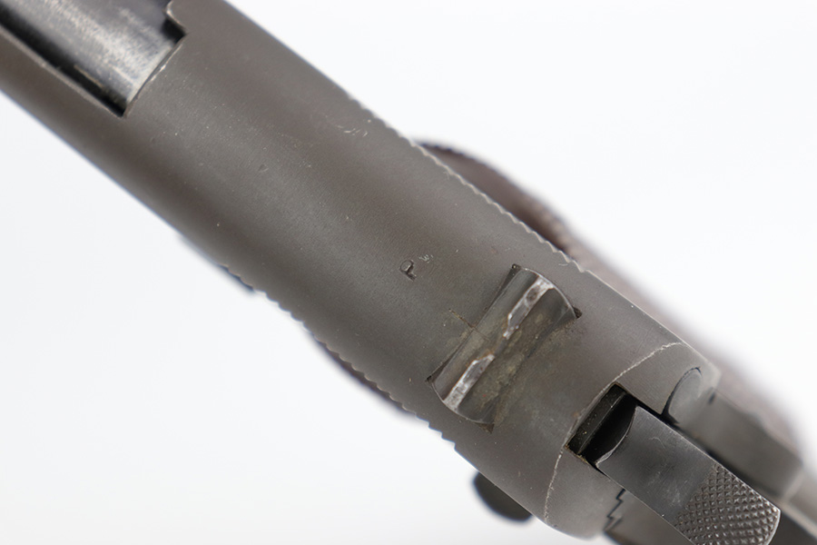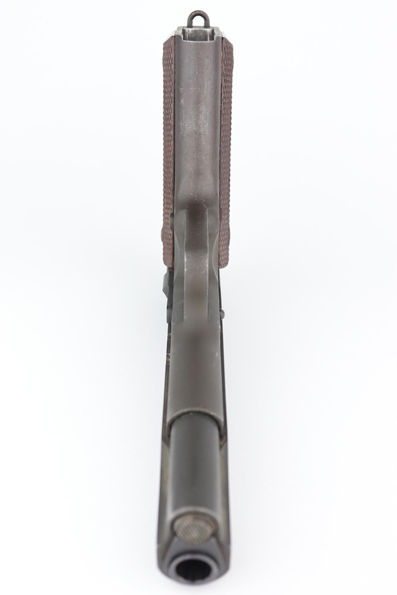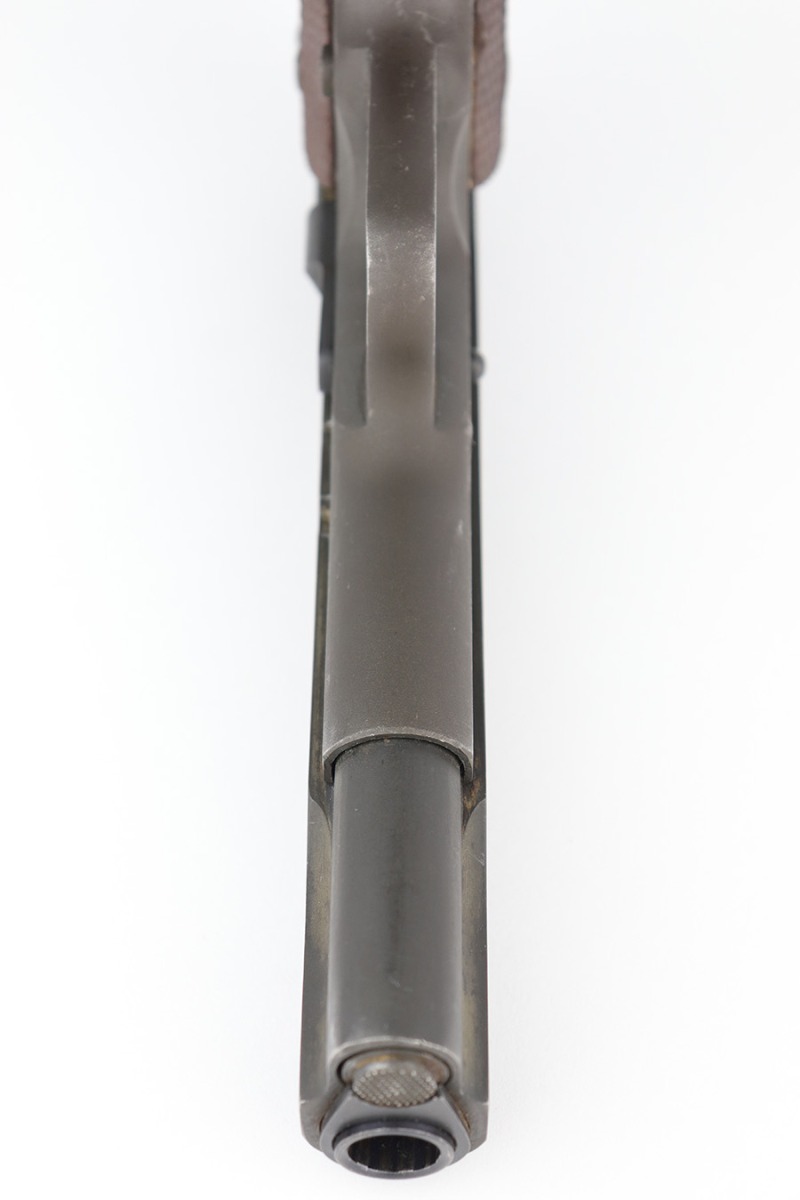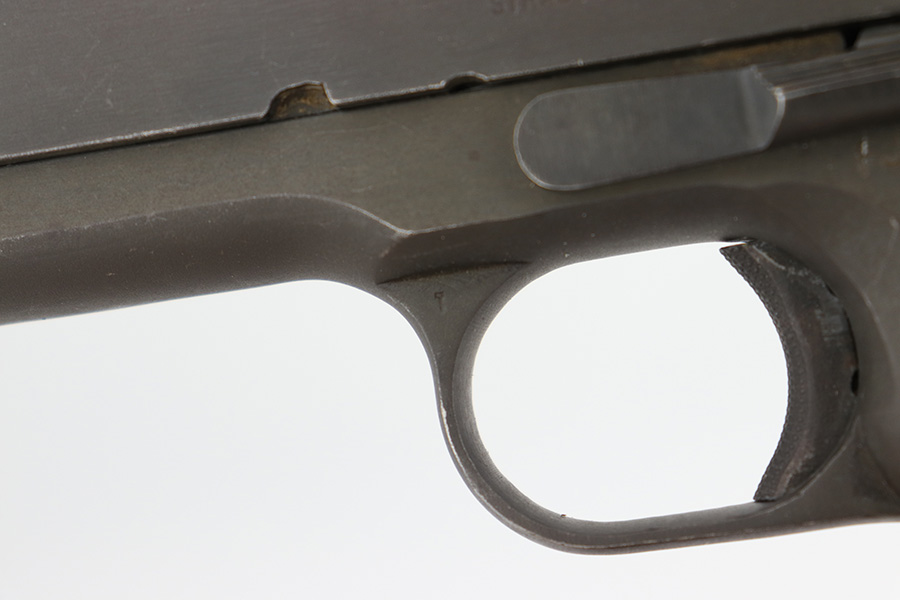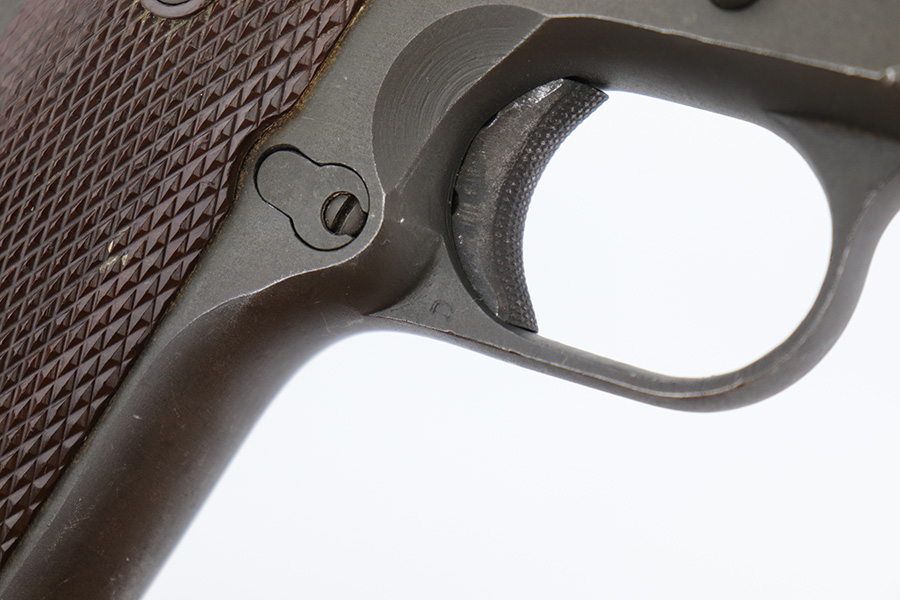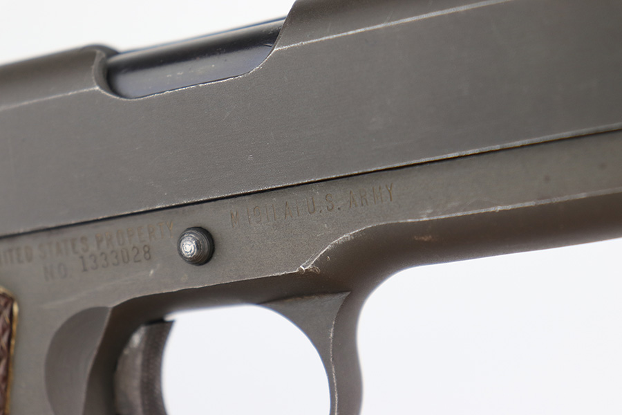 1/3/23 – This is a minty example of a Remington Rand Model 1911A1 issued to the US military in 1943. It is “United States Property” marked, has the proper “FJA” inspection stamp, and has a cross-canon military cartouche on the right side of the frame. Proper High Standard barrel. The gun has retained about 97-98% of its original parkerized finish. There is minor wear around the muzzle and some minor thinning and brown patina on the front strap. Brown patina and a couple of tiny pits on the grip safety. Fitted with a set of very nice period-correct reddish plastic grips. Comes with one period-correct “S” marked magazine. The bore has strong rifling with very minor frosting in the grooves.
