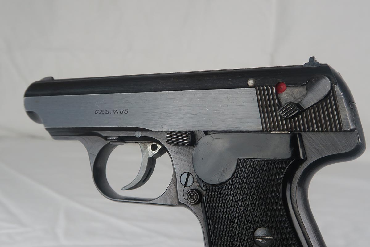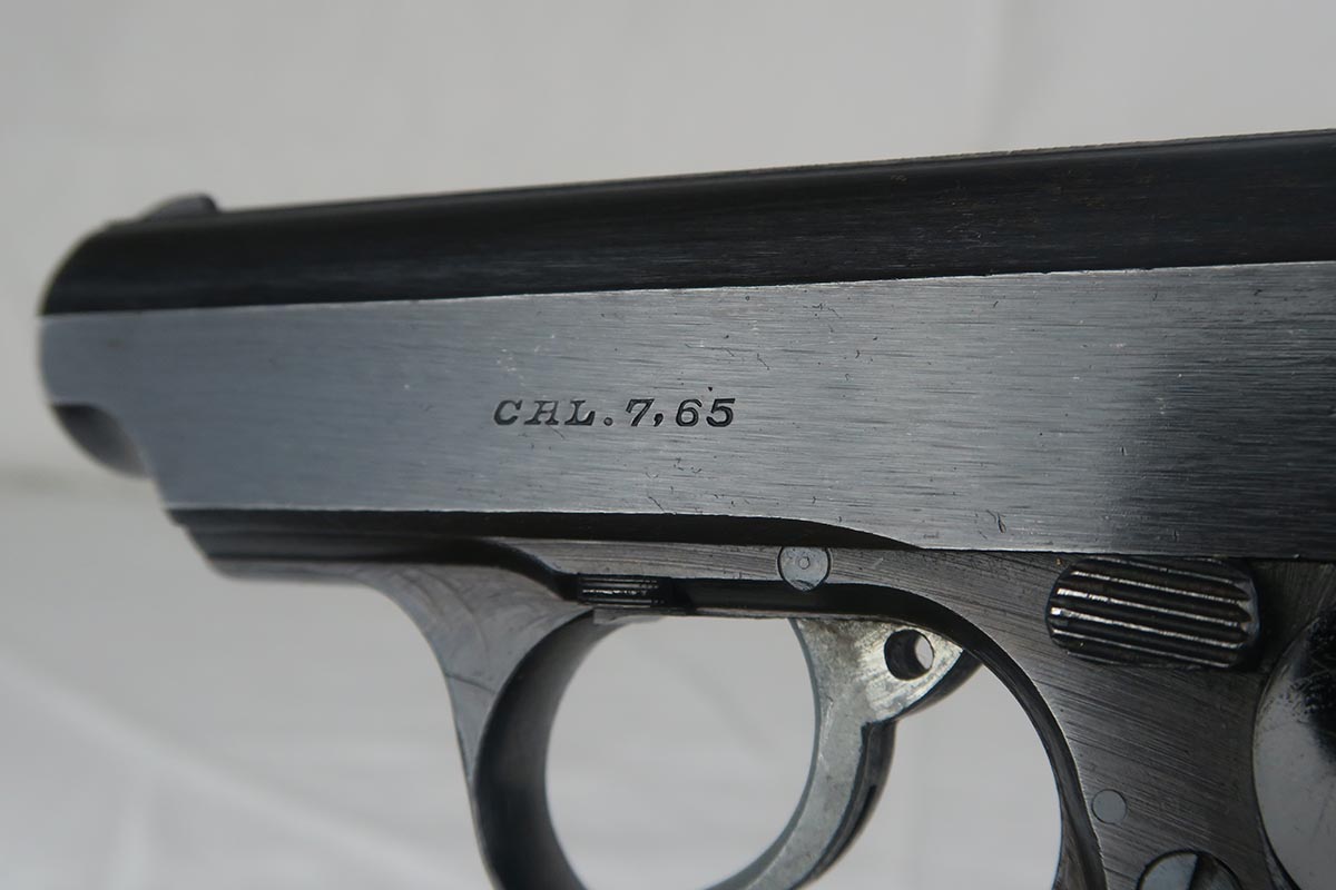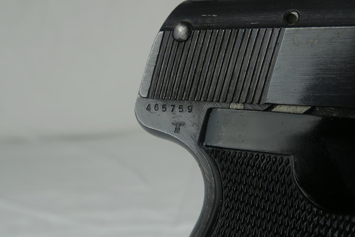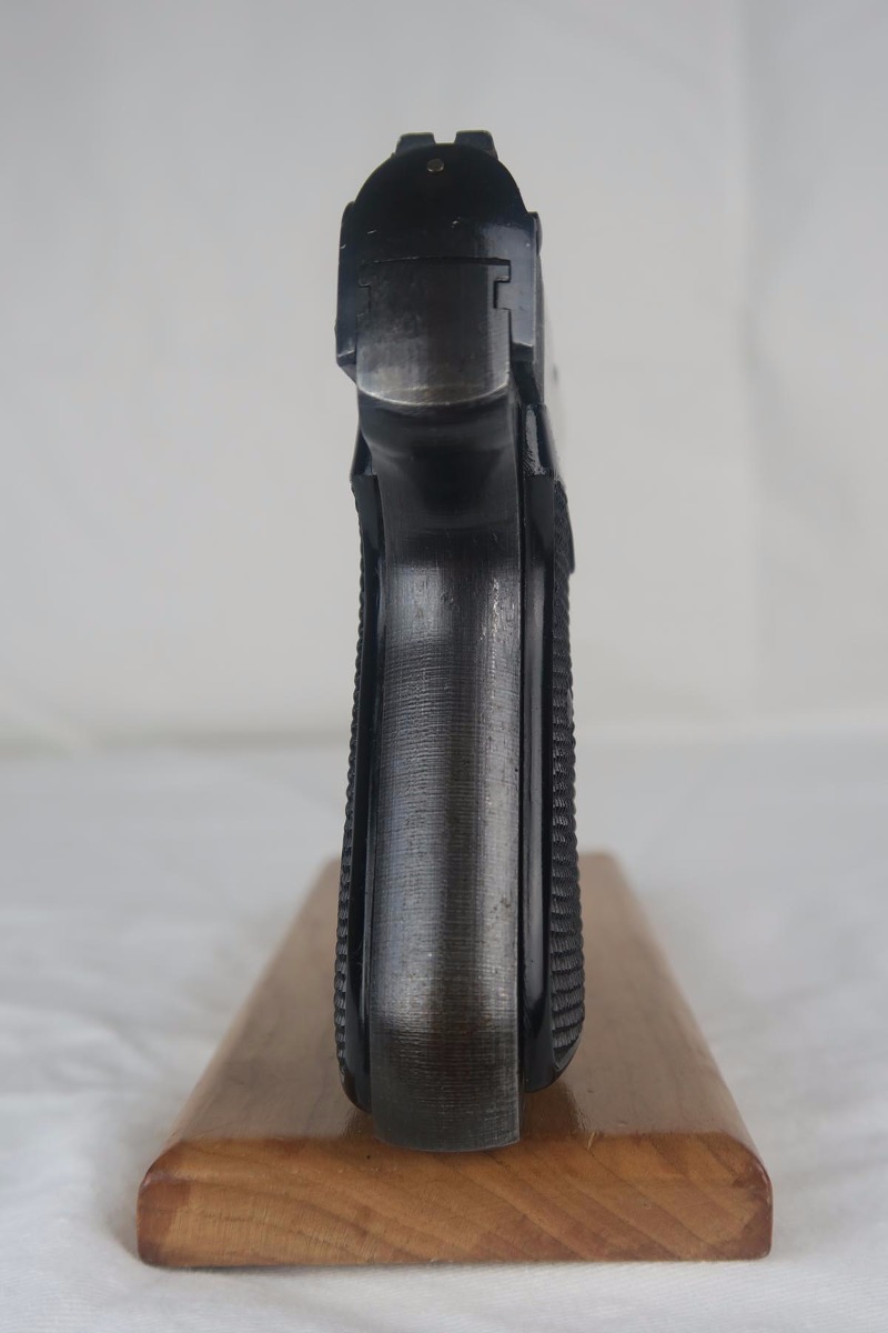 8/3/17 – This is a near-mint Sauer 38h from near the end of WW2. It is all original and correct with 99% of its dull military bluing remaining. There is only very minor muzzle/edge thinning, but generally near-perfect overall. Eagle/N on slide and frame. Minty bore. Excellent mag. Left grip panel does have a minor chip.