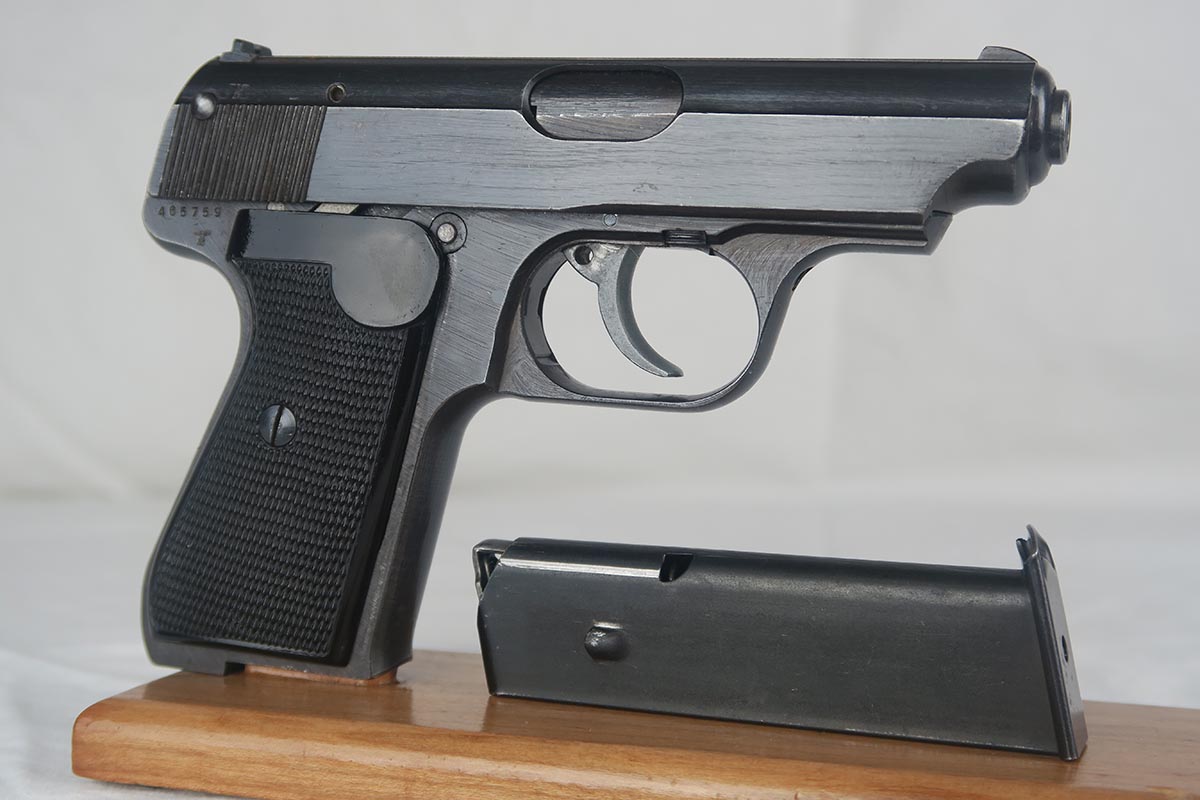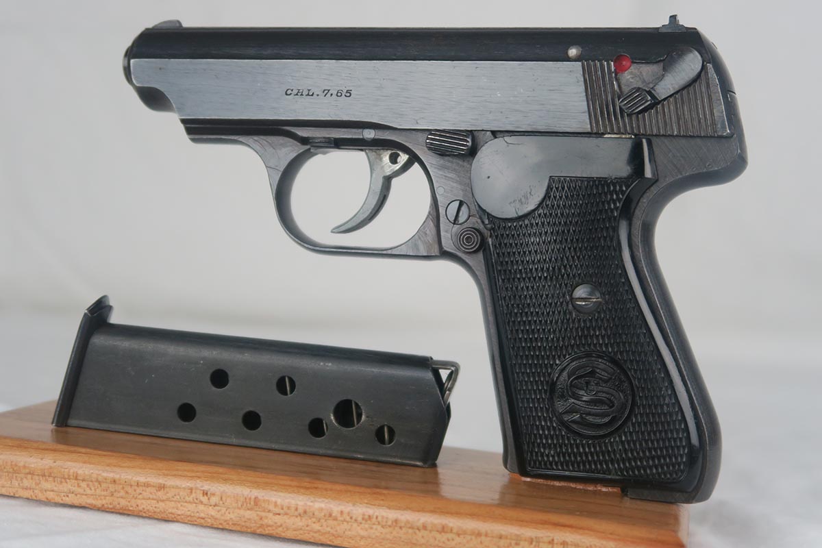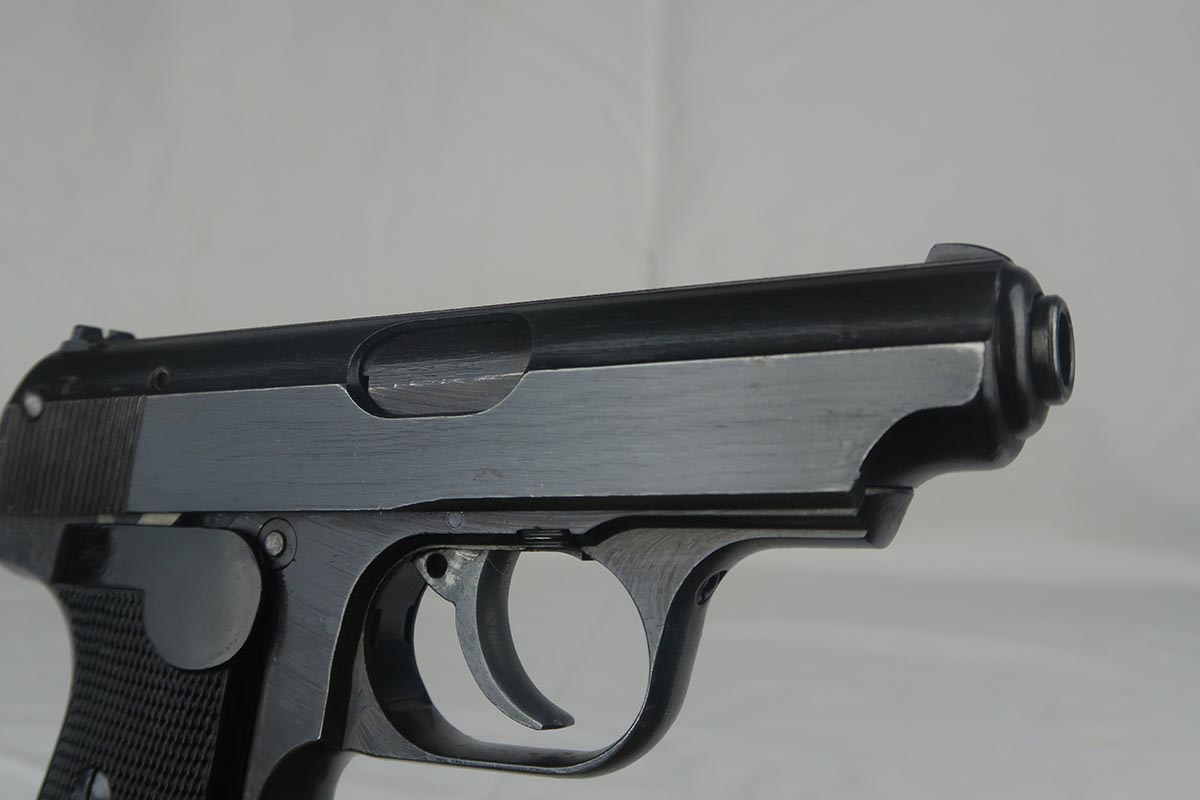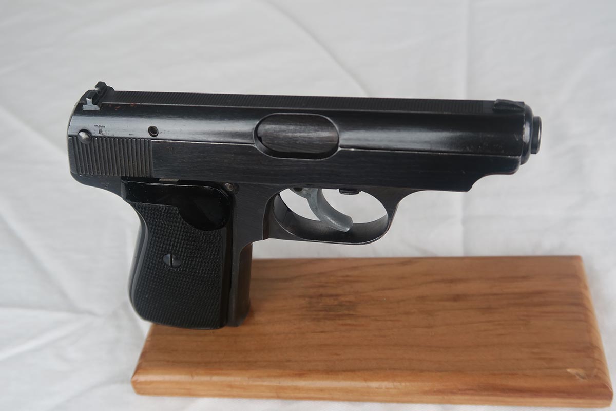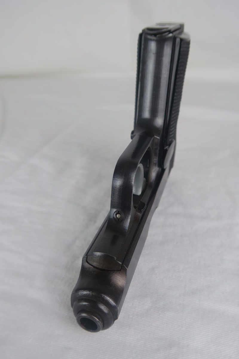 8/3/17 – This is a near-mint Sauer 38h from near the end of WW2. It is all original and correct with 99% of its dull military bluing remaining. There is only very minor muzzle/edge thinning, but generally near-perfect overall. Eagle/N on slide and frame. Minty bore. Excellent mag. Left grip panel does have a minor chip.