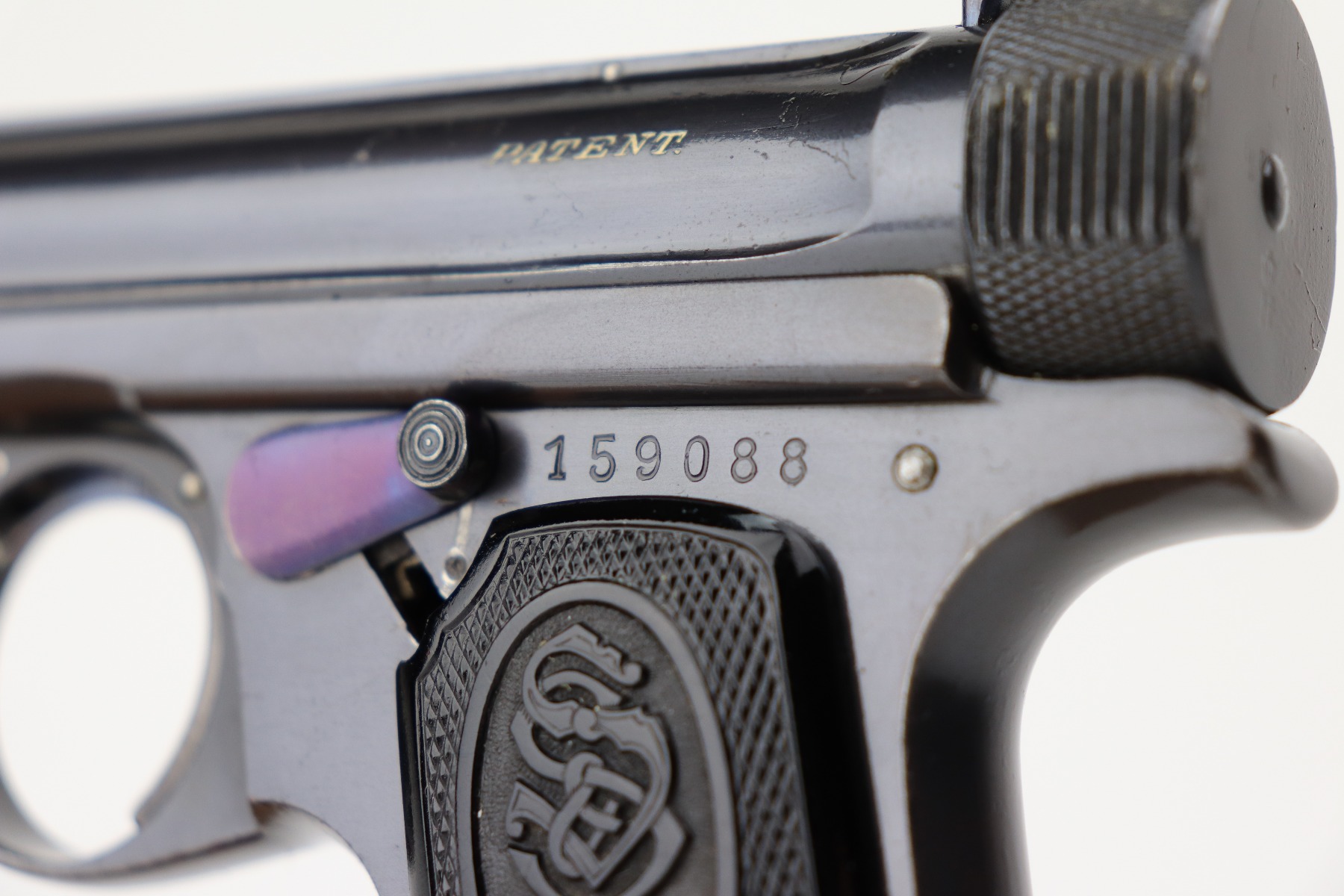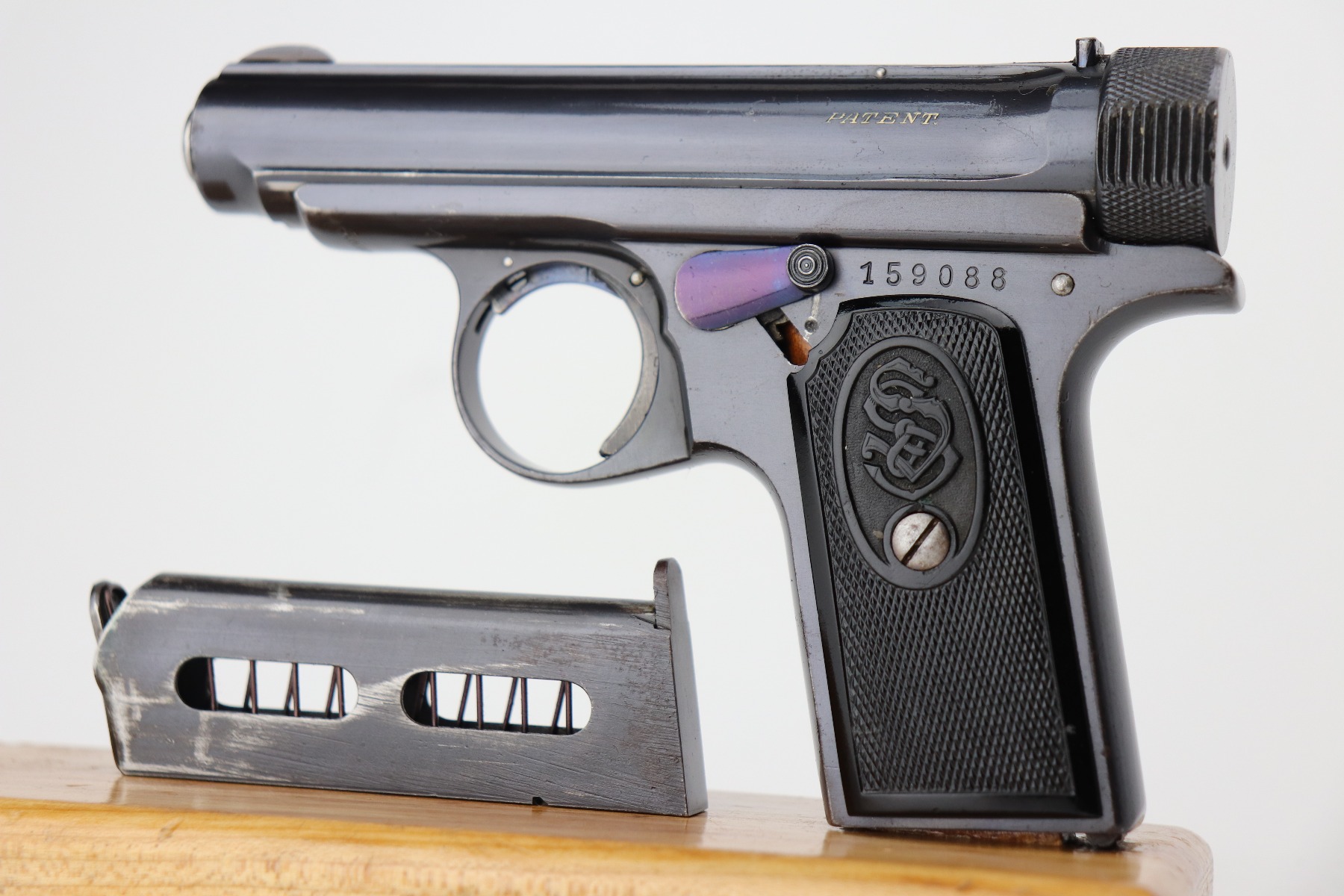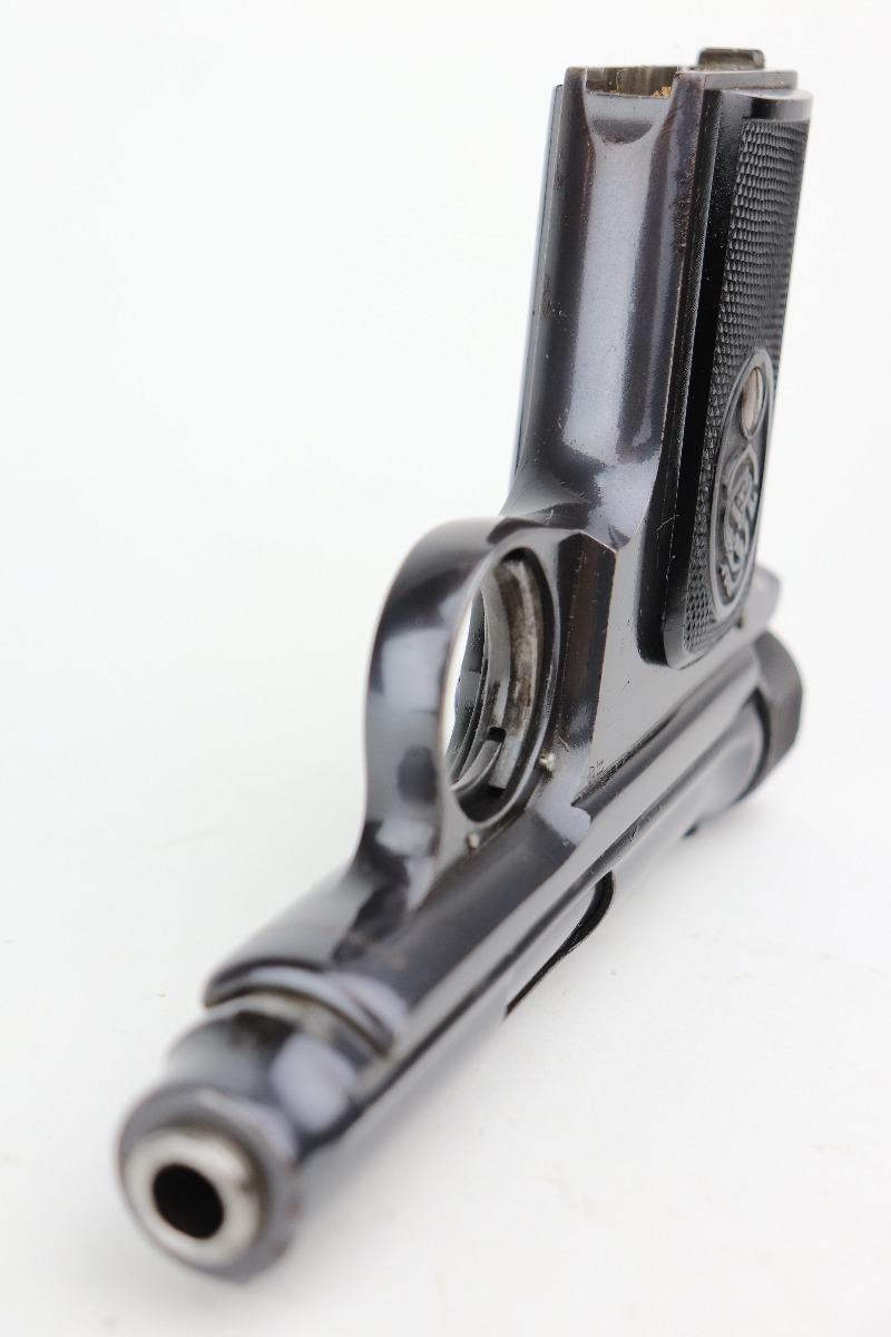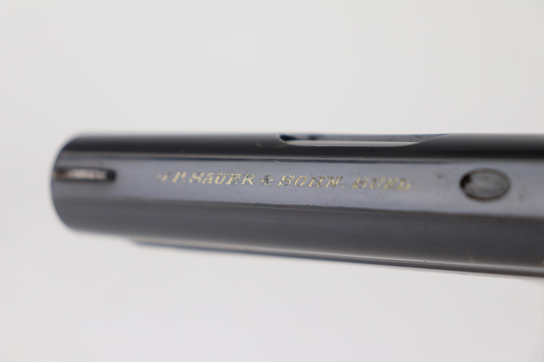 3/31/21 – This is a minty example of a Sauer Model 1913. This particular gun is of the third variant. It is matching and has the proper “Crown N” proofs. There is a “Germany” export marking on the underside of the frame, indicating it was sold in the international commercial market. It has retained about 98% of its finish with just a hint of wear on some of the high edges. Very minor pin-pricking on the straps. Comes with excellent grips and a period-correct magazine. The bore is near-mint. It looks like the additional safety lever is missing.