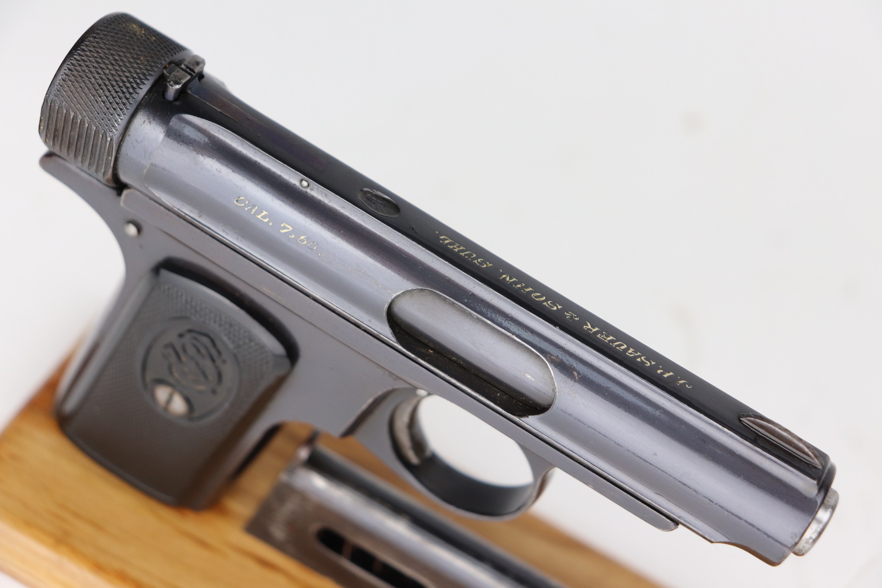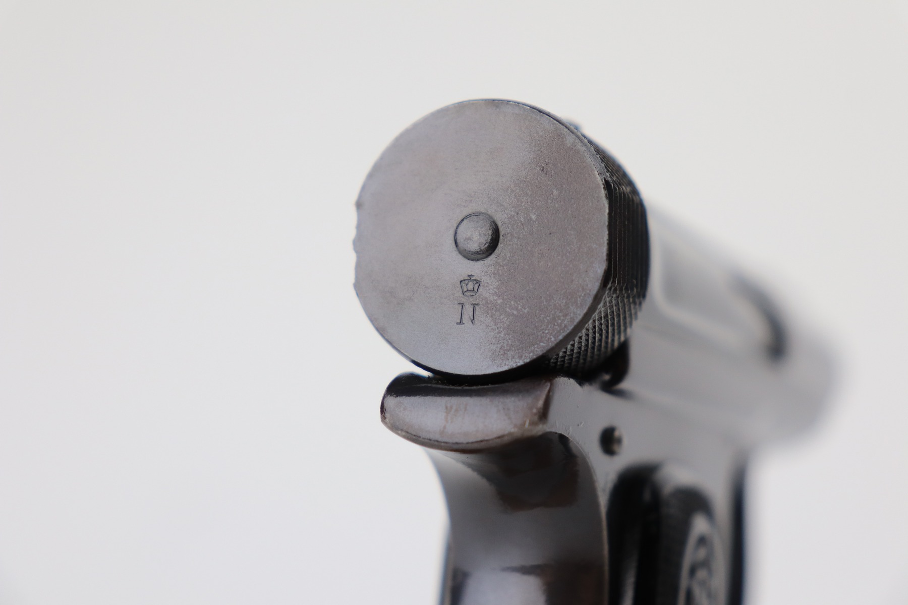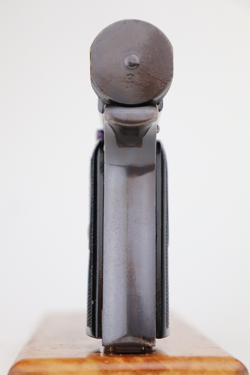 3/31/21 – This is a minty example of a Sauer Model 1913. This particular gun is of the third variant. It is matching and has the proper “Crown N” proofs. There is a “Germany” export marking on the underside of the frame, indicating it was sold in the international commercial market. It has retained about 98% of its finish with just a hint of wear on some of the high edges. Very minor pin-pricking on the straps. Comes with excellent grips and a period-correct magazine. The bore is near-mint. It looks like the additional safety lever is missing.