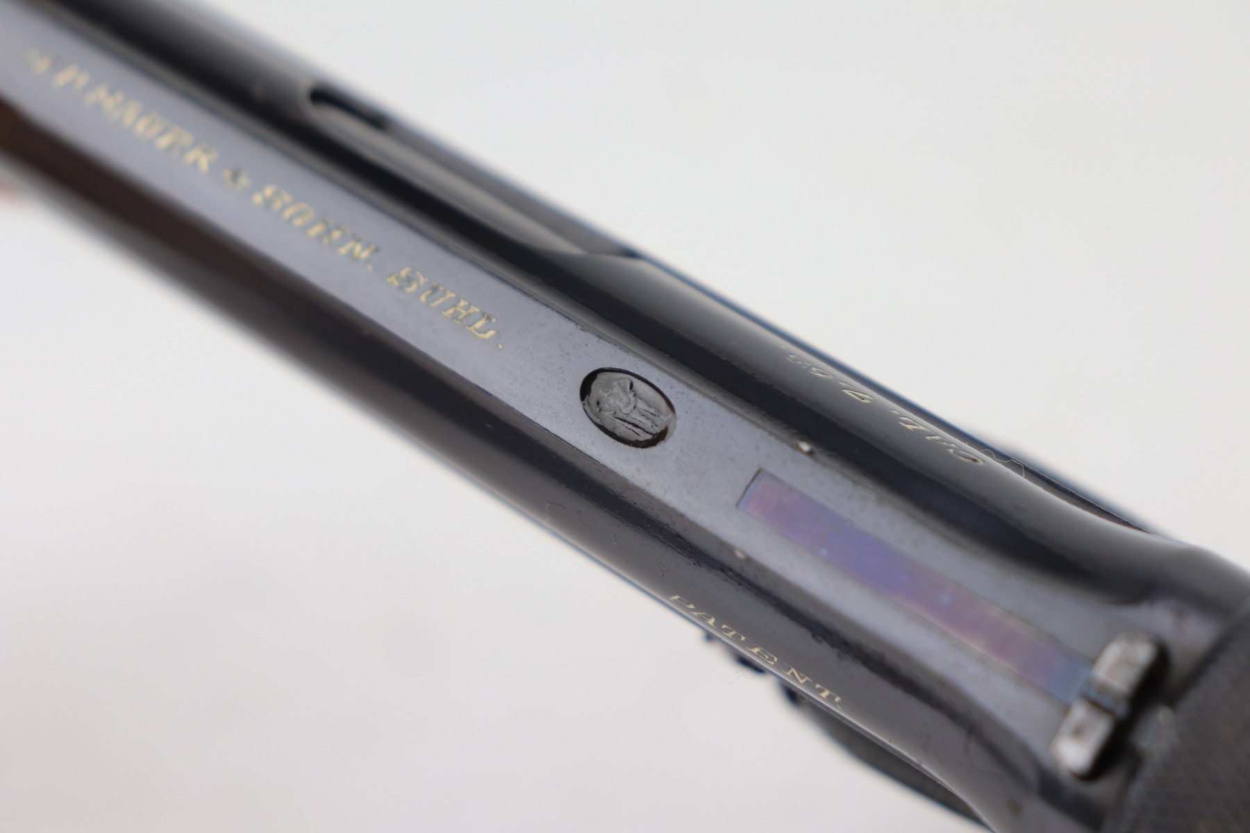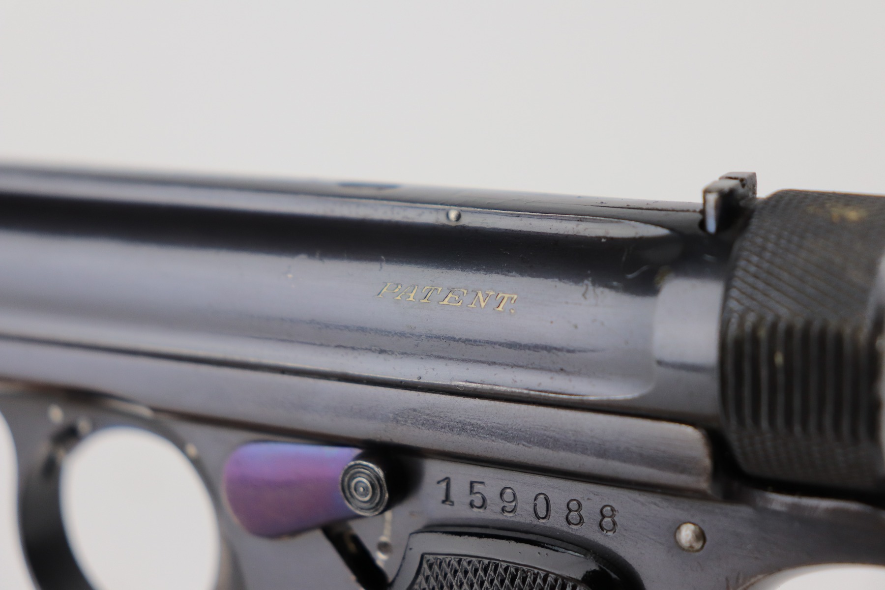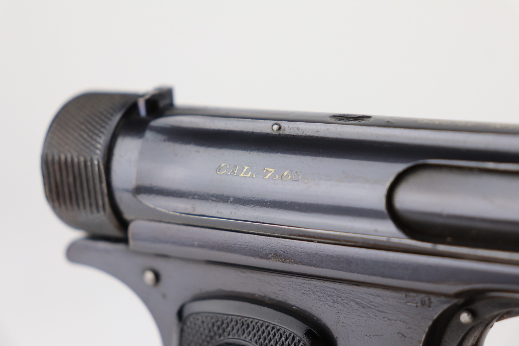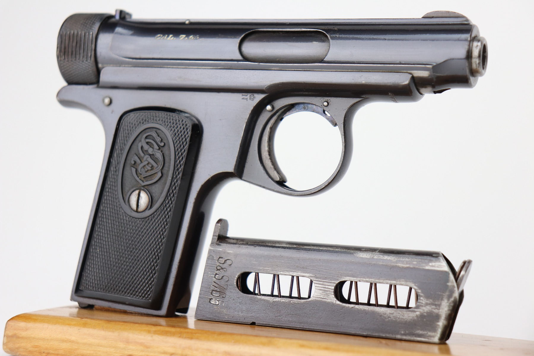 3/31/21 – This is a minty example of a Sauer Model 1913. This particular gun is of the third variant. It is matching and has the proper “Crown N” proofs. There is a “Germany” export marking on the underside of the frame, indicating it was sold in the international commercial market. It has retained about 98% of its finish with just a hint of wear on some of the high edges. Very minor pin-pricking on the straps. Comes with excellent grips and a period-correct magazine. The bore is near-mint. It looks like the additional safety lever is missing.