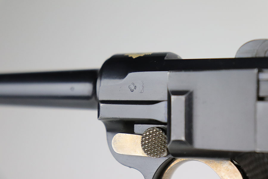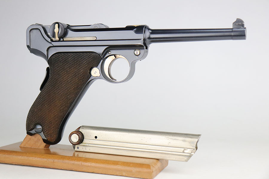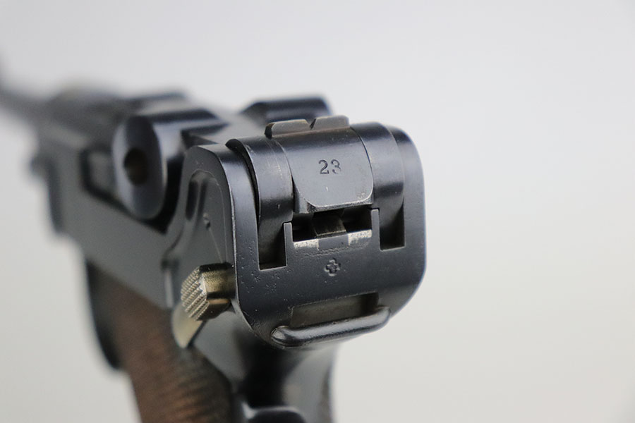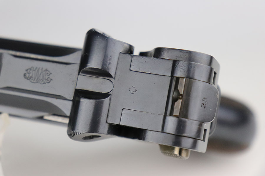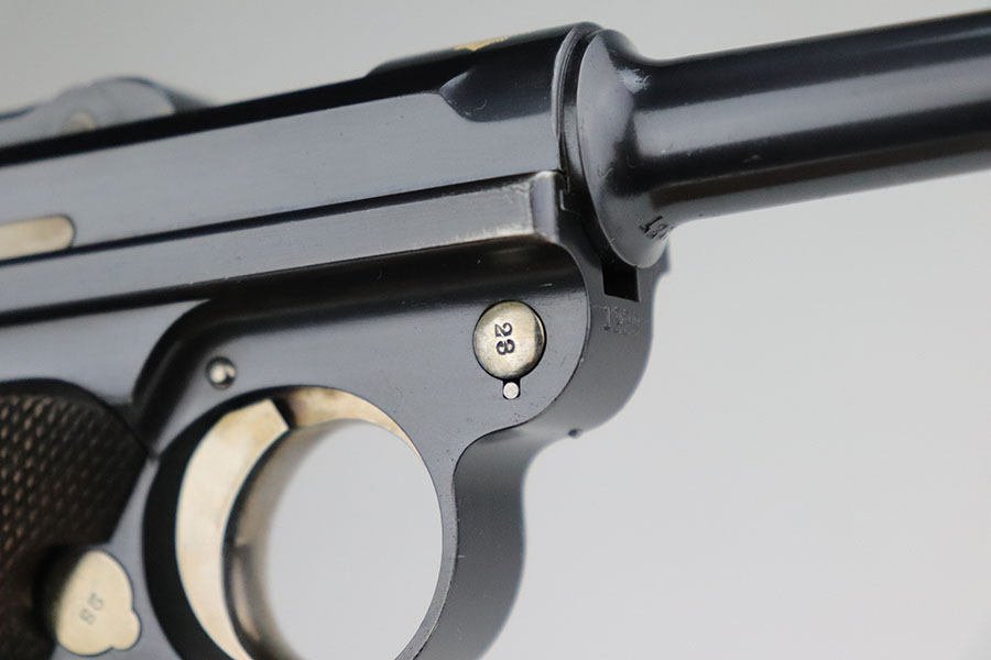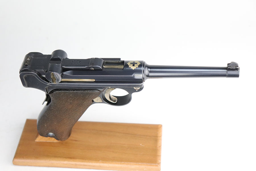 8/14/24 – This is a minty example of an early Swiss contract DWM Luger. It’s a Model 1900 variation with dish toggle and wide trigger guard. There’s just a hint of high point wear, and a tiny bit of finish loss on the back strap. Swiss cross in sunburst over chamber. Minty bore, chambered for .30 Luger. Correct magazine. Excellent grips that are numbered and matching to the gun. Comes with an original holster. Robert Saltsman collection.