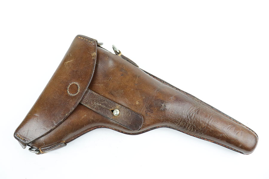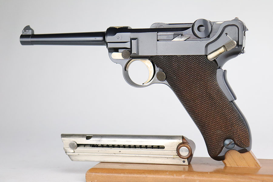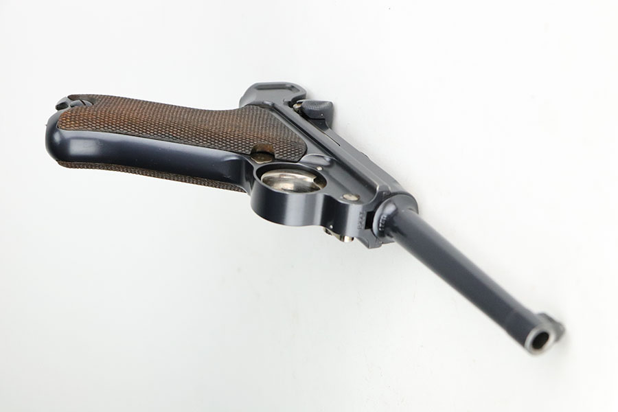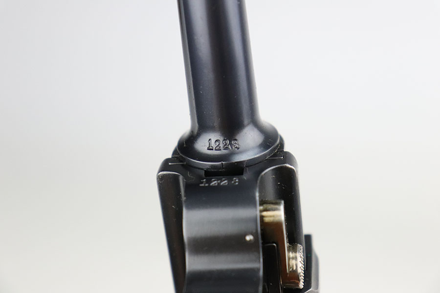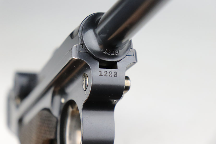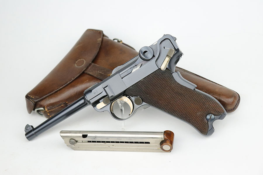 8/14/24 – This is a minty example of an early Swiss contract DWM Luger. It’s a Model 1900 variation with dish toggle and wide trigger guard. There’s just a hint of high point wear, and a tiny bit of finish loss on the back strap. Swiss cross in sunburst over chamber. Minty bore, chambered for .30 Luger. Correct magazine. Excellent grips that are numbered and matching to the gun. Comes with an original holster. Robert Saltsman collection.