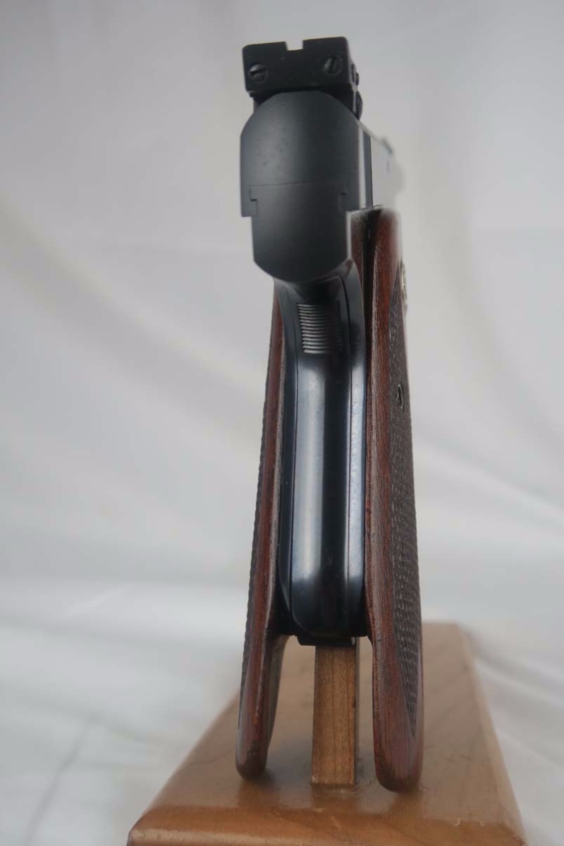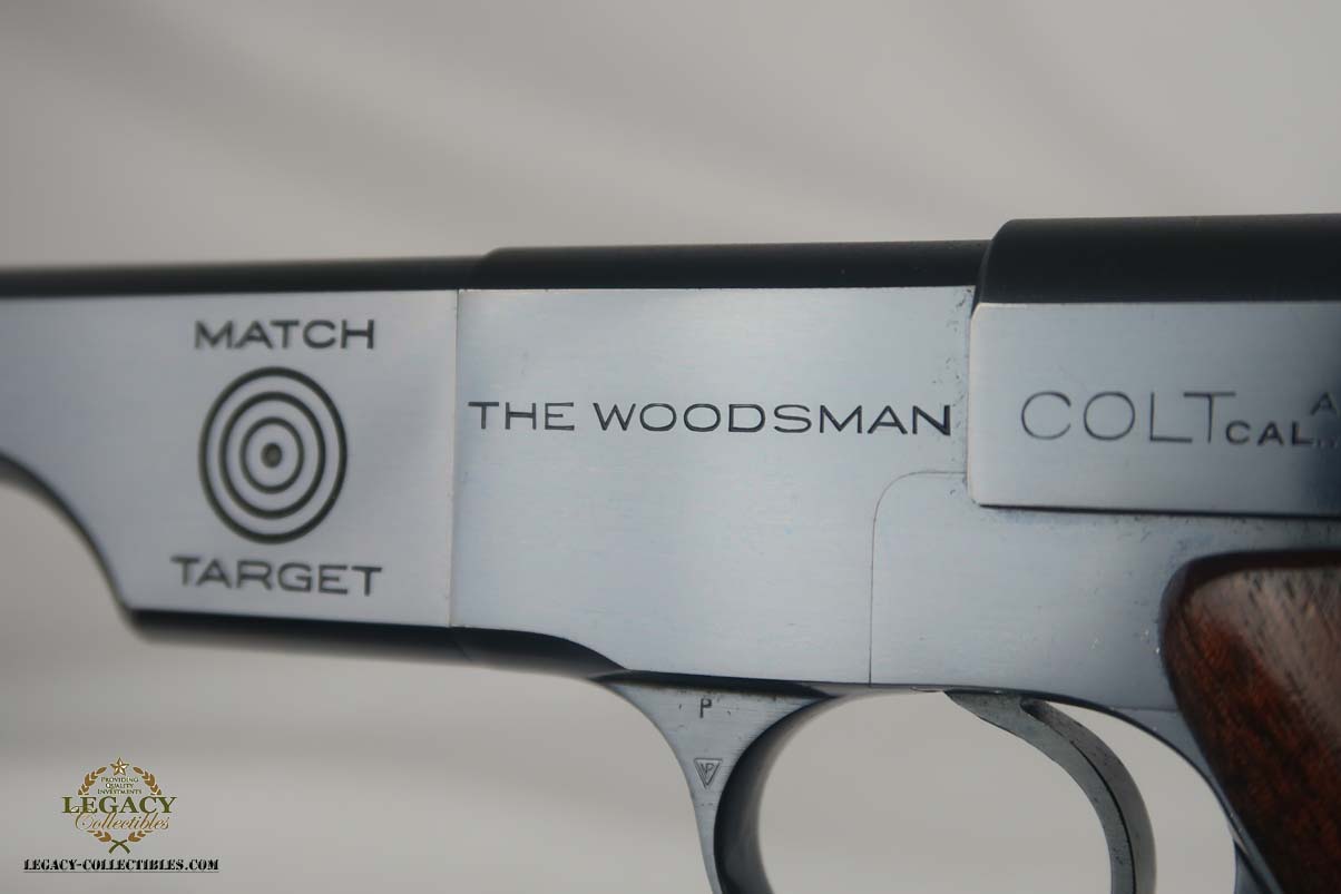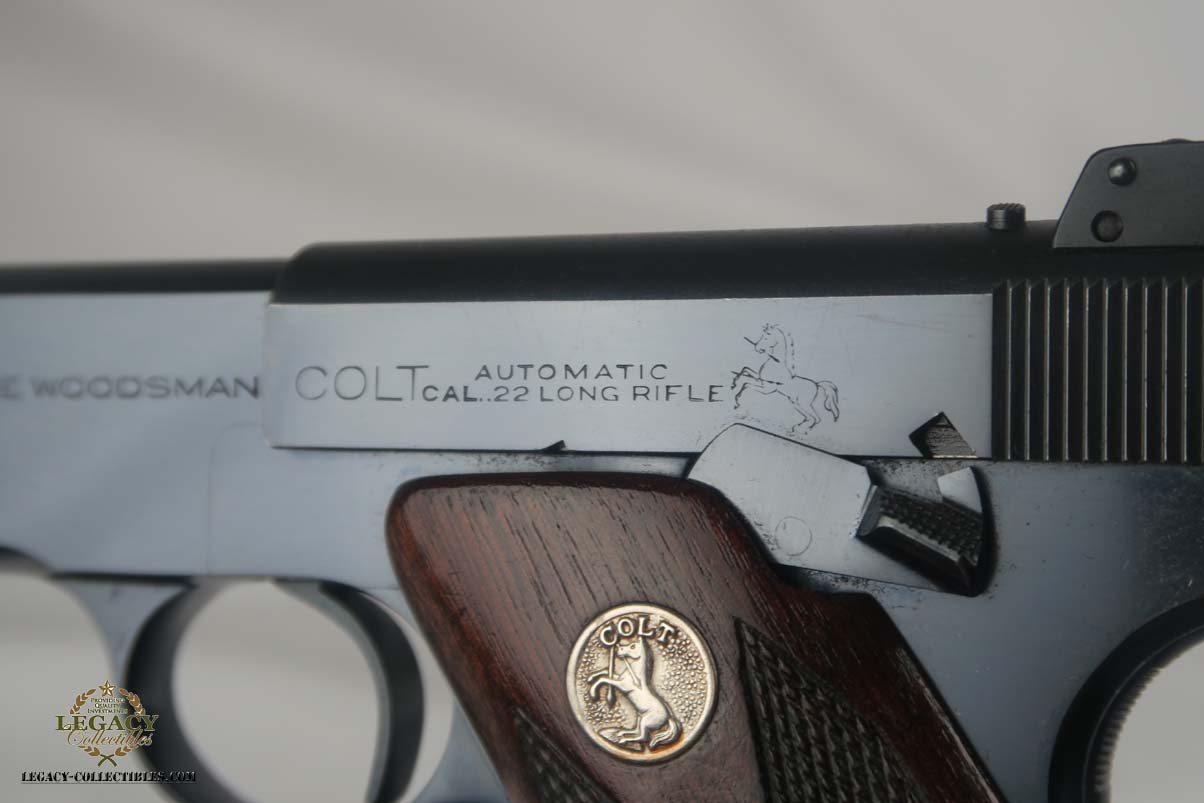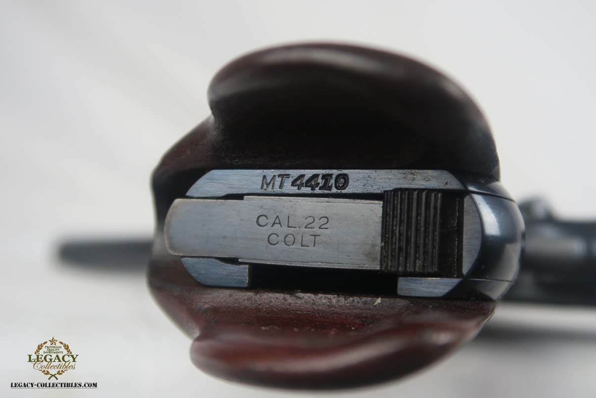 3/27/17 – This is an absolutely beautiful and hard to find Colt Woodsman Match Target, 1st Bullseye Series. The serial number dates this pistol to somewhere in the middle of 1939, before the United States joined the fight abroad. Between 1938 and 1944, only about 15,000 of these were produced, and it would be very difficutl to find one that has been maintained as well as the one we have listed here. The finish is a genuine 99+%, with just the slightest amount of freckling on the right side behind the grips. The “Elephant Ear” grips are also rare and minty, with no chips or scratches, which are common given the way the ears extend beyond the frame. Rare and original two-tone magazine,. Mirror bore.