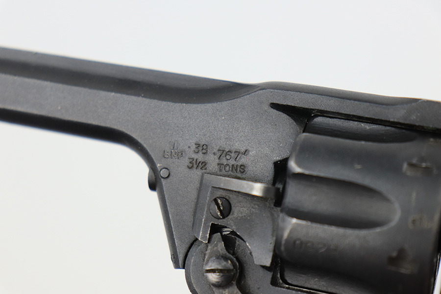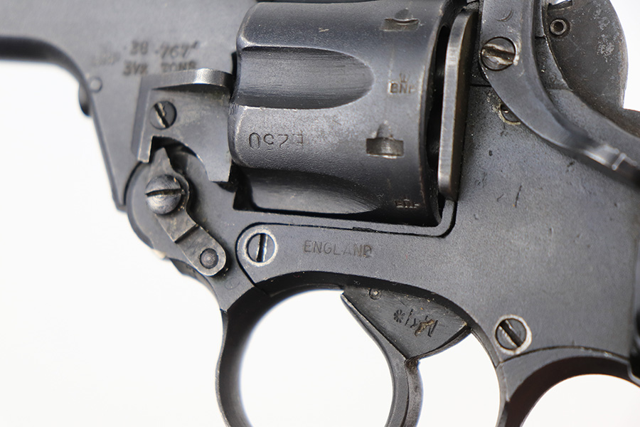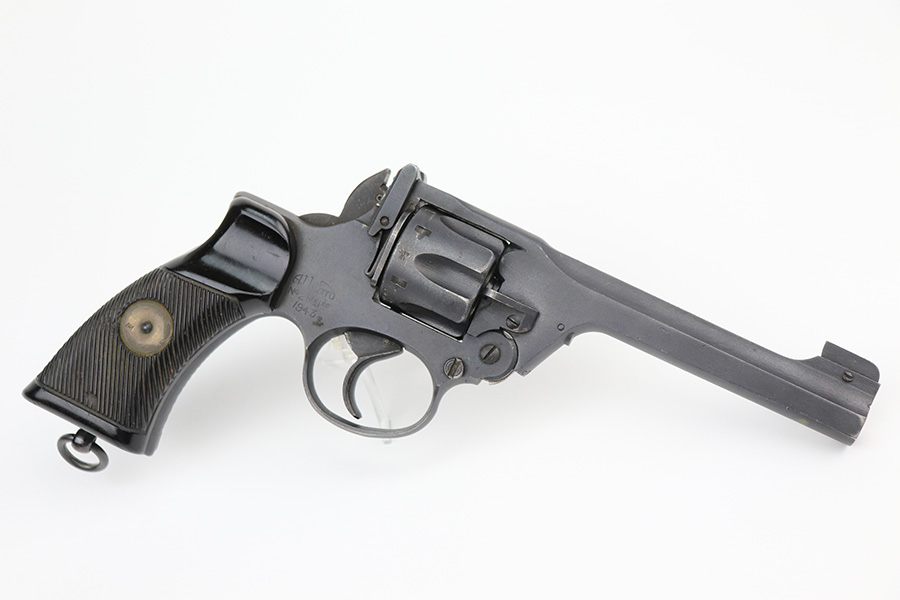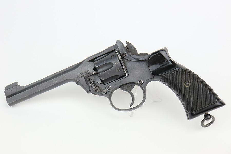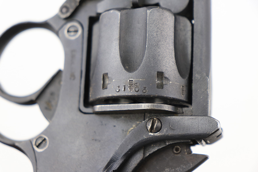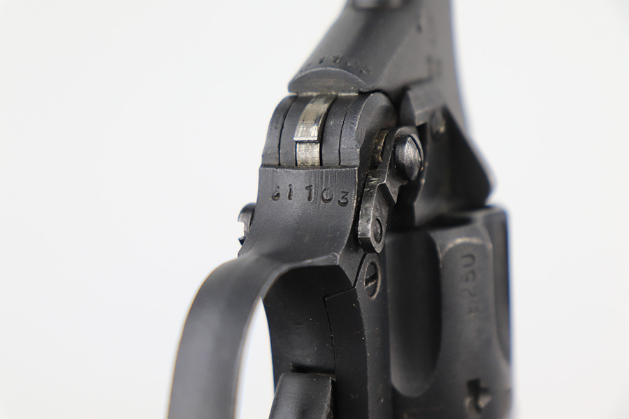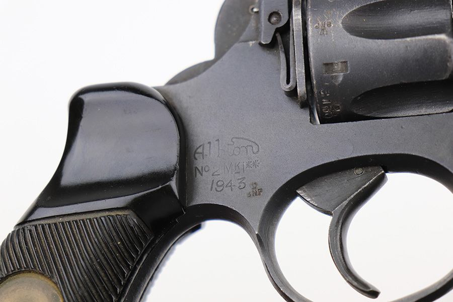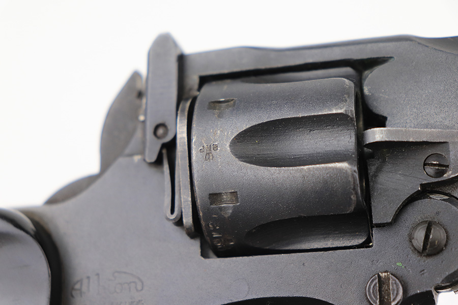 3/16/22 – This is a near-mint example of a rare No 2 Mk 1** revolver manufactured by Albion Motors in Scotland in 1943, and has the five inch barrel. Albion is a much scarcer maker than Enfield. It is all matching and has the proper British proofs. There is a white painted “17” on the base of the frame – we believe this a rack number. The gun has retained nearly all of its finish. There is very minor wear on the high edges of the cylinder and just a hint of a roll mark. On the underside of the barrel, there is one tiny dot of wear and one small spot of what looks like dried old adhesive. Comes with nice period-correct black bakelite grips. There are some tiny dings and both sides and one small chip on the right side. Mint bore.