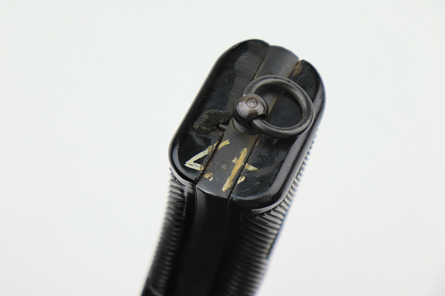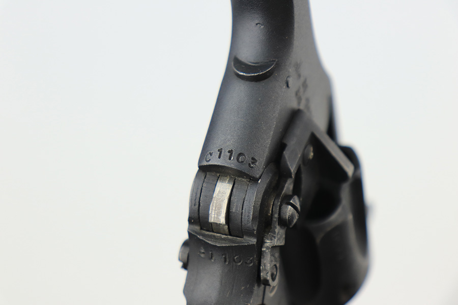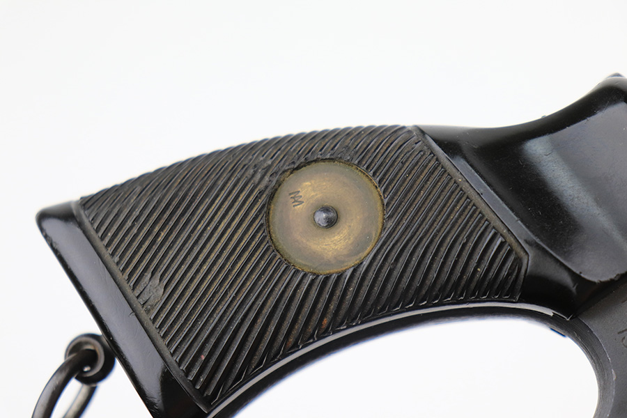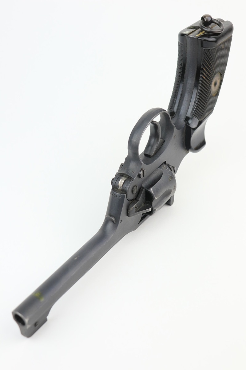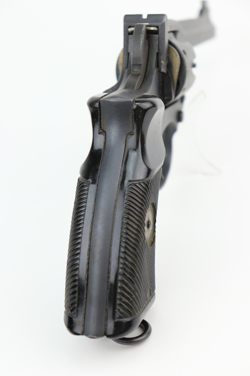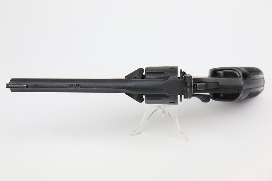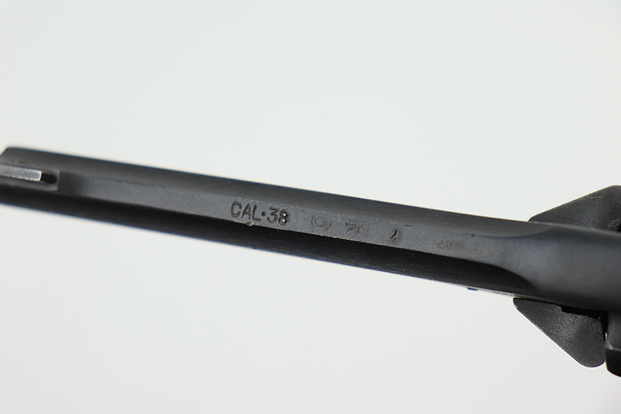 3/16/22 – This is a near-mint example of a rare No 2 Mk 1** revolver manufactured by Albion Motors in Scotland in 1943, and has the five inch barrel. Albion is a much scarcer maker than Enfield. It is all matching and has the proper British proofs. There is a white painted “17” on the base of the frame – we believe this a rack number. The gun has retained nearly all of its finish. There is very minor wear on the high edges of the cylinder and just a hint of a roll mark. On the underside of the barrel, there is one tiny dot of wear and one small spot of what looks like dried old adhesive. Comes with nice period-correct black bakelite grips. There are some tiny dings and both sides and one small chip on the right side. Mint bore.