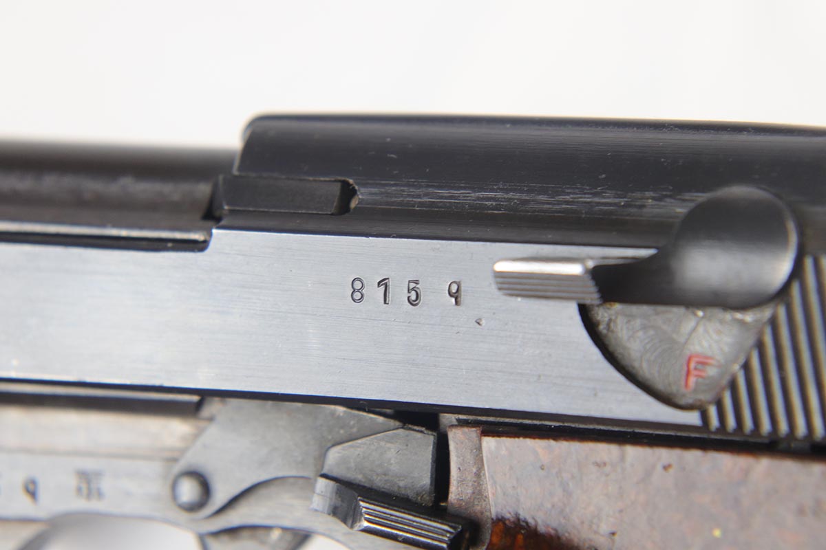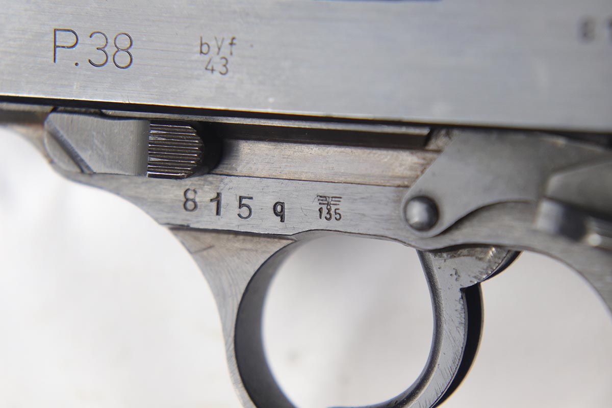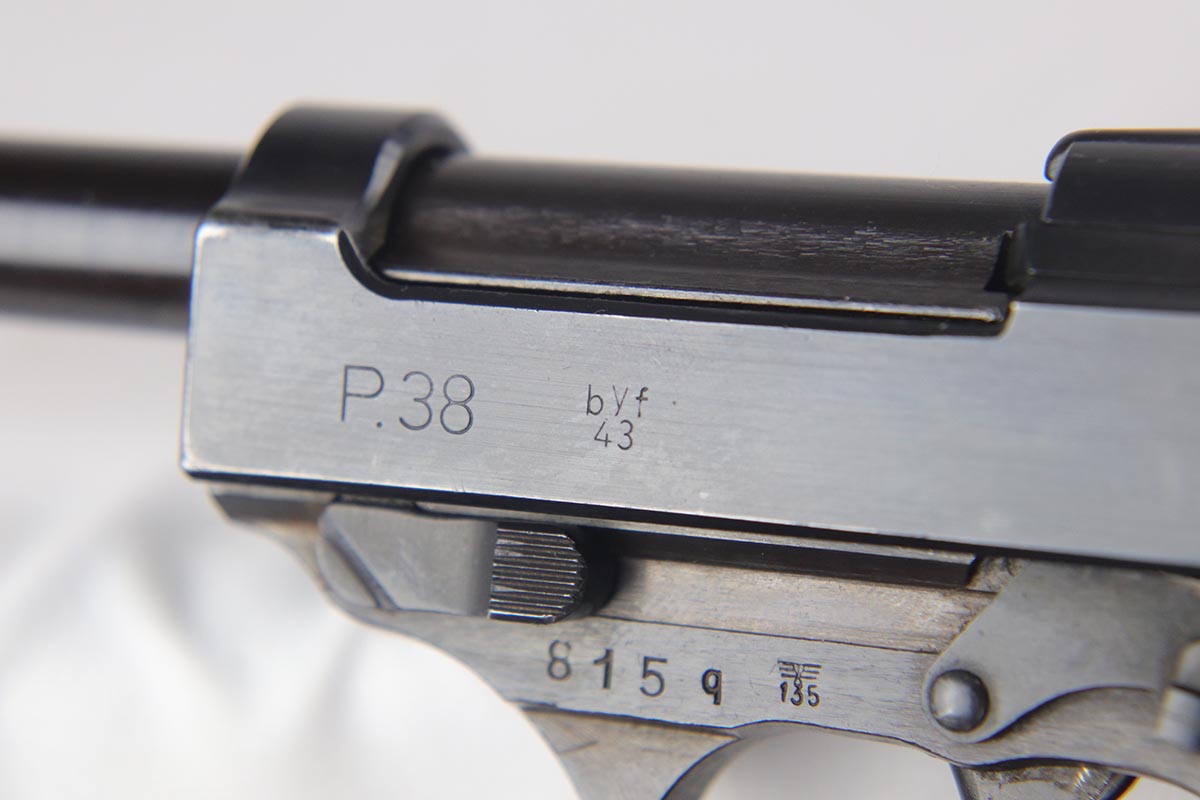 7/13/18 – This is a minty, desirable Mauser P.38 from 1943, with mixed acceptance proofs on the right side of the slide.  This variation rarely lasts long on the site!  The pistol is all matching and original with 98% blue remaining.  There is only minor edge and muzzle wear.  Excellent reddish grips and a terrifc bore.  Comes with a waffen marked, softshell holster that is ’44 dated.
