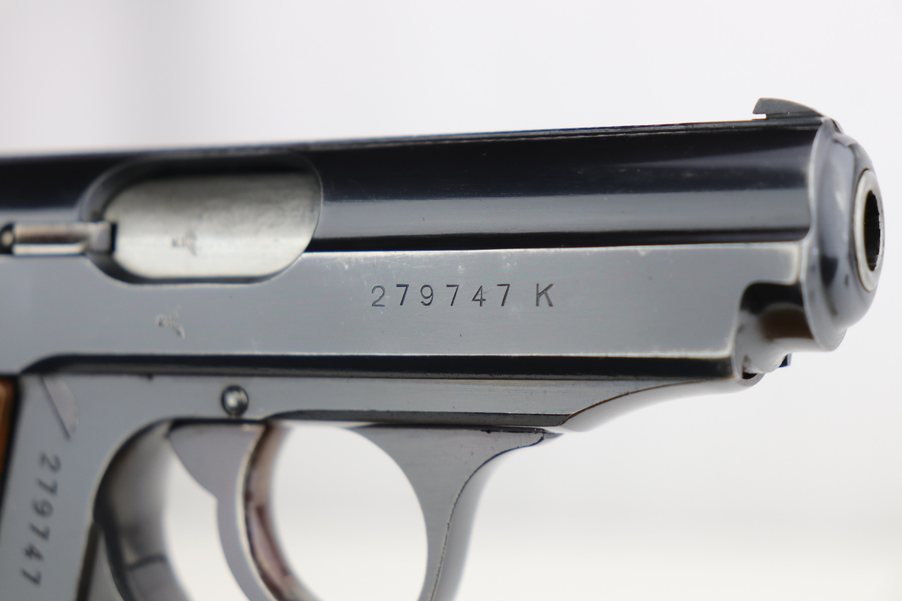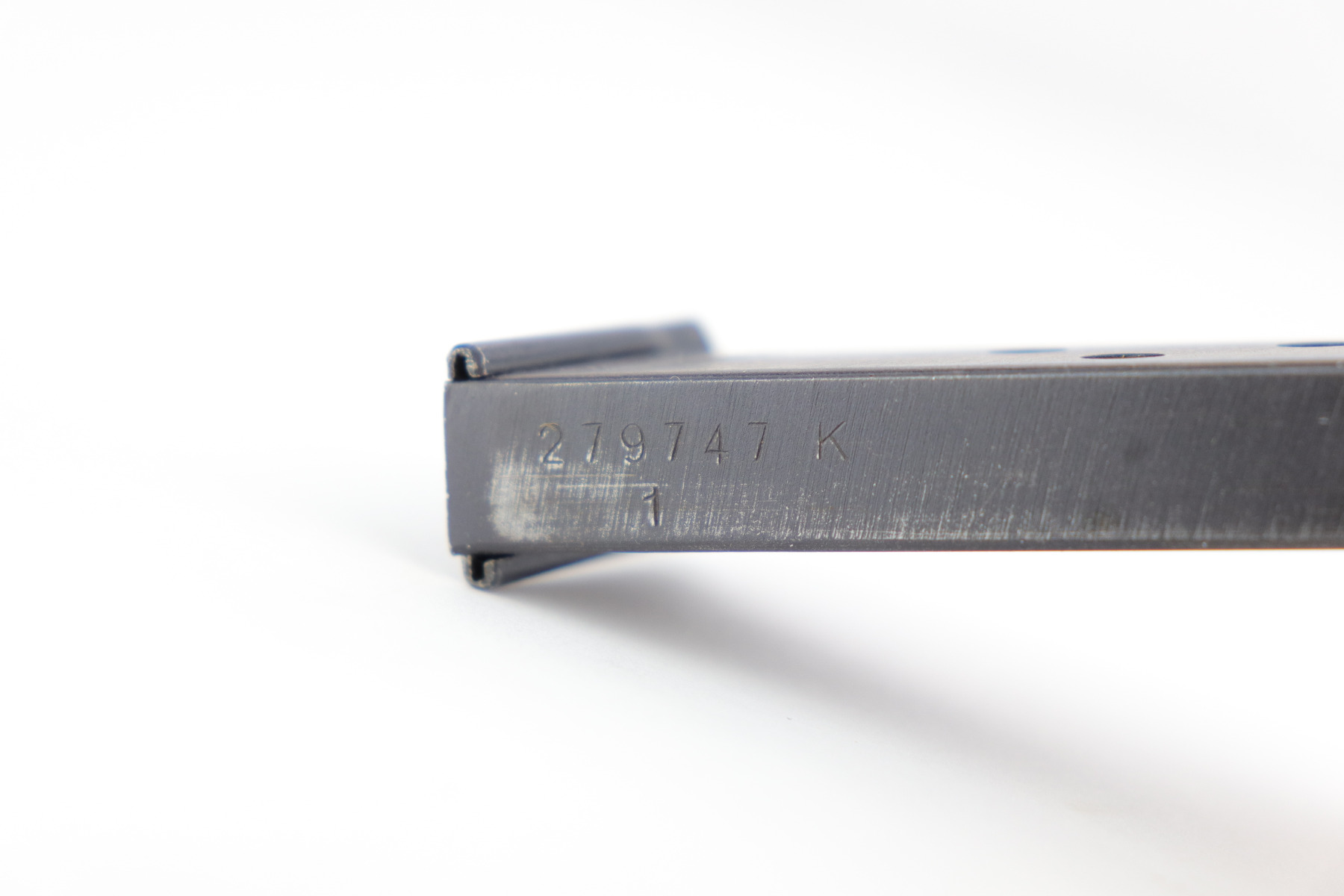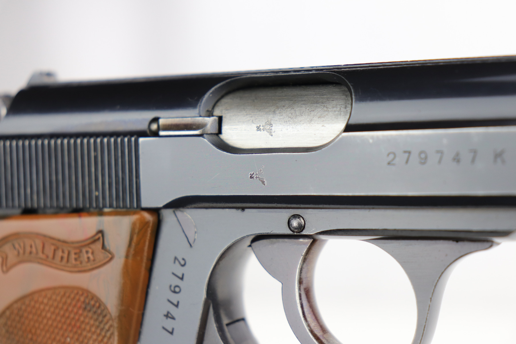 10/29/20 – This is a near-mint example of a scarce SS contract Walther PPK with the original, matching magazine. The gun has 97-98% of the high-polish blue remaining. There’s a bit of standard muzzle wear on each side of the slide, and minor thinning on the front strap. Mint bore and excellent grip with just a minuscule stress crack in the spine. It’s a variation 5 example with serial on slide and spine of magazine.