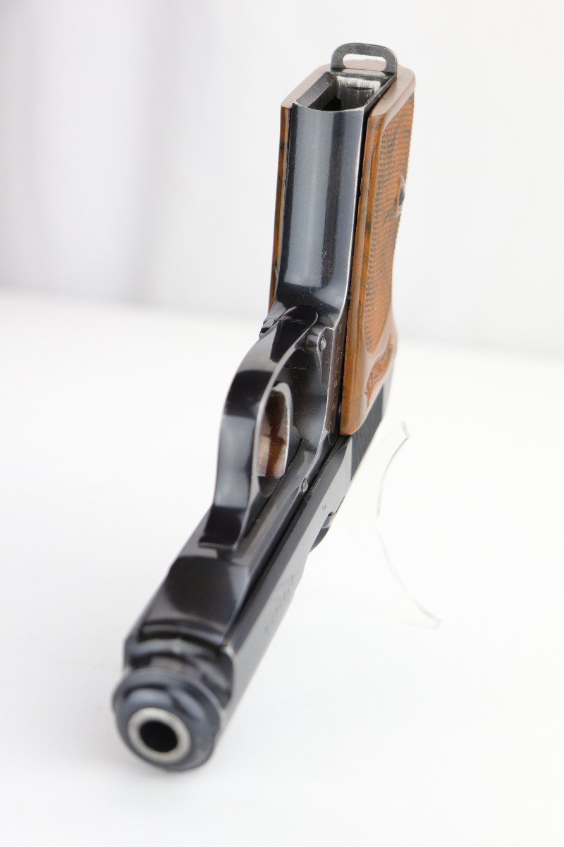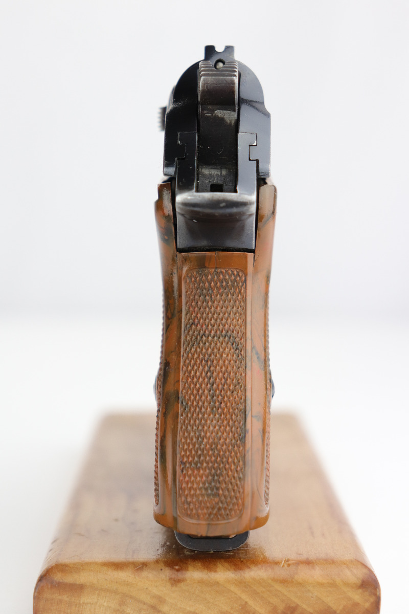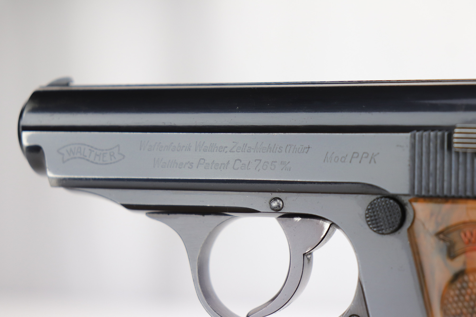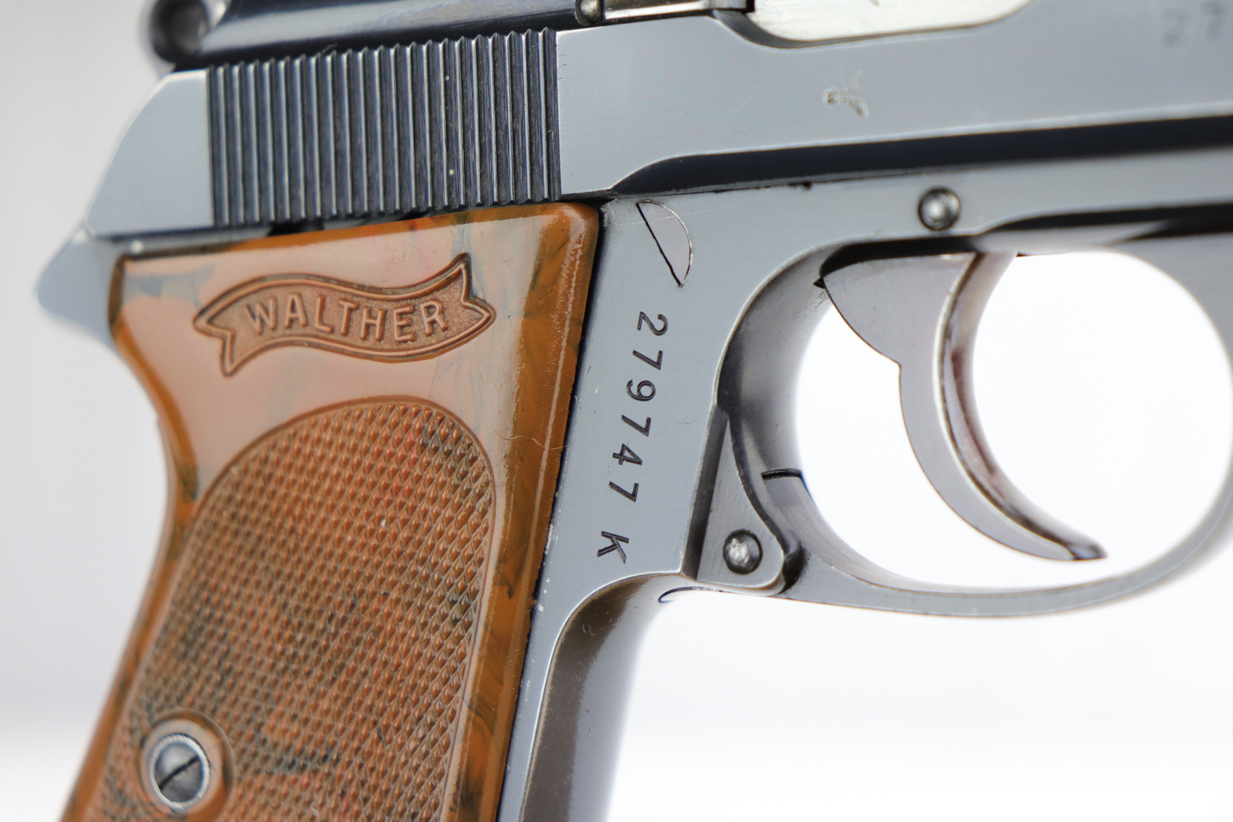 10/29/20 – This is a near-mint example of a scarce SS contract Walther PPK with the original, matching magazine. The gun has 97-98% of the high-polish blue remaining. There’s a bit of standard muzzle wear on each side of the slide, and minor thinning on the front strap. Mint bore and excellent grip with just a minuscule stress crack in the spine. It’s a variation 5 example with serial on slide and spine of magazine.