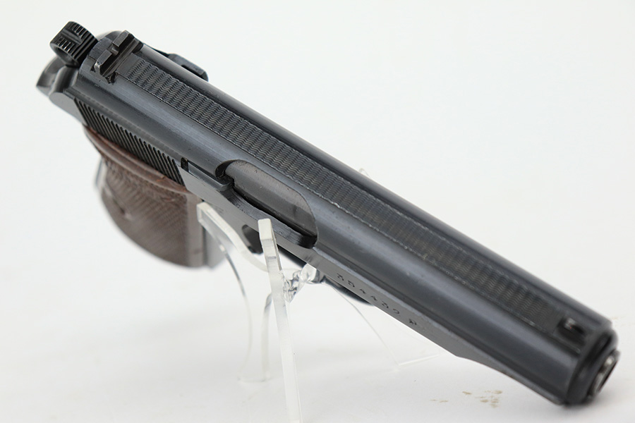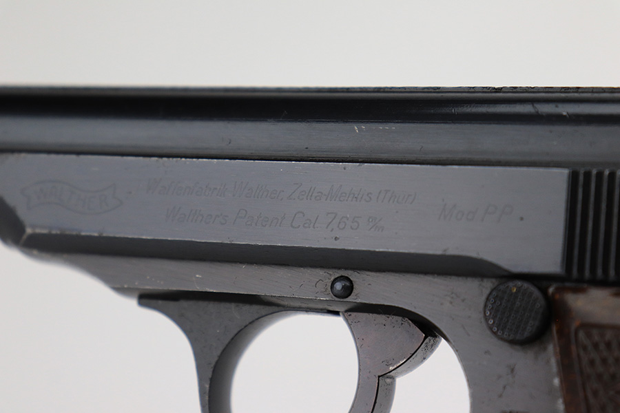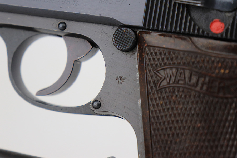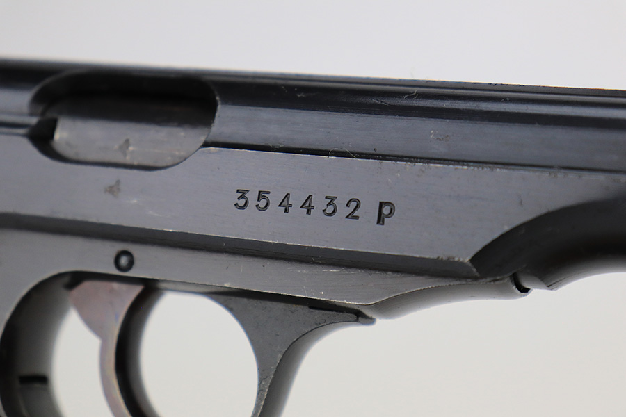 5/30/23 – This is a near-mint example of a scarce late-war Walther PP rig issued to the Nazi police in 1944. It is all matching and has the proper police “Eagle F” proof. This police “Eagle F” variation is scarce as only about 5,000 were made. This gun also comes with scarce reddish bakelite grips. It has retained nearly all of its original finish with some tiny handling marks here and there and an area of very light pin-pricking on the left side of the muzzle. Comes with a Walther banner-only magazine. Stone-mint bore.