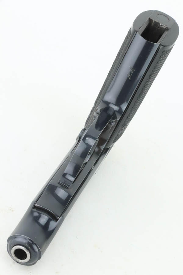8/27/24 – This is a minty example of a scarce Walther PP with RJ marking on front strap to denote issue to the Reich Justice Ministry. There were fewer than 5,000 of this variation produced. This one is matching and has retained nearly all of its original high polish finish with just a hint of muzzle wear and a few tiny surface scratches here and there. Fitted with proper black bakelite grips and comes with one wartime magazine. Minty bore. Comes with a nice modern Walther hard case.