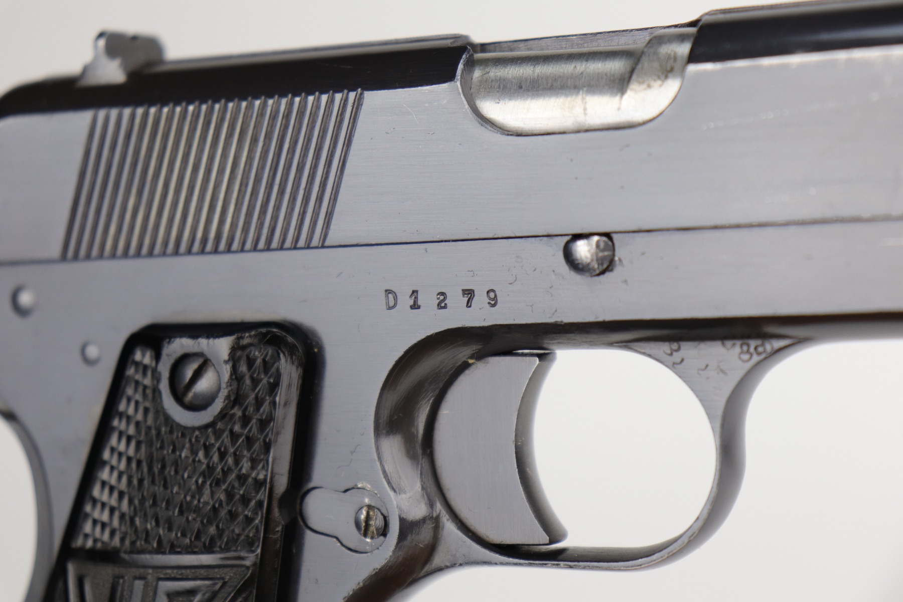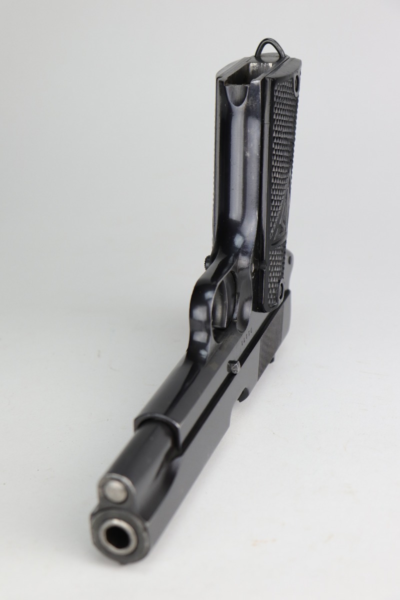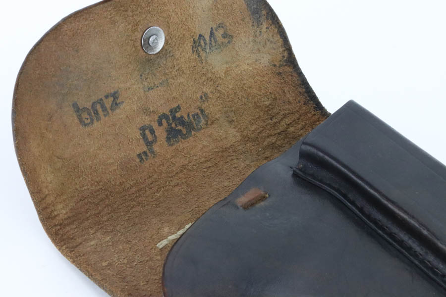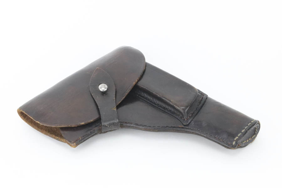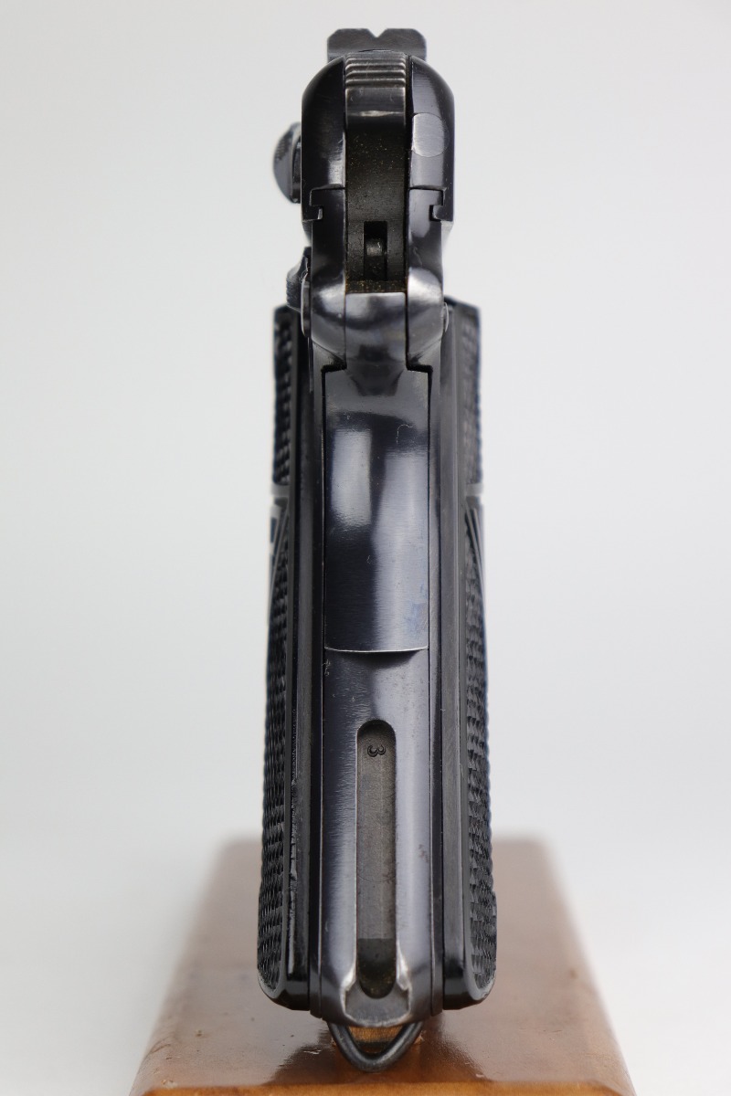 7/18/24 – This is a Radom VIS P35 issued to the Nazi military around 1941. It has fixed sights, a slotted frame, and has the proper “Waffen 77” and “Eagle 623” Nazi acceptance proofs. This particular example is in minty condition, retaining around 98% of its original bluing. There is very minor muzzle wear, wear on some of the high edges of the slide, and a few small spots on the strap. There are a few small dings here and there, most noticeable on the top of the slide. It comes with excellent original grips and one correct magazine. The bore has very strong rifling with minor pin-pricking throughout. Comes with a very nice, original holster with sharp internal inkstamp showing 1943 date and ‘bnz’ maker code.