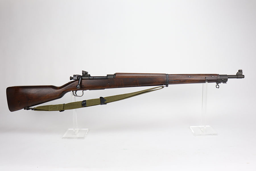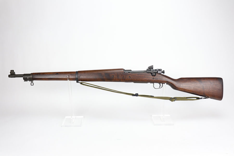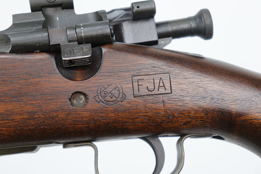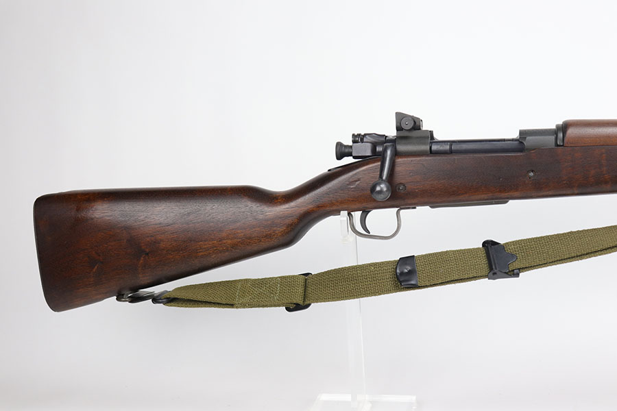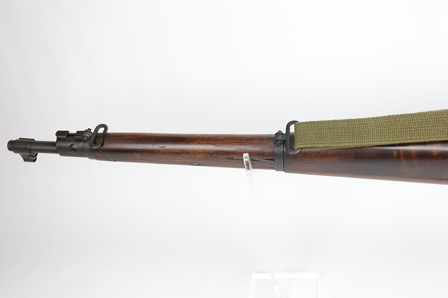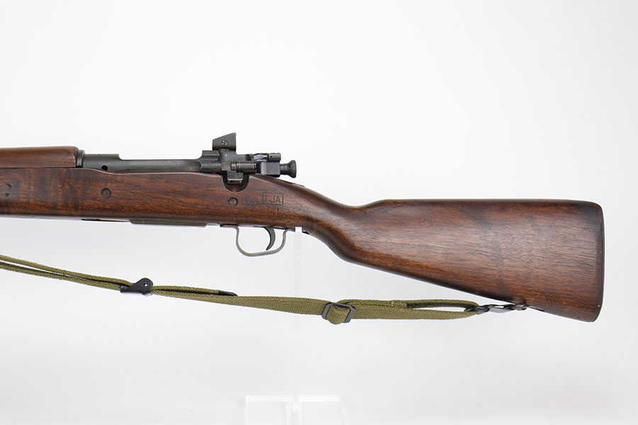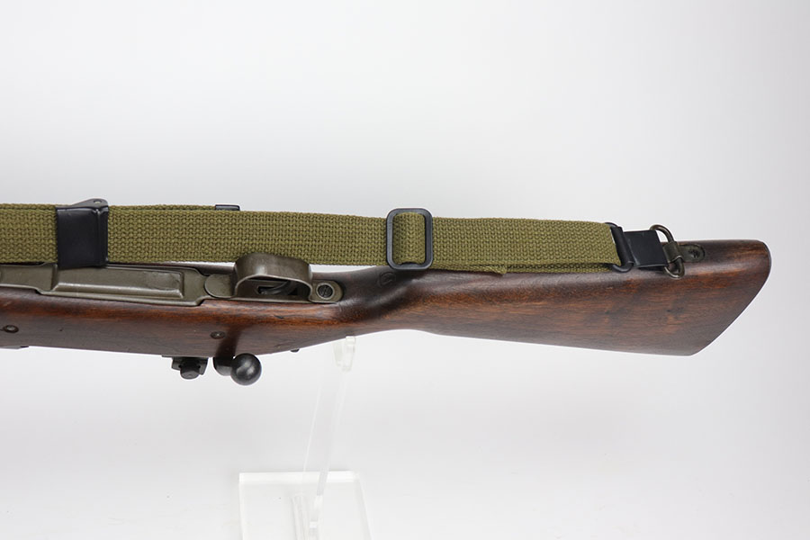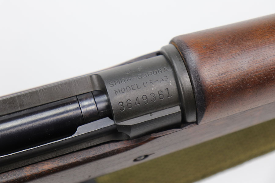 11/11/20 – This is a near-mint example of a Smith Corona 03-A3 rifle from 1943. Barrel is SC marked with date of March, 1943. The finish on the metal parts is terrific, just a bit of patina on the front band and minor thinning on the trigger group. Fantastic stock with sharp inspectors mark (FJA) and crossed cannons cartouche. Minty bore, it hardly looks fired. Comes with canvas shoulder sling.