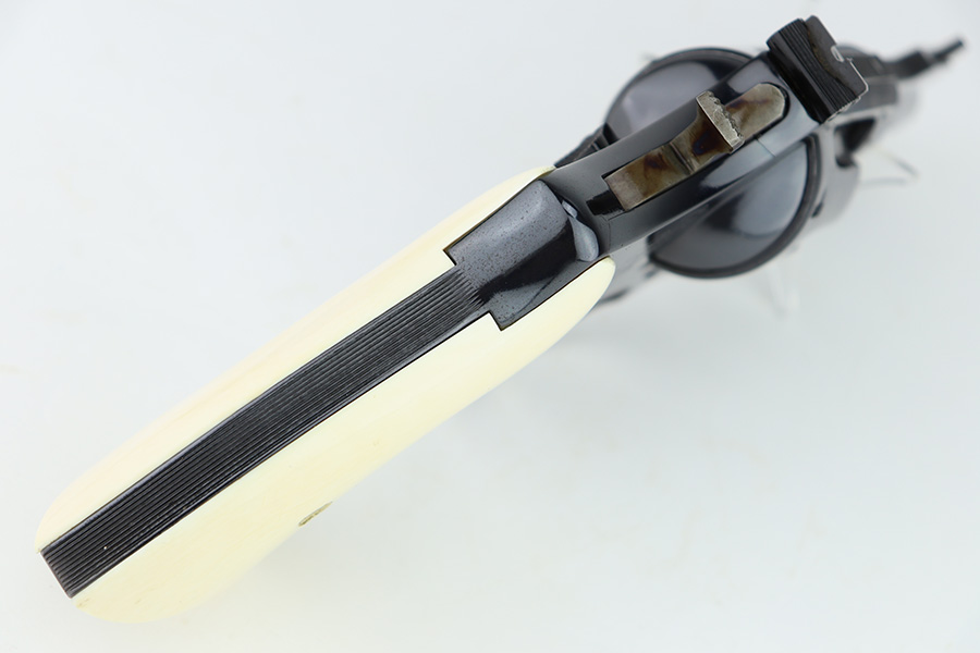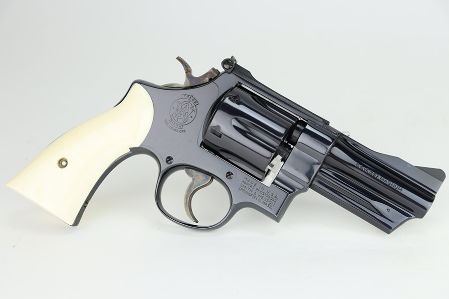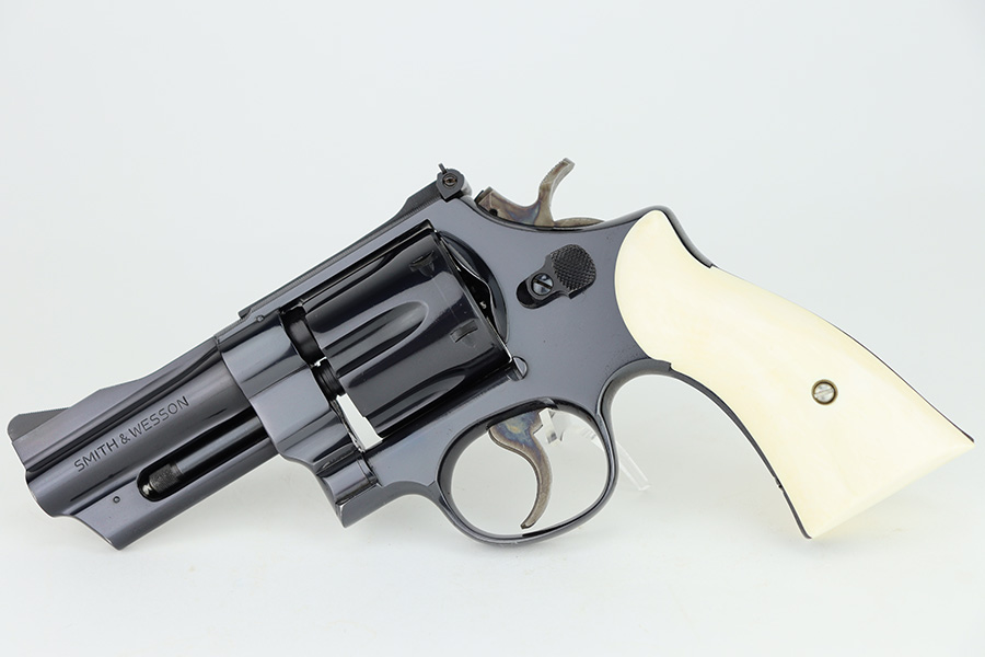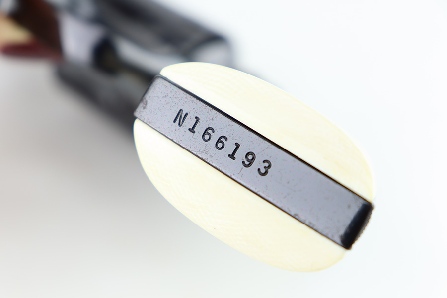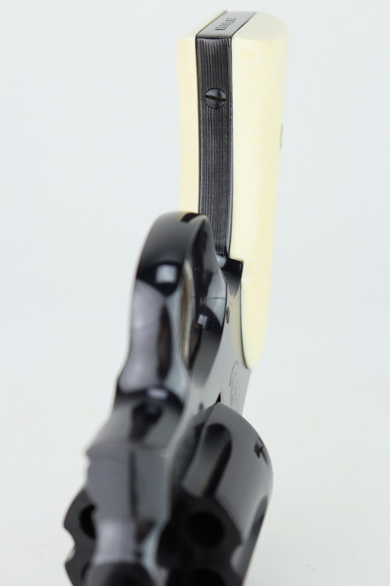11/17/23 – This is a near-mint Smith & Wesson Model 27-2 with ivory grips. 3.5in barrel with minty bore. Serial dates this gun to late 1973 or early 1974. The revolver has 99+% of the original blue remaining, with just a hint of muzzle/high edge wear and a light turn line on the cylinder. Beautiful case hardened hammer and trigger.