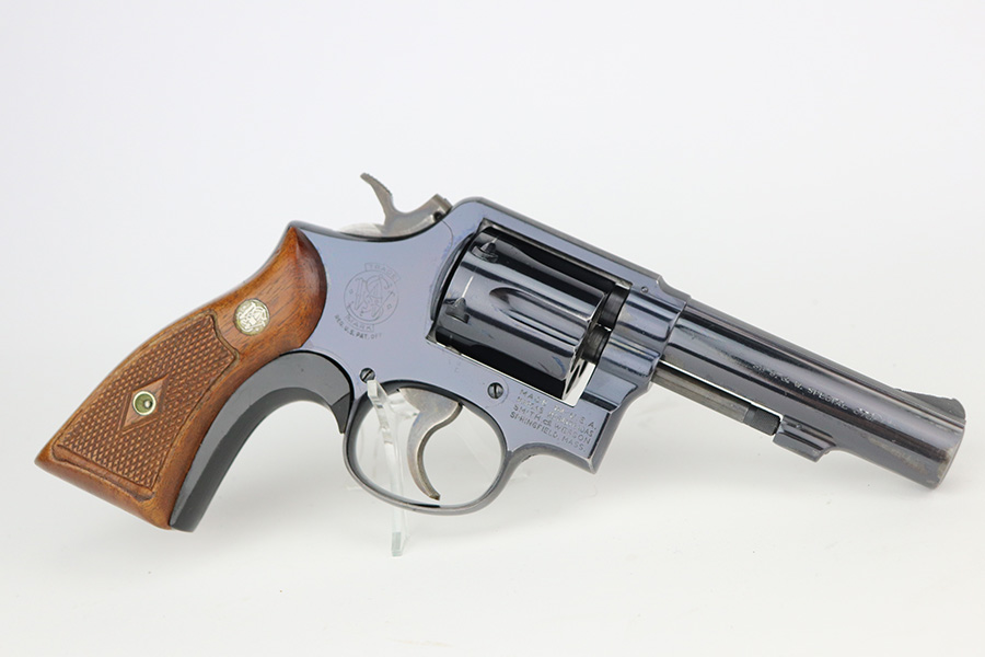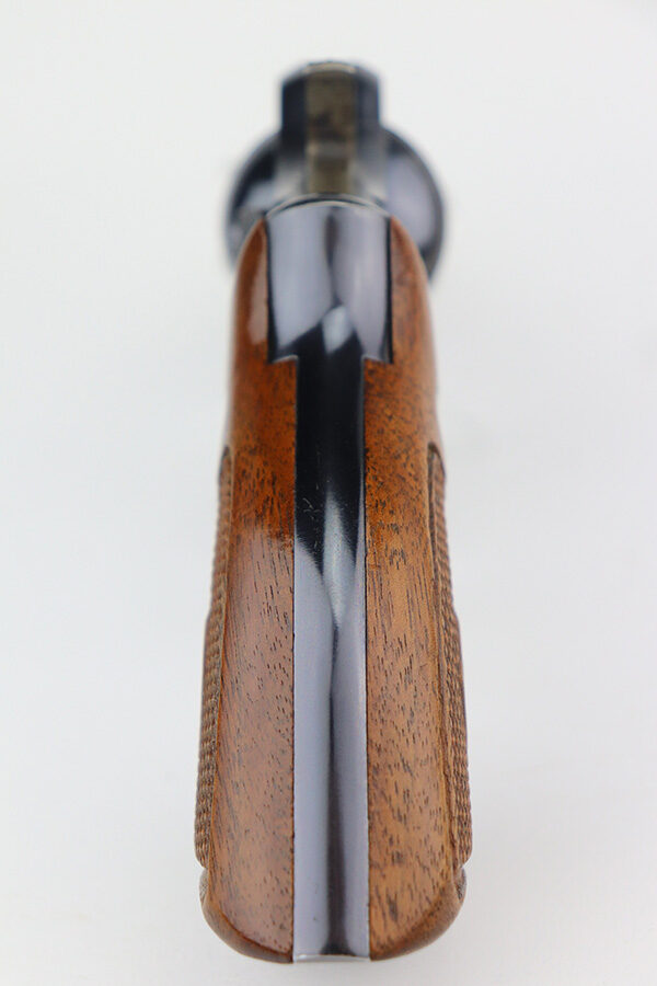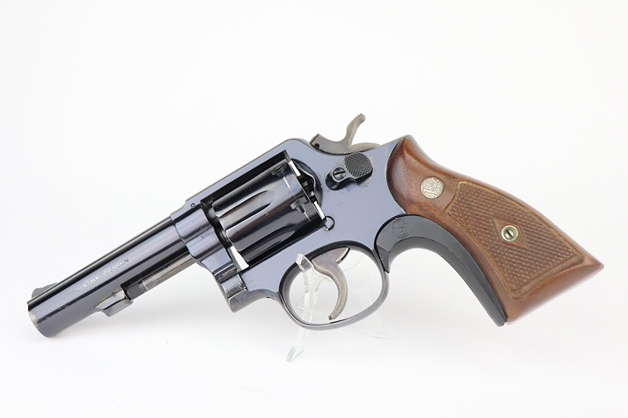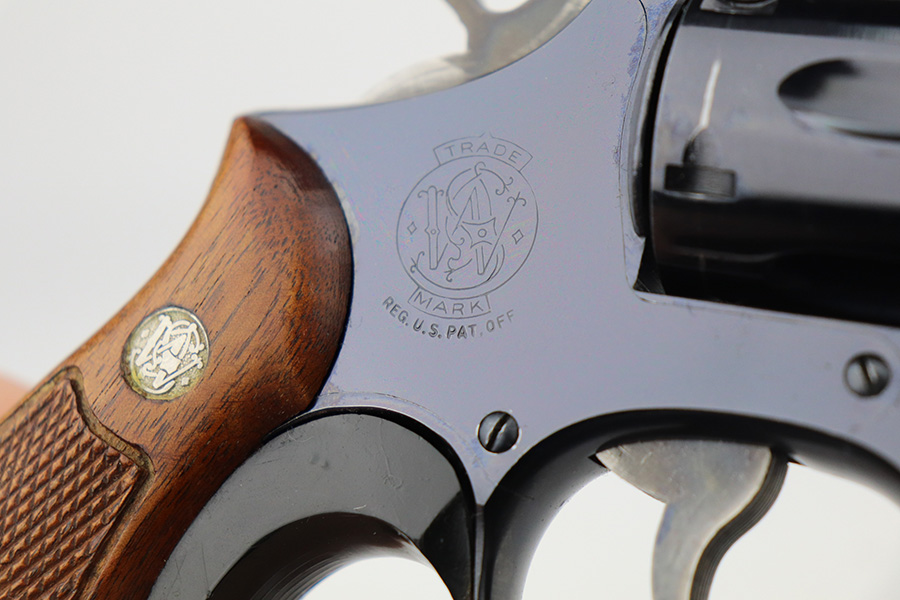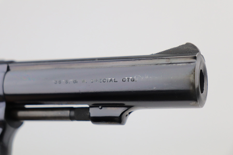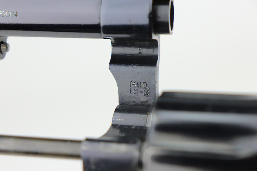6/23/21 – This is a minty example of a Smith & Wesson Model 10-3 Revolver, manufactured in 1961-62. 4″ barrel, chambered in .38 S&W Special. It has retained about 97-98% of its original finish. Minor wear around the muzzle, high edges of the cylinder, and a very light roll mark on the cylinder. The cylinder is tight and the action is smooth. Comes excellent wood grips and a S&W black grip extension. Mint bore.
