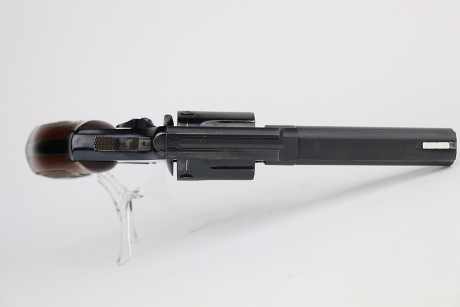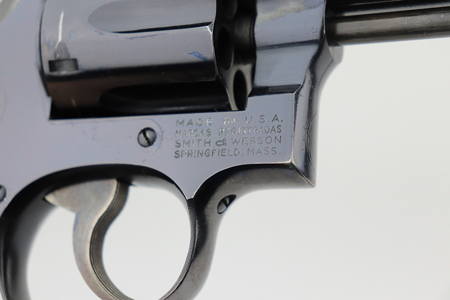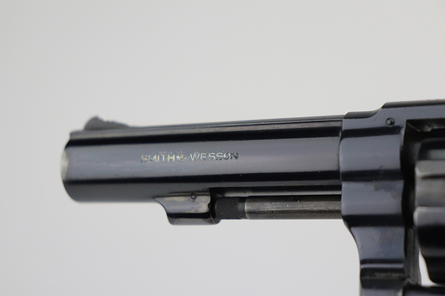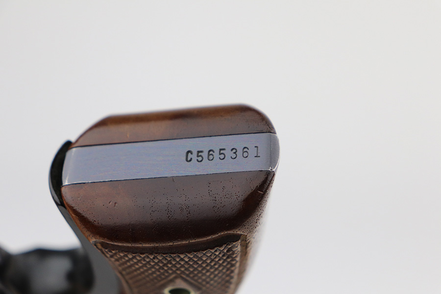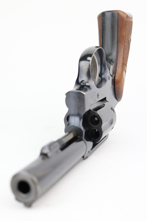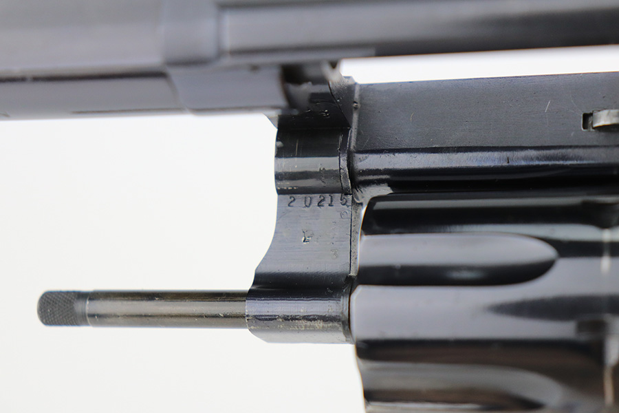 6/23/21 – This is a minty example of a Smith & Wesson Model 10-3 Revolver, manufactured in 1961-62. 4″ barrel, chambered in .38 S&W Special. It has retained about 97-98% of its original finish. Minor wear around the muzzle, high edges of the cylinder, and a very light roll mark on the cylinder. The cylinder is tight and the action is smooth. Comes excellent wood grips and a S&W black grip extension. Mint bore.