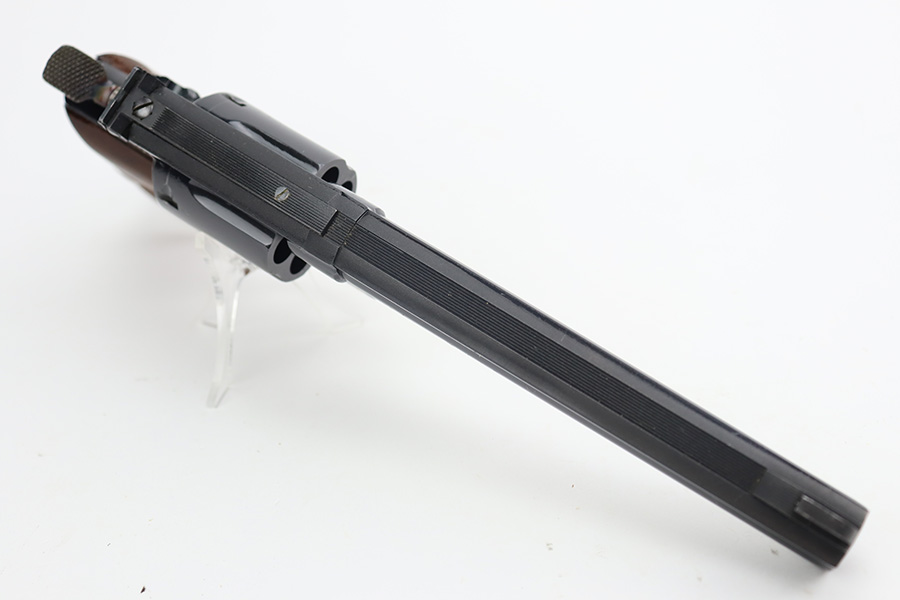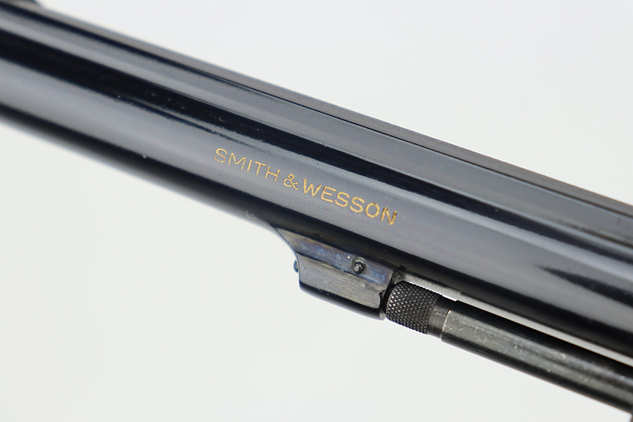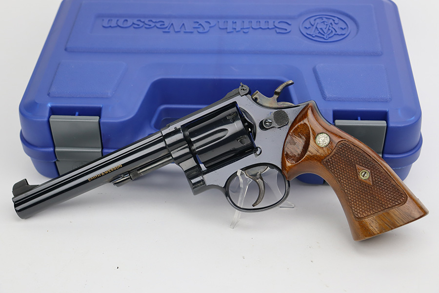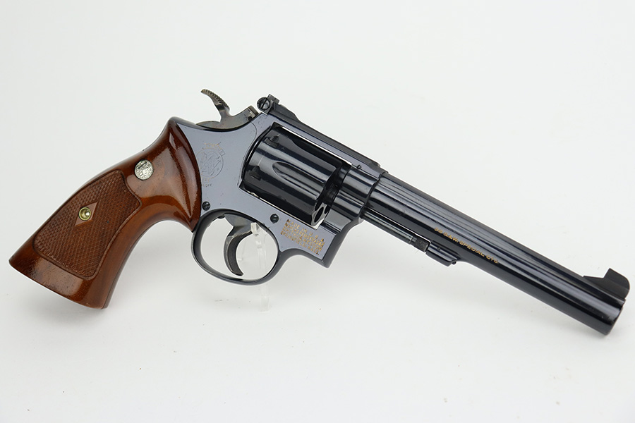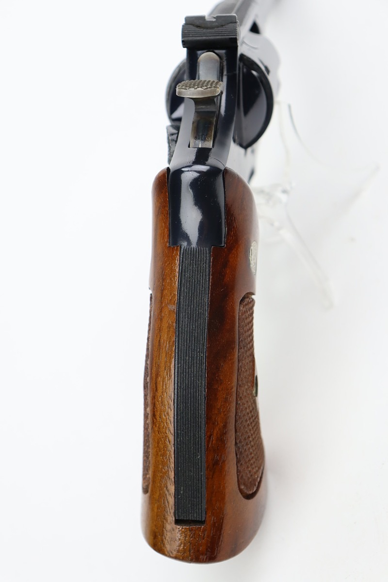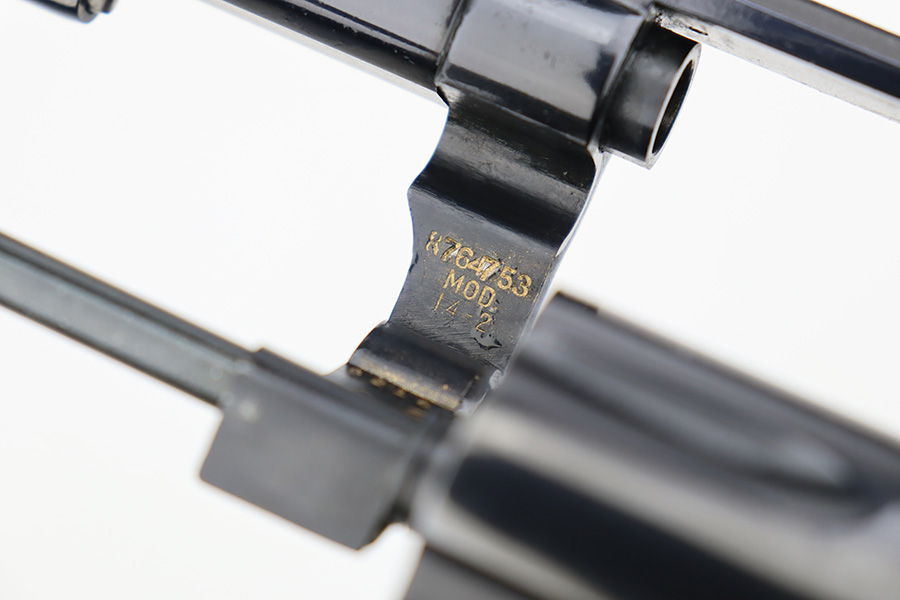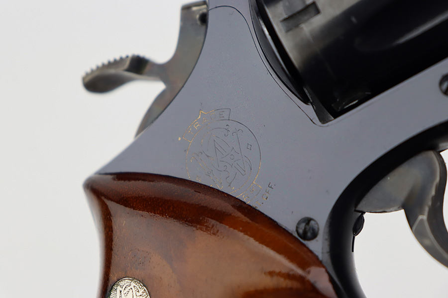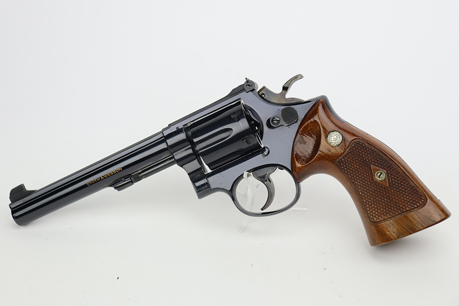 3/19/24 – This is a minty Smith and Wesson Model 14-2, manufactured in 1965, chambered in .38 Special, and featuring a 6″ barrel. It has retained virtually all of its original finish, with almost no wear on the metal besides for a faint turn line on the cylinder. Bore is mint. Grips are unnumbered but in excellent condition, with just a small handling mark on the top of the left grip panel. Has the S&W factory single action internal trigger stop. Very nice case-hardening on the trigger and hammer. Comes with a S&W box, but it is not the original.