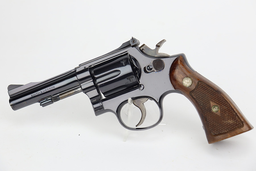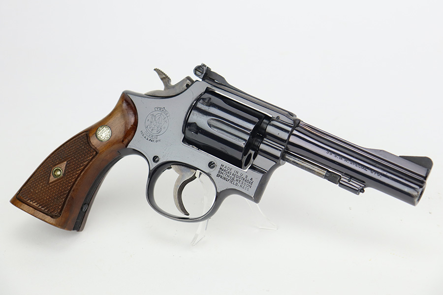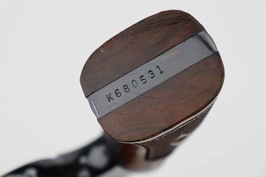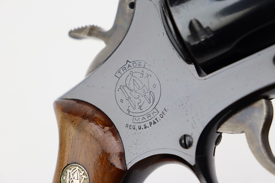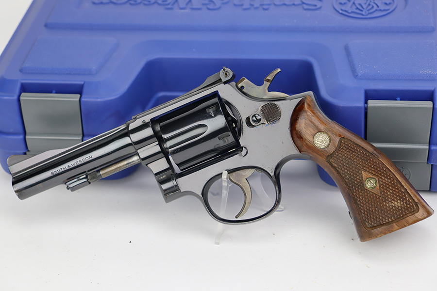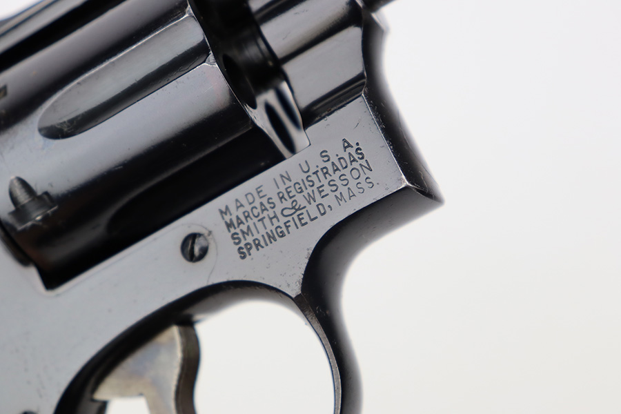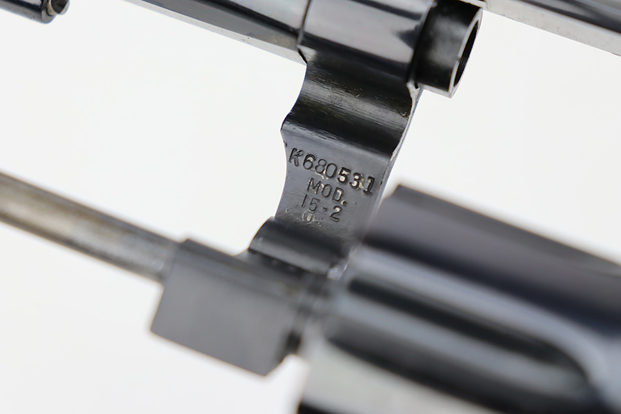 8/22/23 – This is a minty Smith and Wesson Model 15-2, manufactured in 1966, chambered in .38 Special, and featuring a 4″ barrel. It is retained about 98% of its original finish, with most of the wear concentrated along the ejector rod, at the bottom of the trigger guard, and in a couple of the grooves at the front left of the frame. There is also some minor muzzle wear, a feint turn line on the cylinder, and some light freckling on the right side of the frame. Beautiful case-hardening on the trigger and hammer. Minty bore. Comes with an excellent set of original wood grips, with right panel correctly numbered to this gun. No chips or cracks, and sharp checkering aside from being slightly shaved in a small area on the left panel. Also comes with a S&W box, though it’s not the original or serialized to the gun.