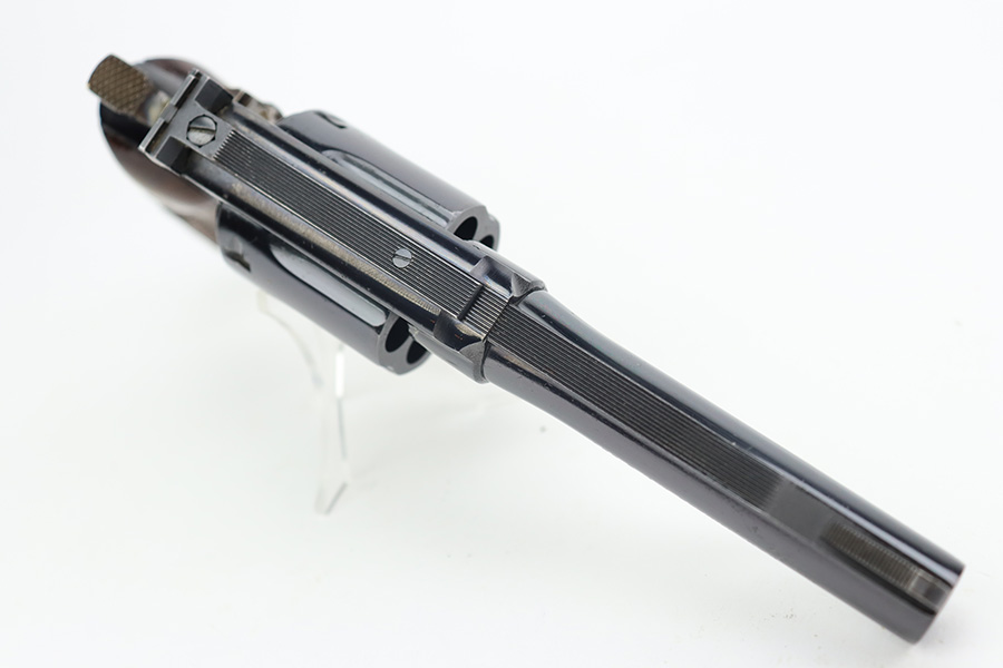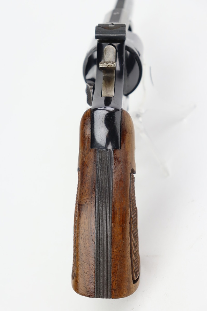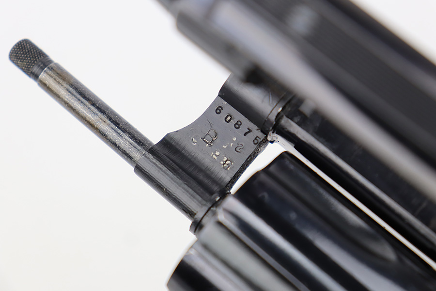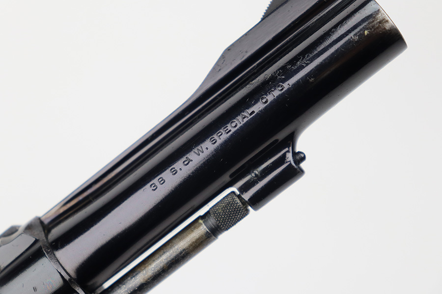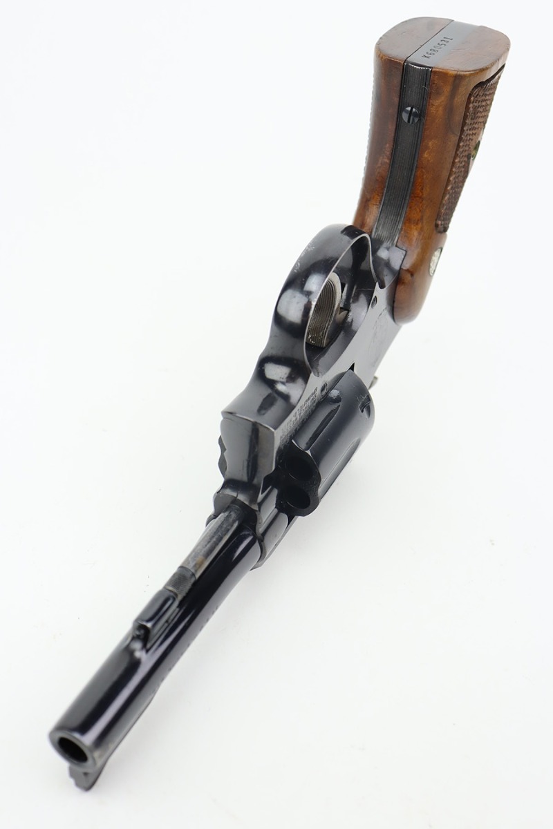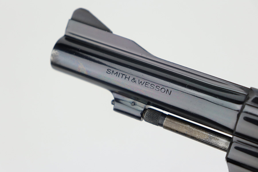 8/22/23 – This is a minty Smith and Wesson Model 15-2, manufactured in 1966, chambered in .38 Special, and featuring a 4″ barrel. It is retained about 98% of its original finish, with most of the wear concentrated along the ejector rod, at the bottom of the trigger guard, and in a couple of the grooves at the front left of the frame. There is also some minor muzzle wear, a feint turn line on the cylinder, and some light freckling on the right side of the frame. Beautiful case-hardening on the trigger and hammer. Minty bore. Comes with an excellent set of original wood grips, with right panel correctly numbered to this gun. No chips or cracks, and sharp checkering aside from being slightly shaved in a small area on the left panel. Also comes with a S&W box, though it’s not the original or serialized to the gun.