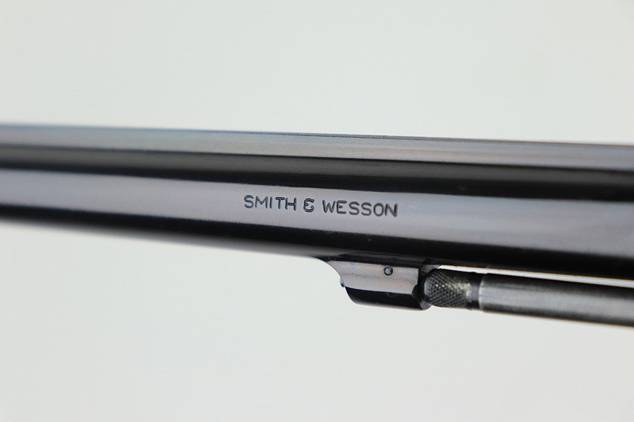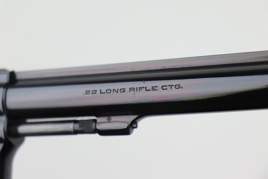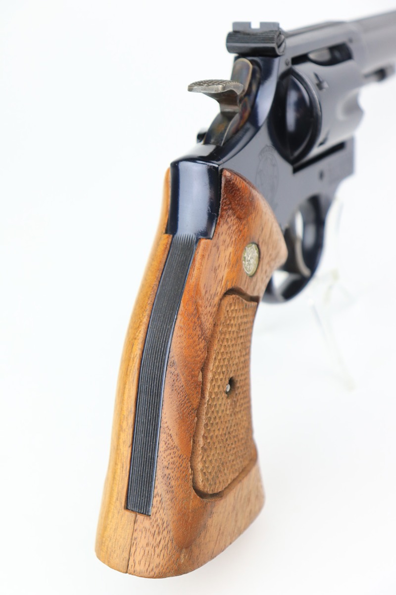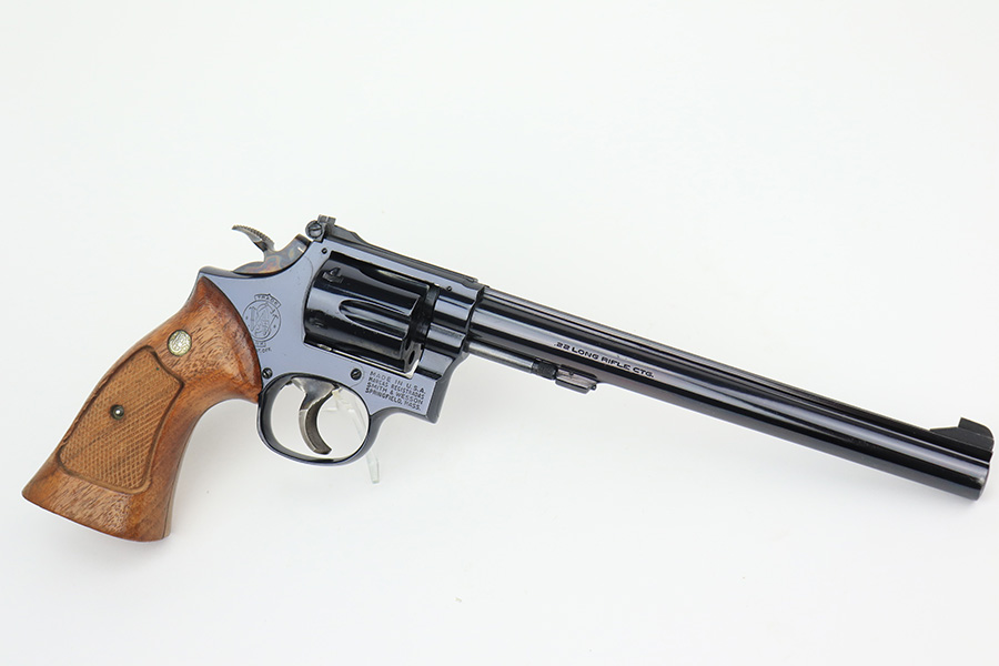 3/28/22 – This is a beautiful, near-mint example of a Smith & Wesson Model 17-3 revolver manufactured in 1975. It is all matching, chambered in .22 LR, and has a scarce 8 3/8 inch barrel. The cylinder is tight, and the action is very smooth. It has retained nearly all of its original high polish finish. There is very minor wear around the muzzle, a few very light scratches along the barrel, and barely a hint of a roll mark on the cylinder. Beautiful case-hardening on the small parts. Comes with excellent wood grips – just a few tiny bruises on the bottom edges. Mint bore.