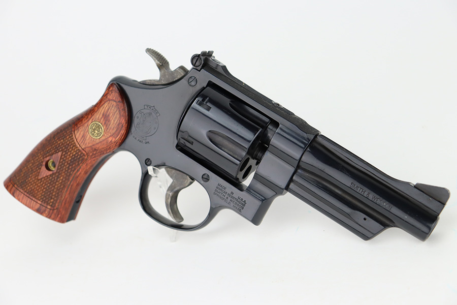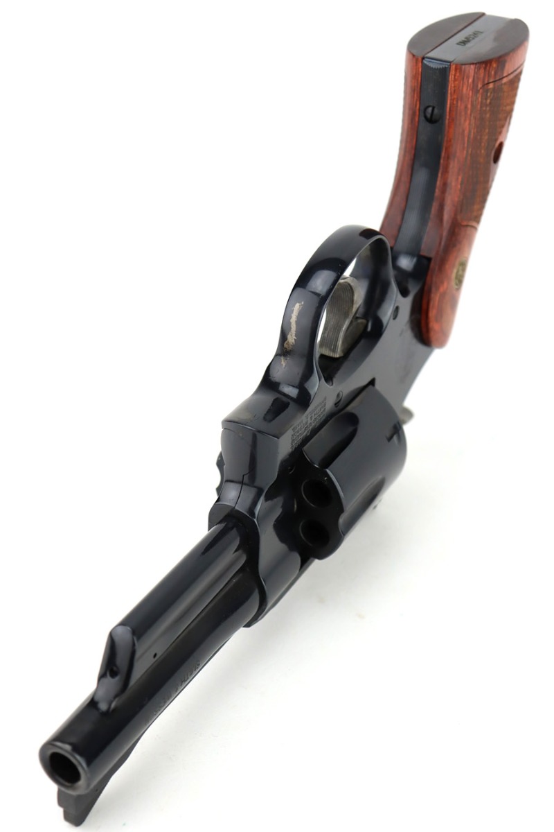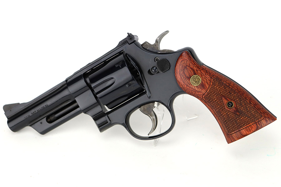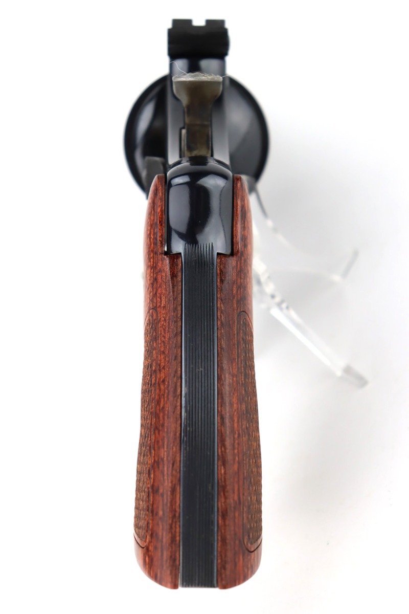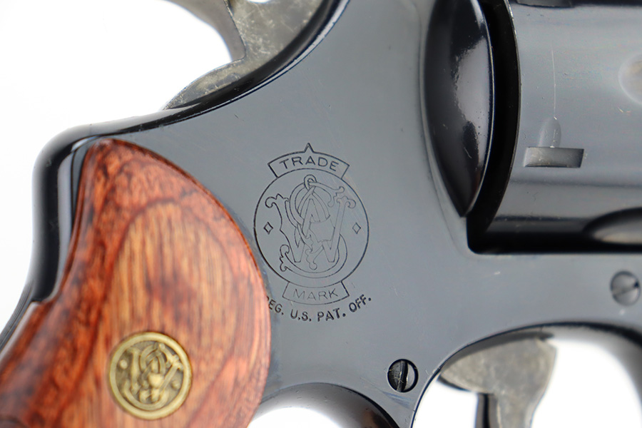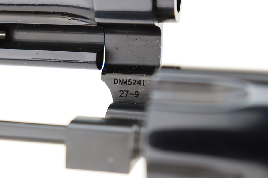 12/14/23 – This is a near-mint example of a Smith & Wesson Model 27-9, chambered in .357 Magnum. 4″ barrel. The original high polish finish rates about 98% with just one small spot of wear on the underside of the trigger guard. Just a hint of a roll mark on the cylinder. Fitted with beautiful checkered wood grips. Mint bore.